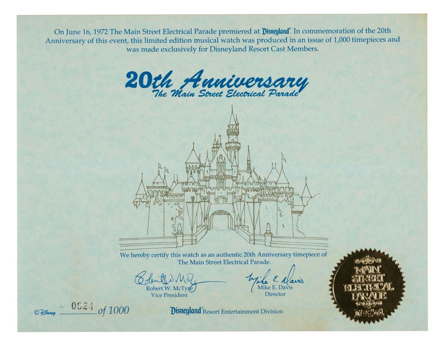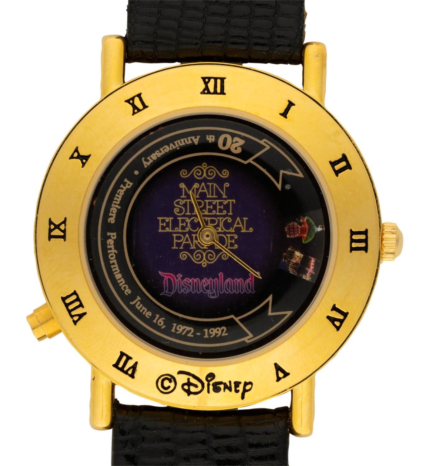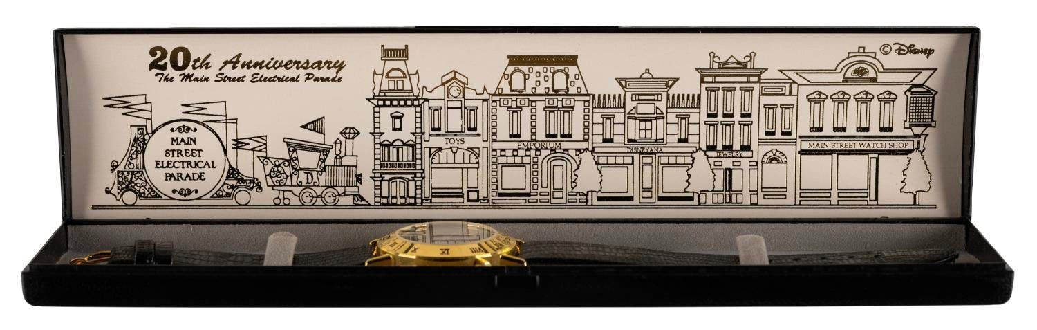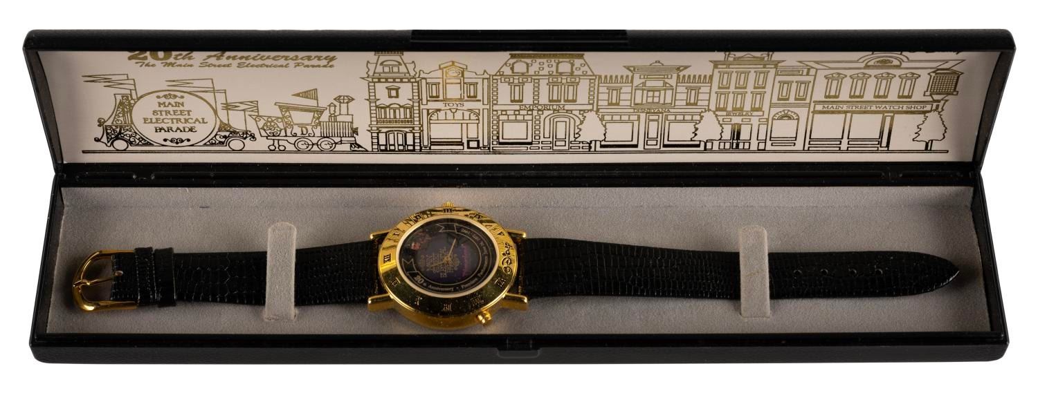 (Disneyland, 1992) A Cast Member exclusive wristwatch commemorating the 20th anniversary of the legendary Main St. Electrical Parade. Measuring 9" in length, the wristwatch is in fine condition.