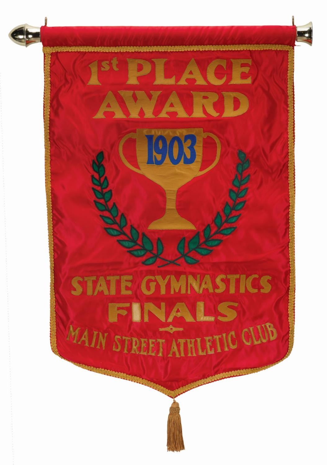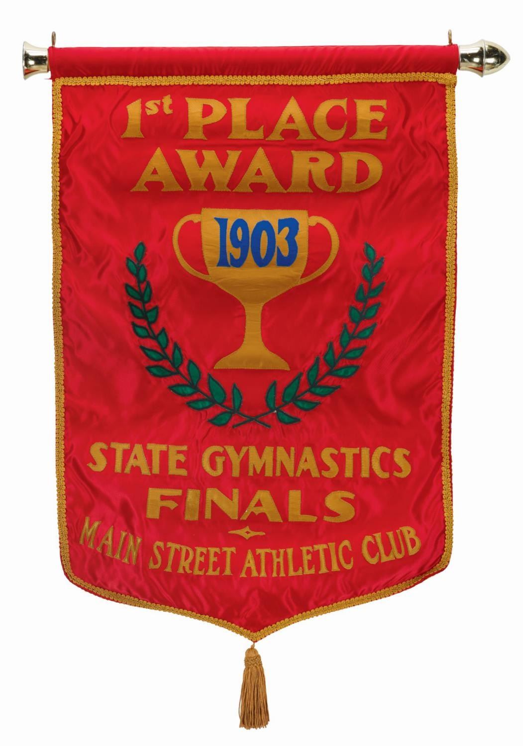 (Walt Disney World, 1995) A prop banner from the Main Street Athletic Club store at Walt Disney World. The double-sided satin banner features a curtain rod for hanging and embroidered decorations declaring "1st Place Award, 1903 Gymnastics Finals." Measuring 20" x 33", the banner is in very good condition with minimal soiling, fraying and edge wear, and a missing finial at one end of the curtain rod.