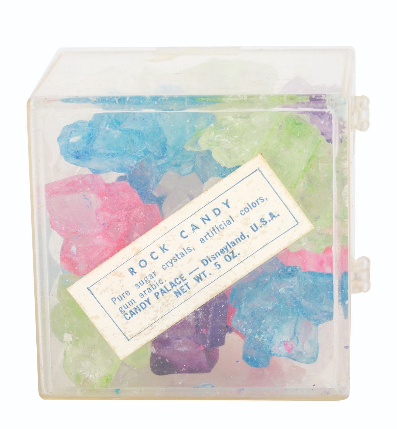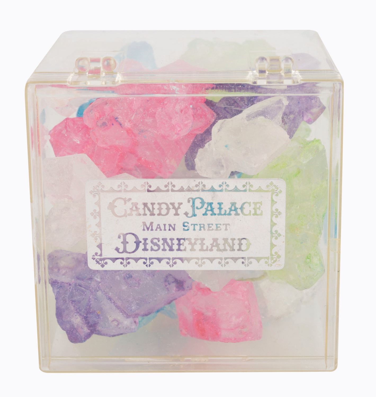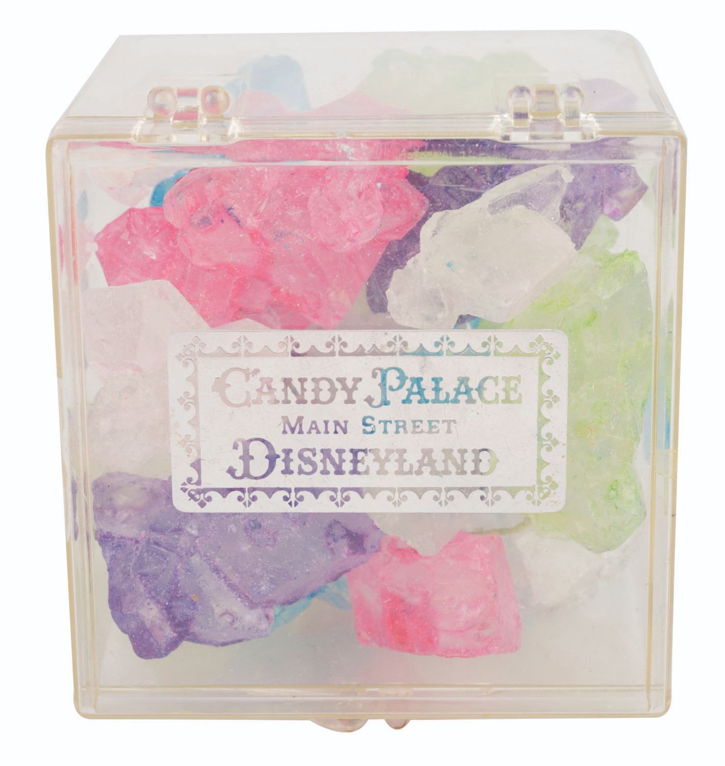 (Disneyland, 1960s-80s) A Candy Palace Rock Candy Box from Main Street U.S.A. at Disneyland. The candy is not intended for consumption but for display and collecting purposes only. Measuring 3” x 2.75” and 2.5” deep, the box is in very good condition with minor scuffs and retains rock candy inside.