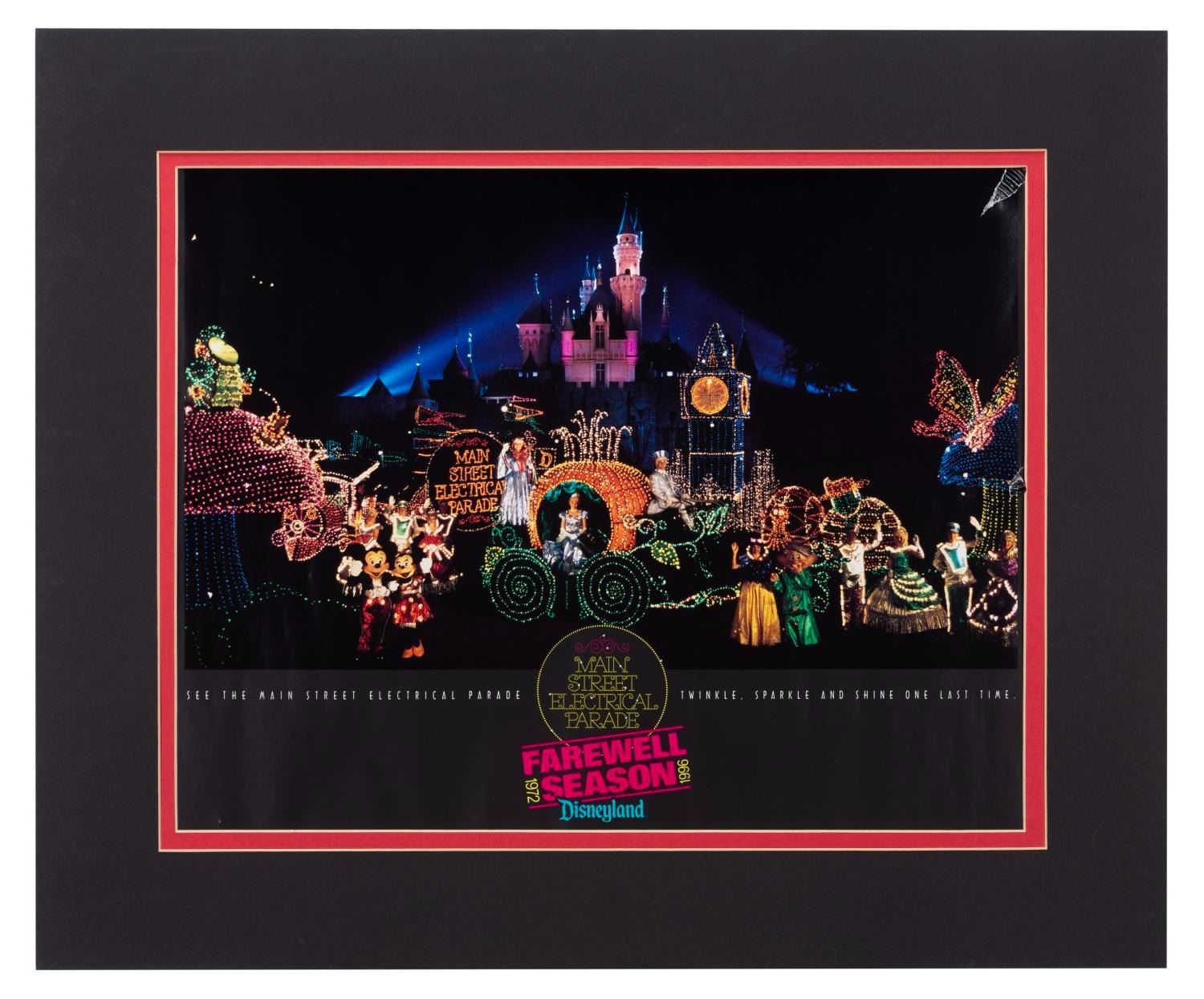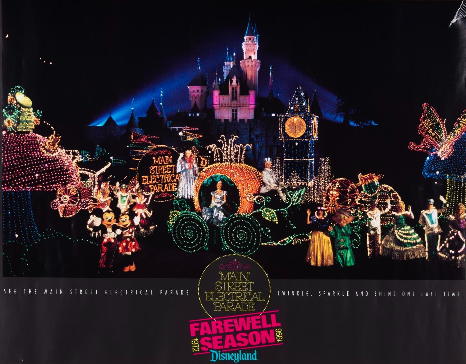 (Disneyland, 1996) A poster promoting the Main Street Electrical Parade’s Farewell Season in 1996. Measuring 17” x 19” with a 20” x 24” matte, the poster is in fair condition with two tears at the top and center of the right edge.