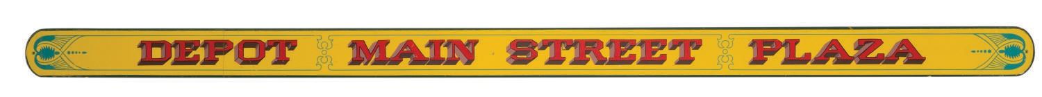 (Disneyland, 1990s) A sign from the side of a horse-drawn trolley on Main Street at Disneyland. Constructed of wood, the enormous sign is coated in a weatherproof enamel and features stenciled lettering listing the stops on the route, "Depot – Main Street – Plaza," with Art Deco design accents. The trolley is a fixture of Main Street and a major contributor toward the land's turn-of-the-20th-century theming, a time when the internal combustion engine was still in its infancy. Measuring an impressive 112"x5.5" and 0.75" deep, the sign is remarkably well preserved and in very good condition considering its tour of outdoor use. This is a chance to own an instantly recognizable piece of Disneyland's Main Street seen by every generation of guest to visit the park since it opened in 1955. This item may require special shipping arrangements, please inquire before bidding.
