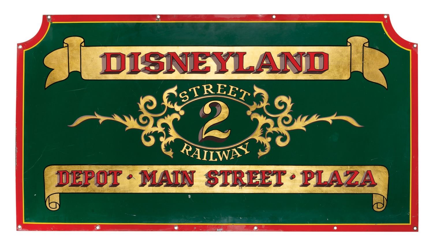 (Disneyland, 1980s) An incredible 54"x29" heavy painted steel panel from Main Street Horse Drawn Trolley No.2 at Disneyland. Panels of this style were crafted by the Disneyland Pictorial Department, affixed to the front and rear of the car, and later removed during a rehabilitation of the vehicle. Measuring 54"x29", the hand-painted heavy steel panel is in good condition with scuffs and scratches, a few dents and areas of oxidation, and wear from Park use and handling.