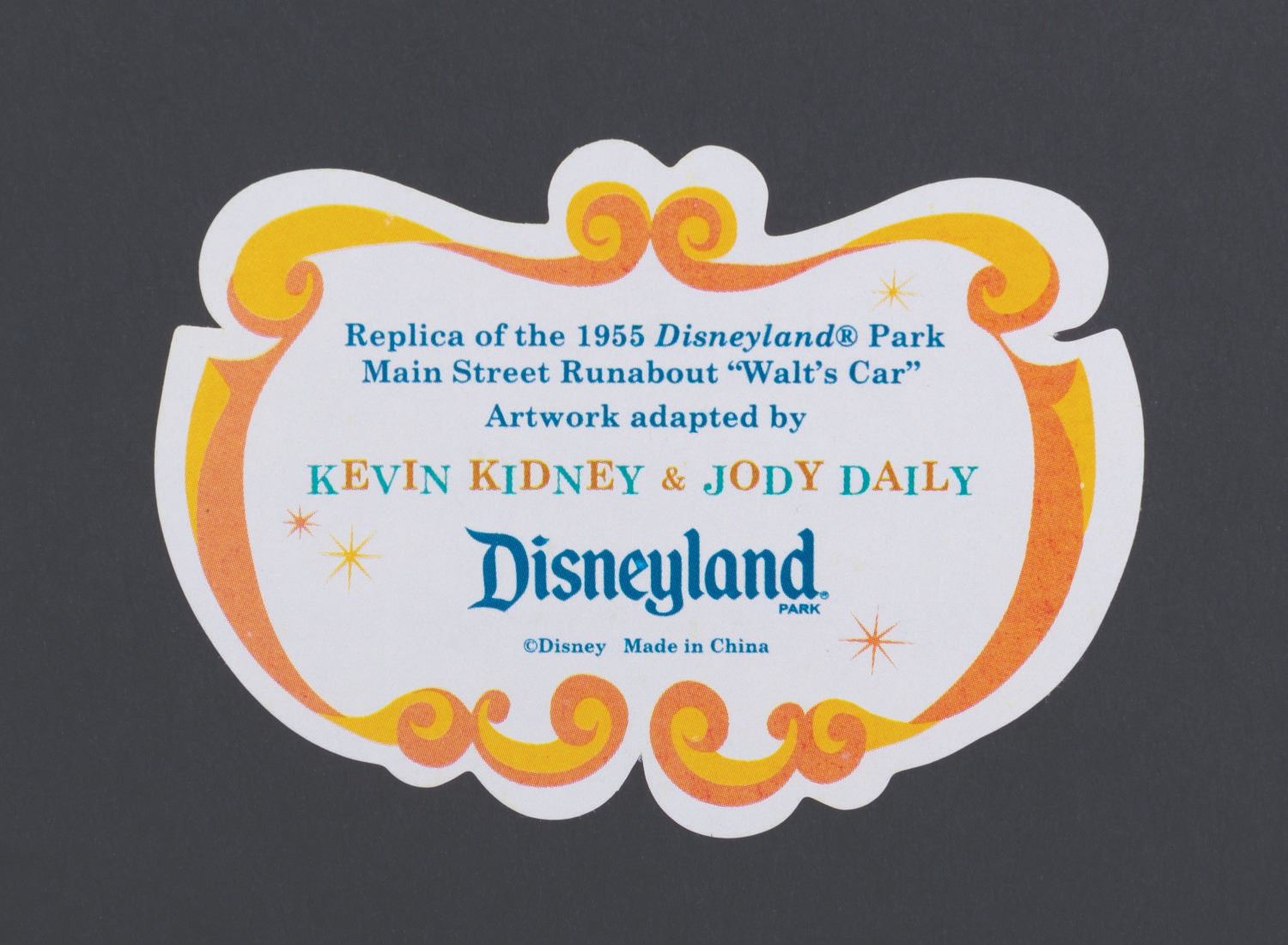 (Disneyland, 2010) A Main Street Runabout "Walt's Car" Replica. The replica was designed by Kevin Kidney and Jody Daily, limited to an edition of 500, and issued in honor of Disneyland's 55th anniversary. Measuring 5.75"x6.25"x4", the piece is in fine condition and comes with its original good condition box. The box has splits and wear to its panels throughout.
