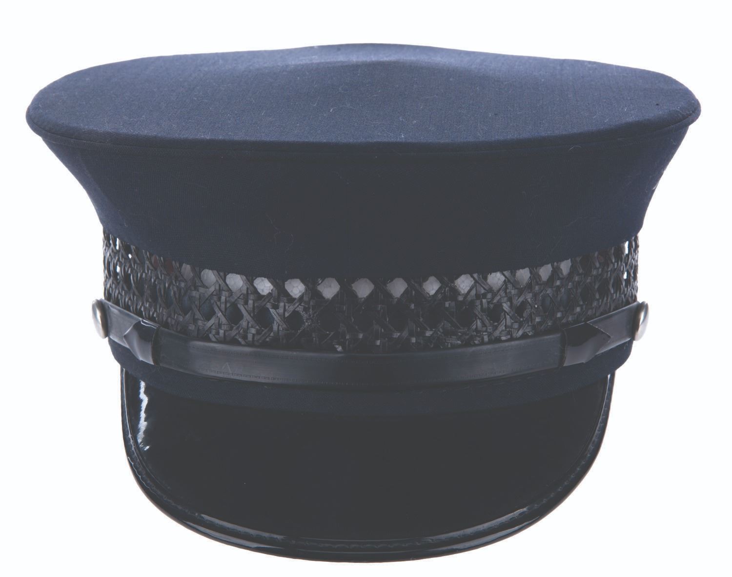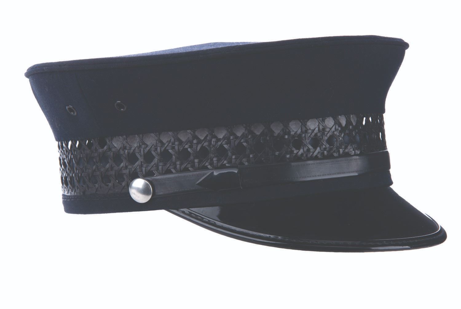 (Disneyland, 2000s) A Main Street Transportation Cast Member Hat. This hat is of the style worn by Main Street Transportation Company Hosts and Hostesses of the Disneyland Horseless Carriages, Fire Engine, Omnibus, and Railroad Main Street Station. Measuring 7.5", this costume hat is manufactured by Midway Cap, and is in good condition with wear to its elements from Park-use.