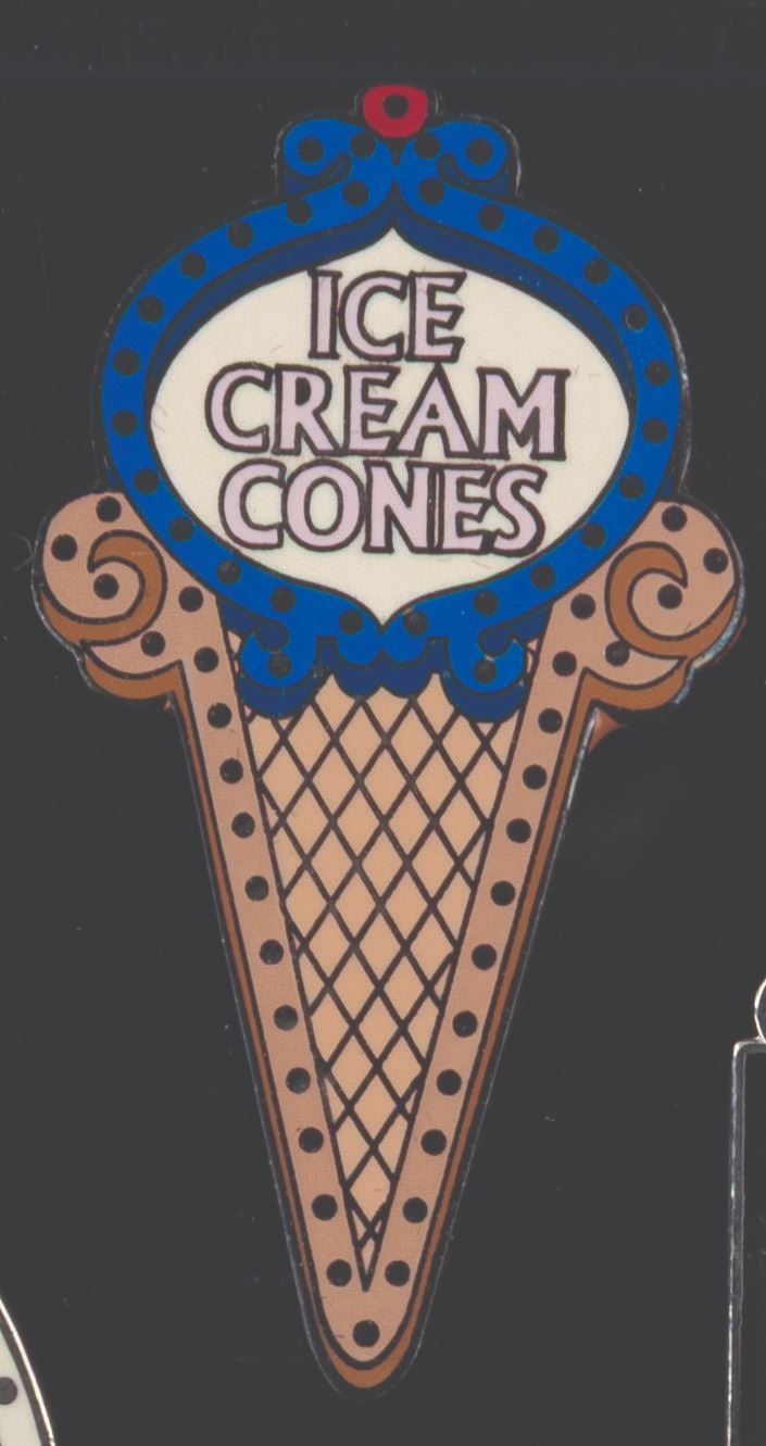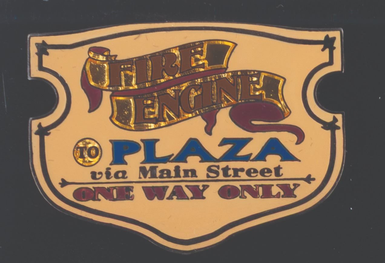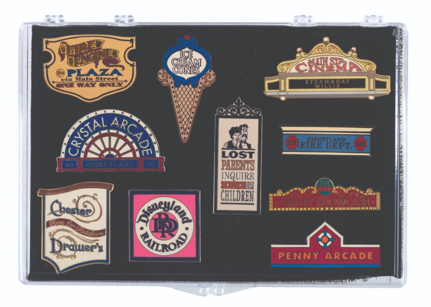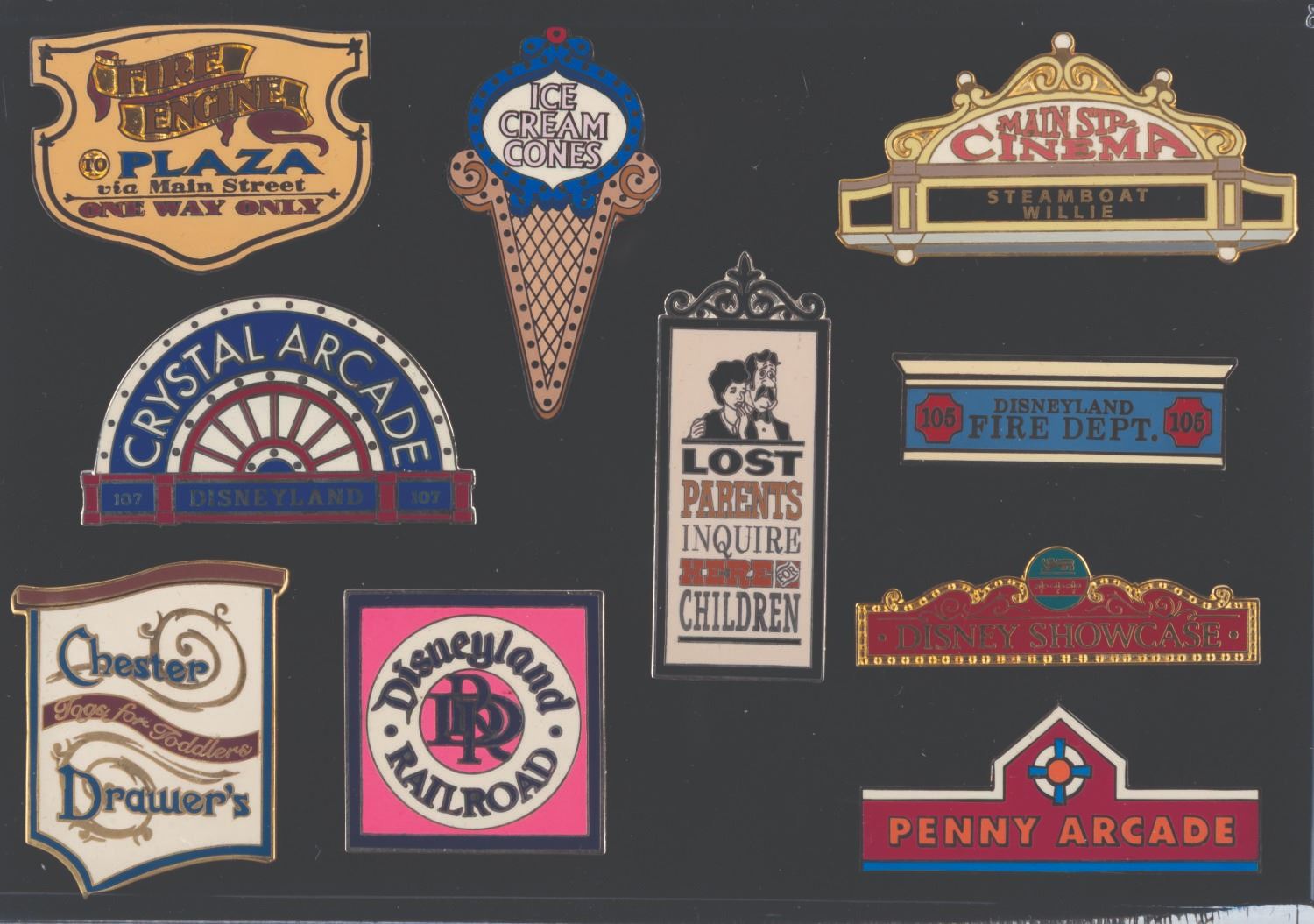 (Disneyland, 2001) A 10-piece pin set inspired by the signs of Disneyland’s Main Street, U.S.A. Measuring between 0.5” x 1.25” and 1” x 2”, the pins are in fine condition.