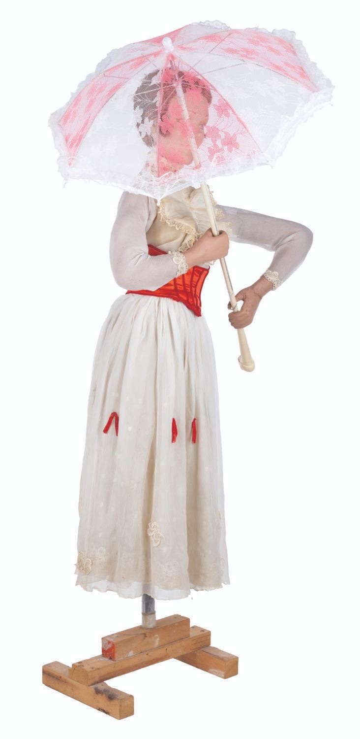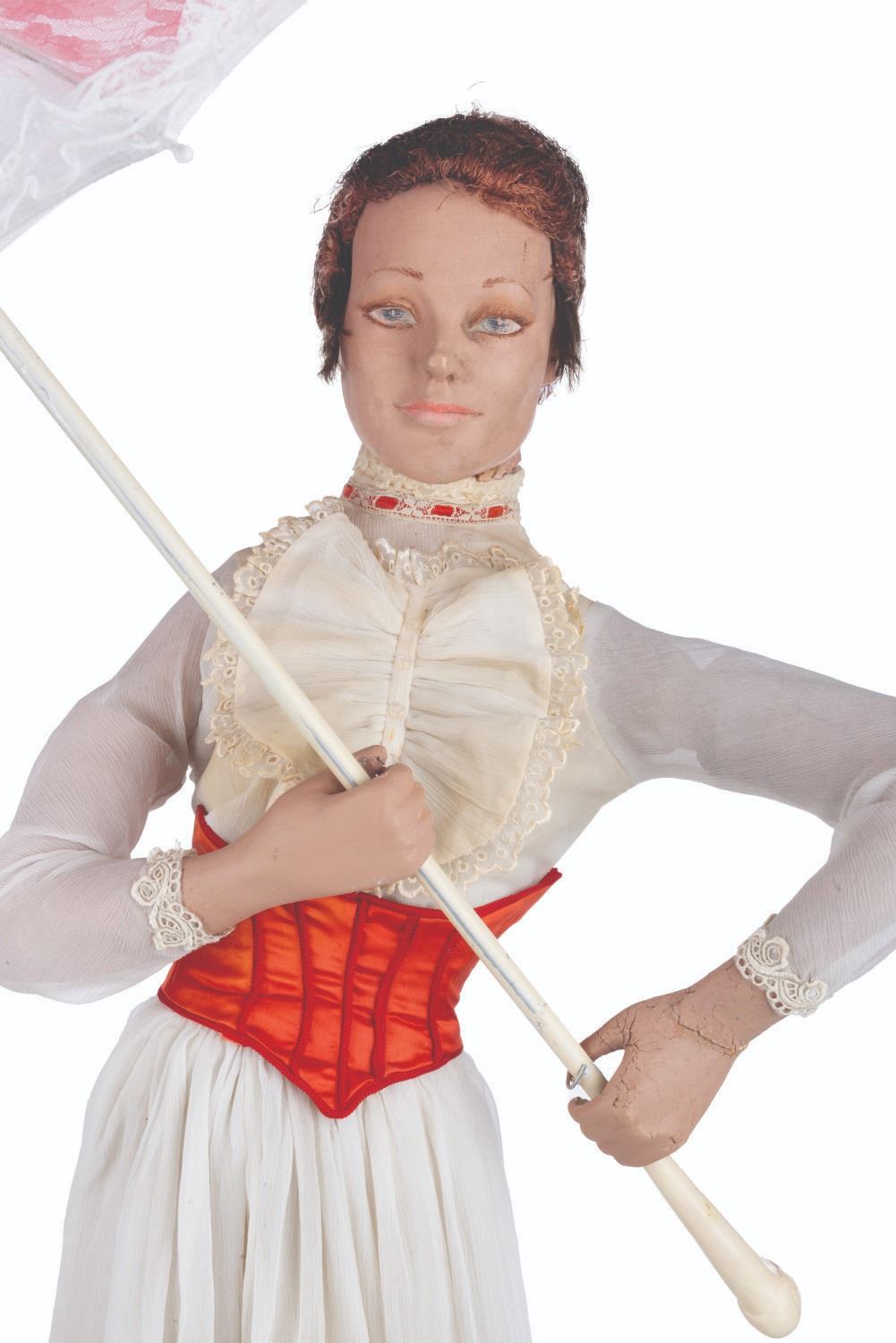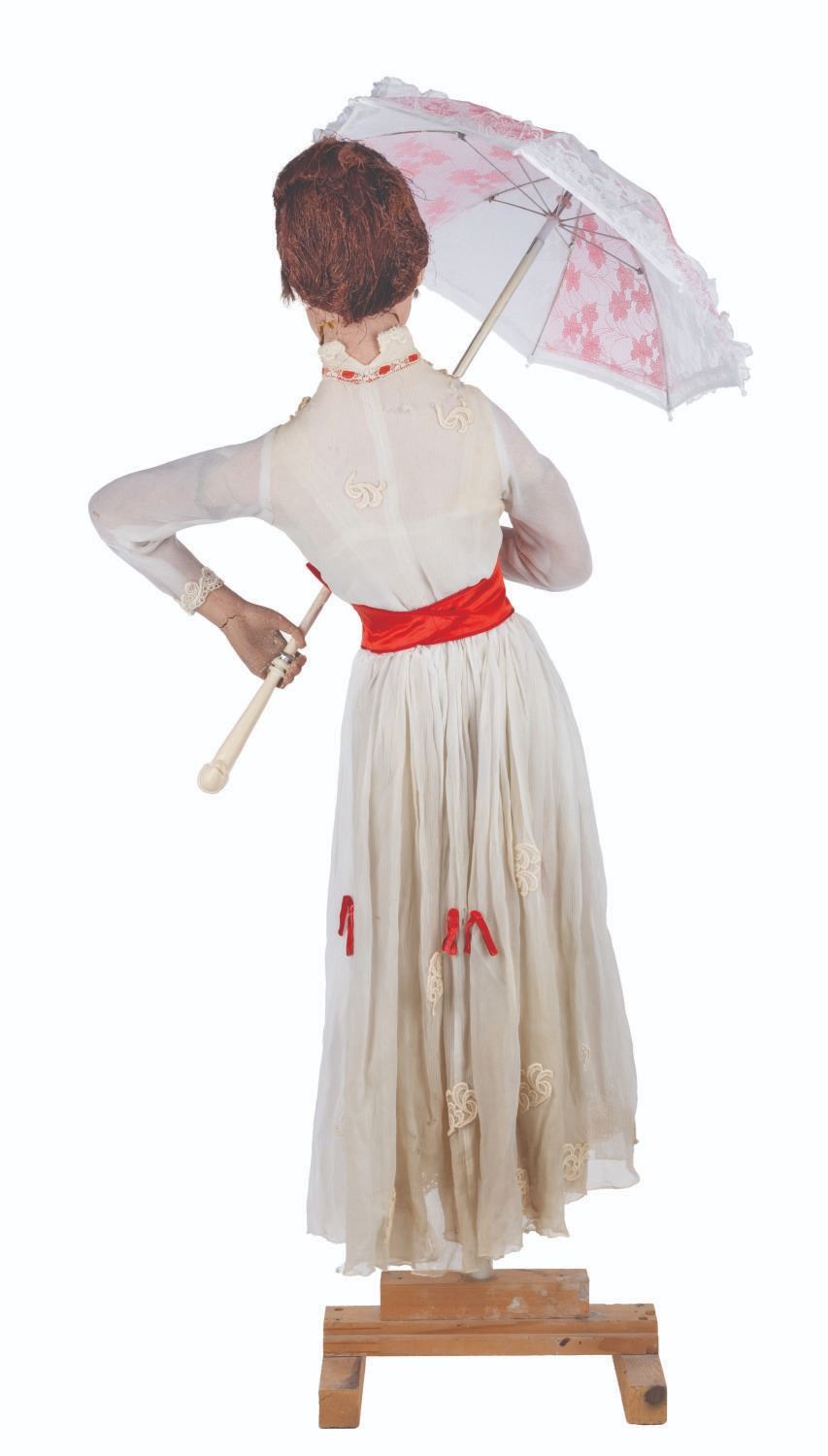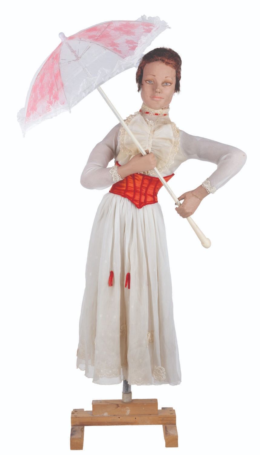 (Disneyland, 1964) An original figure of Julie Andrews as Mary Poppins.The Emporium is known for featuring elaborate window displays recreating scenes from Disney's latest releases. This figure of Mary Poppins in her "Jolly Holiday" dress was used in one such display in 1964. The individually sculpted piece has jointed arms, a hand-sewn dress, and prop parasol with a sculpted parrot head handle. The cast-resin figure is fully sculpted down to the waist, with only a pole supporting her beneath, with her dress falling naturally. Measuring 49" tall, the figure displays in good condition, with wear from age throughout including fading and cracking of paint.