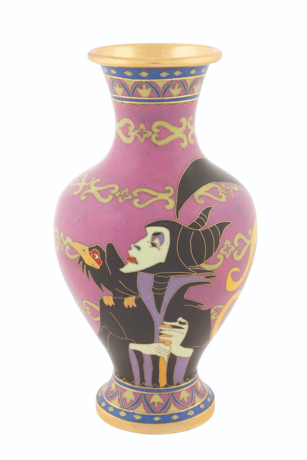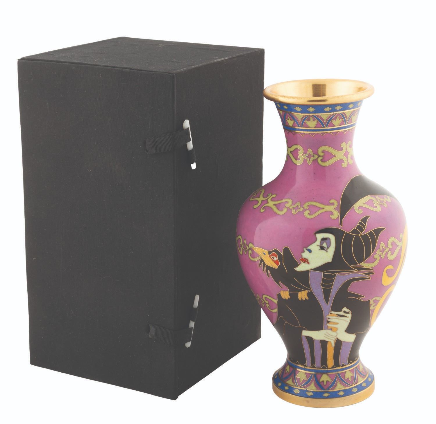 (Disney, 2000s) A cloisonne enamel vase featuring Maleficent and Diablo from “Sleeping Beauty,” designed by Costa Alavezos. Limited to an edition of 500, the vase measures 4.5” in diameter and 9” tall and is in fine condition with minor imperfections to the paint from the manufacturing process. The vase comes in the original 8.75” x 4.75” x 5” cushioned box, in very good condition with light wear.