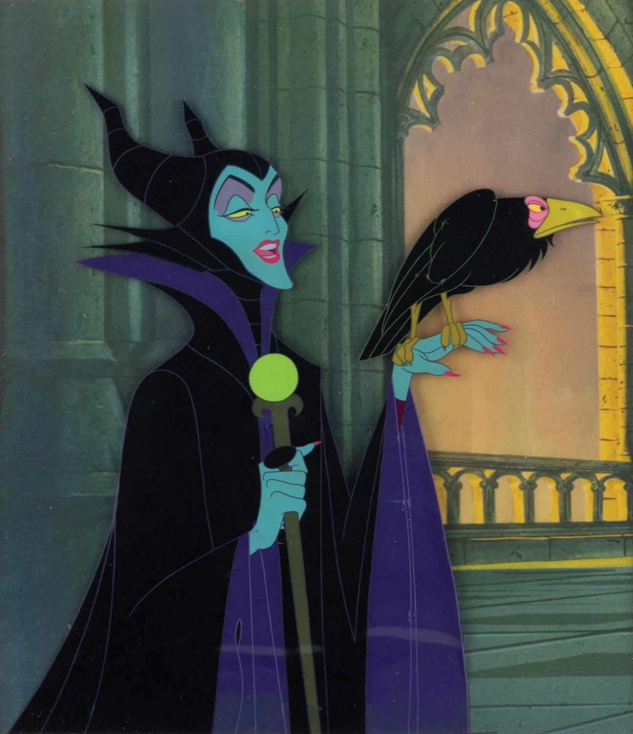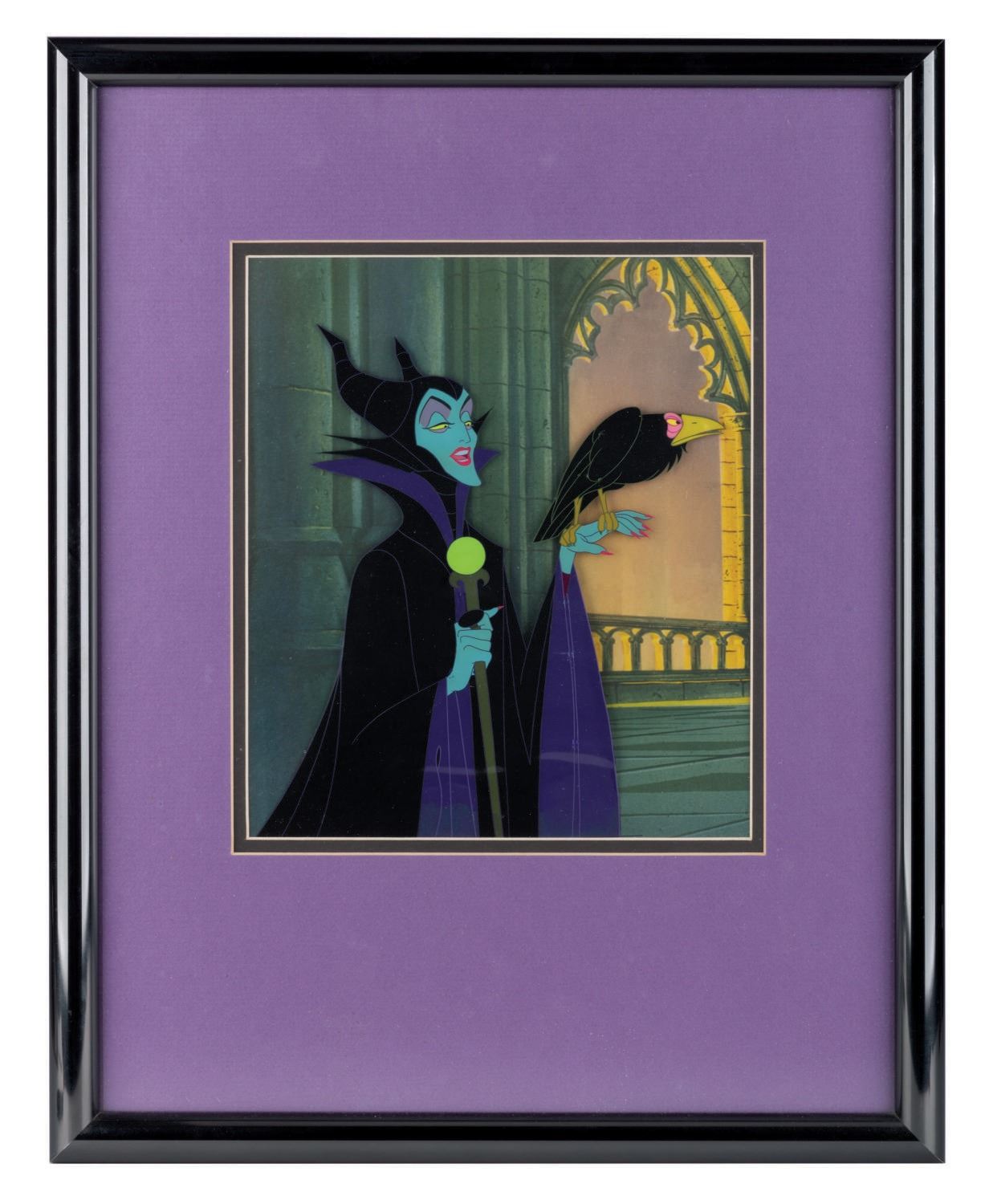 (Disneyland, 1960s) An original production cel of Maleficent and Diablo from Sleeping Beauty. The cel was trimmed at the studio in preparation for sale through the Art Corner at Disneyland. The image size of Maleficent and Diablo is 9"x8", and the entire piece measures 19.5"x15.5. It retains the original mat backing and bears the Disneyland gold sticker on the reverse.