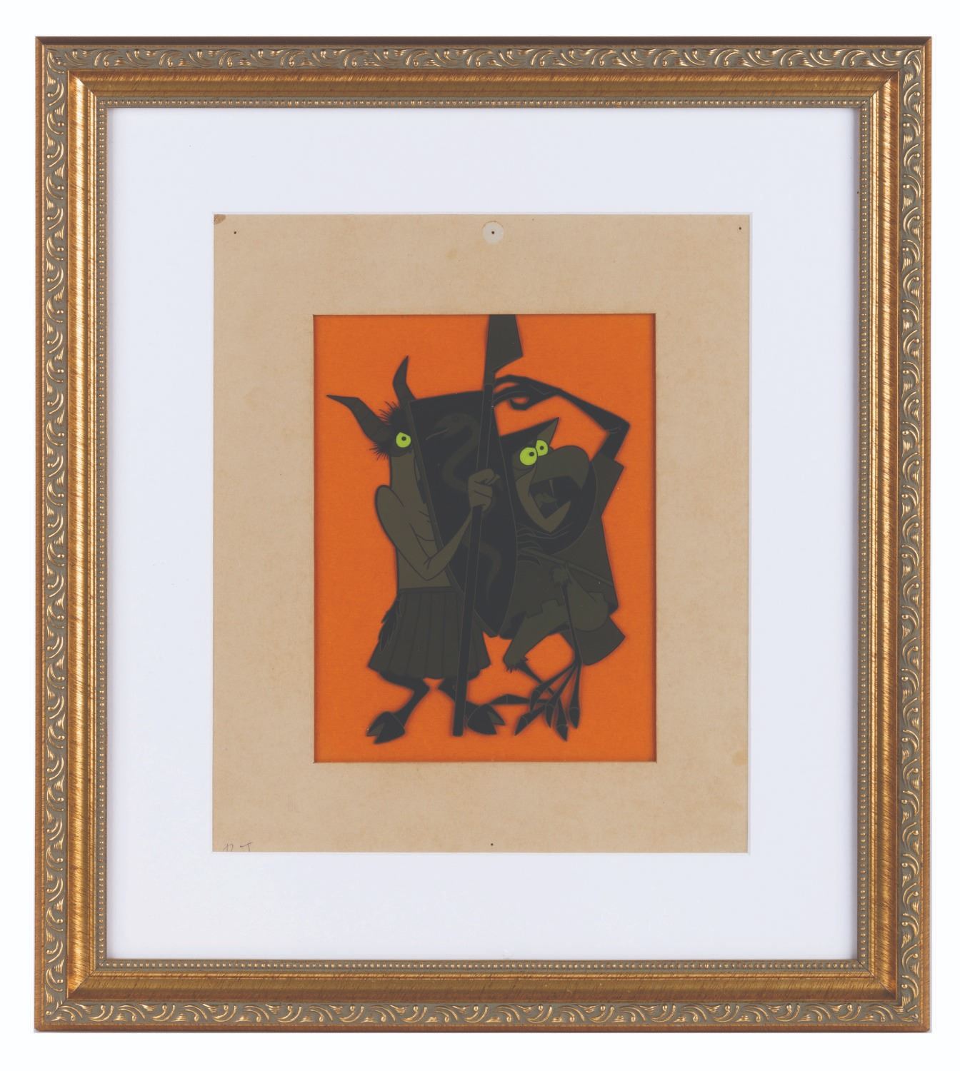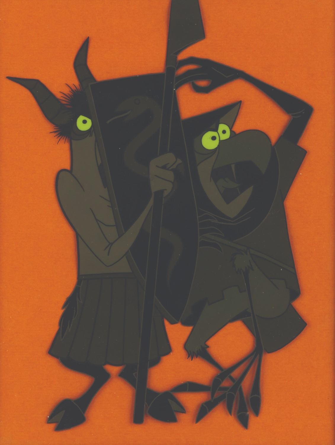 (Disney, 1959) An original production cel of a pair of Maleficent’s Goons from "Sleeping Beauty." With an image size measuring 5.5" x 7.75" in a 6.25" x 8.25" matte, the cel displays in very good to fine condition with very minor scratches.