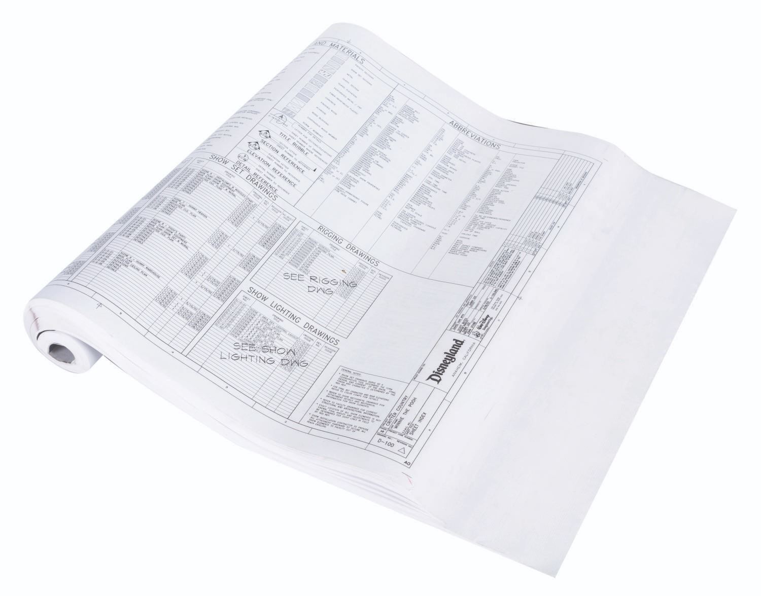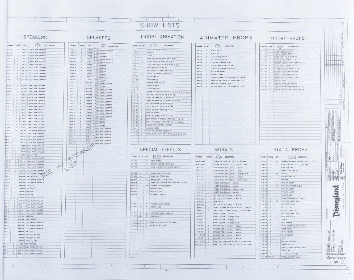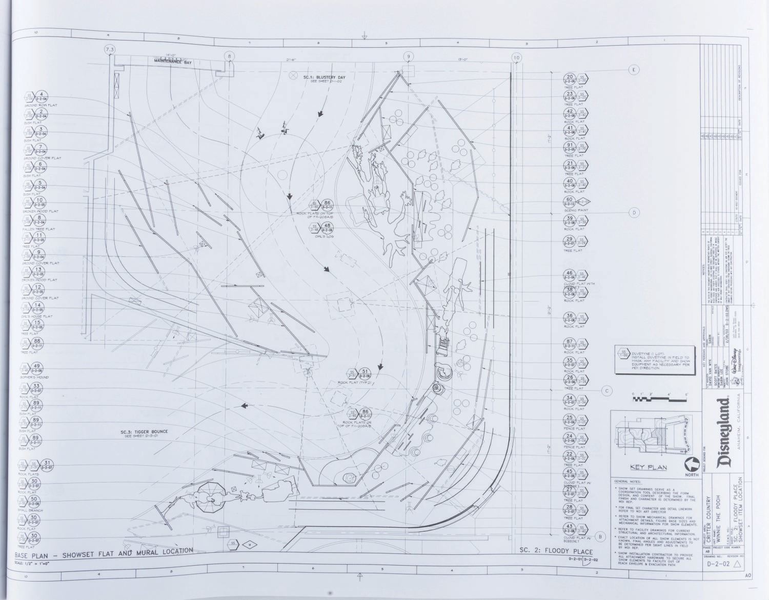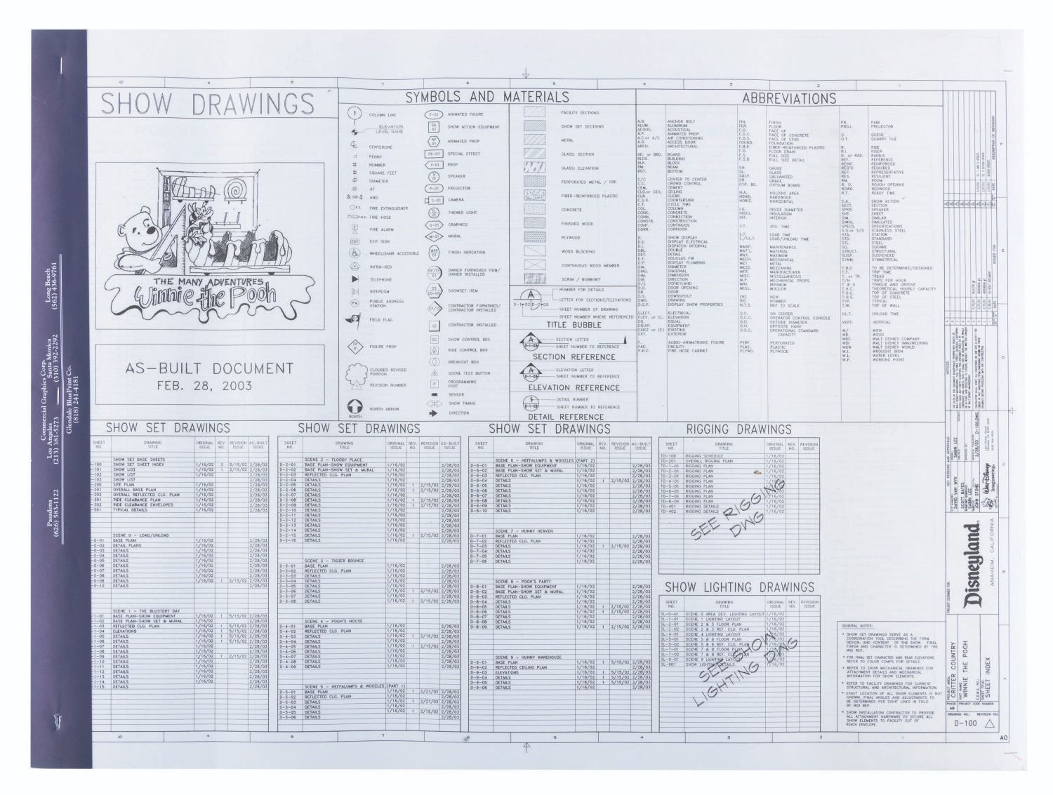 (WDI/Disneyland, 2003) An As-Built Document dated February 28, 2003, for the Many Adventures of Winnie the Pooh attraction at Disneyland. The impressive bound and rolled 105-page document is a complete collection of comprehensive schematics and drawings detailing the construction of the attraction’s sets, rigging, lighting, speakers, figure and prop animation, special effects, static props, and show set times. Measuring 18" x 24", the document displays in very good condition with light edge wear from production use.