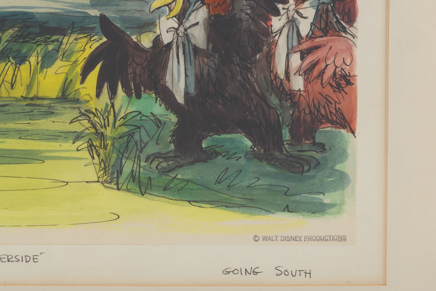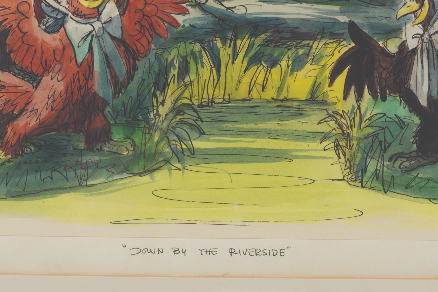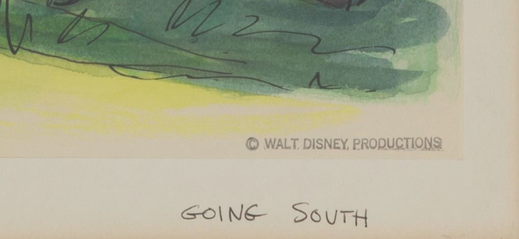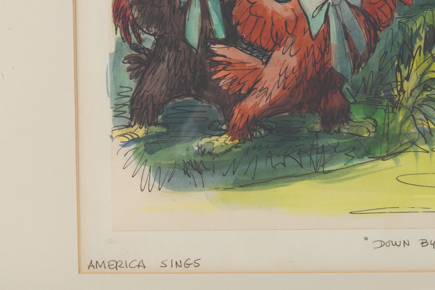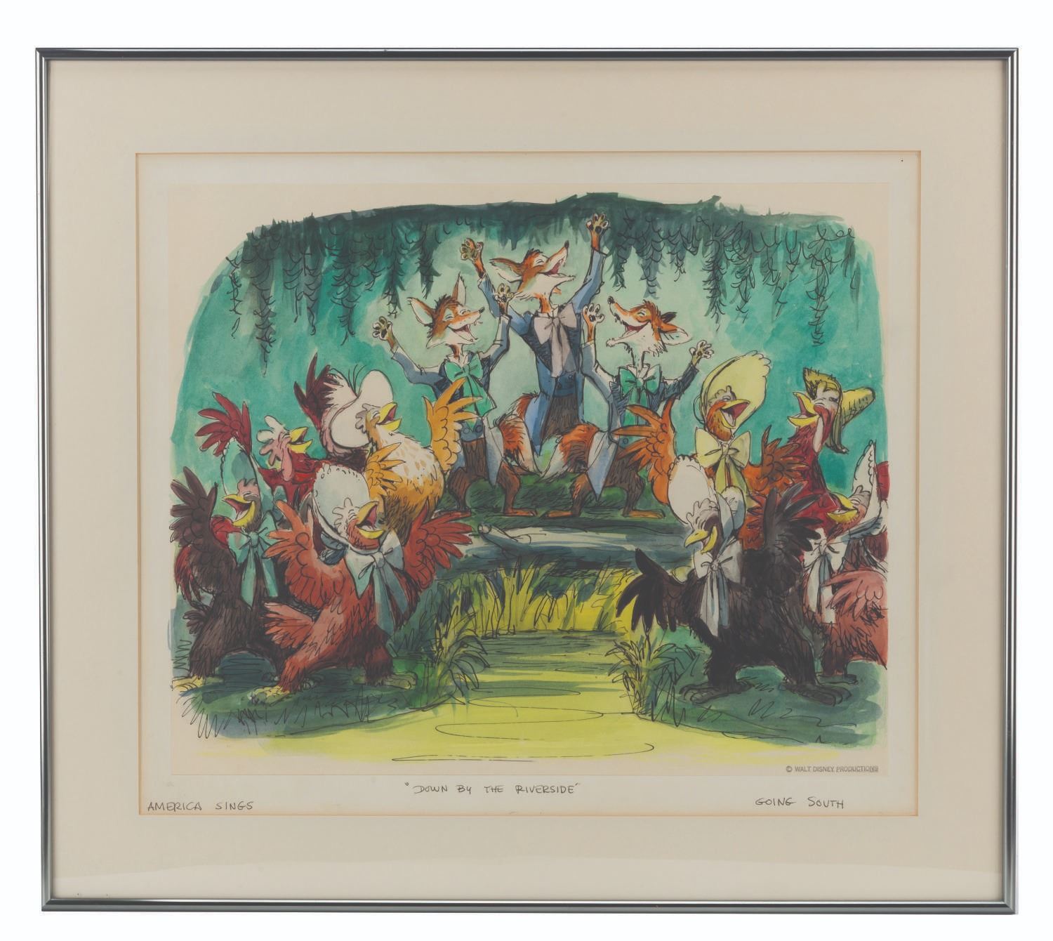 (Disneyland, 1972) An original concept painting by Marc Davis for America Sings, titled"Down by the Riverside." Davis created this painting featuring singing hens and foxes for scene one,"Going South," of the audio-animatronic musical extravaganza. Measuring 15.5" x 18.25" in a 20.5" x 23" glassless frame and matte, the ink and watercolor painting is in very good condition with light discoloration from age. The frame is in good condition with light scuffing and scratching.