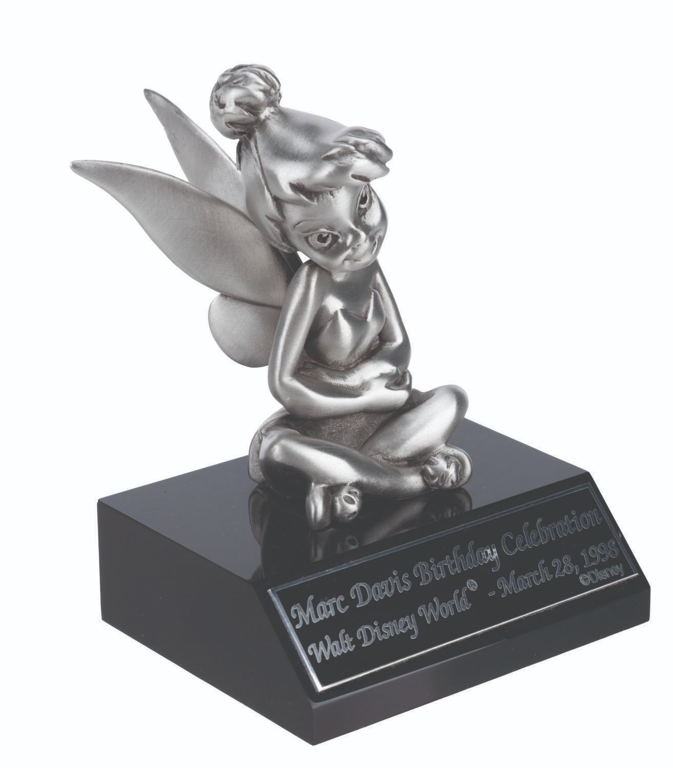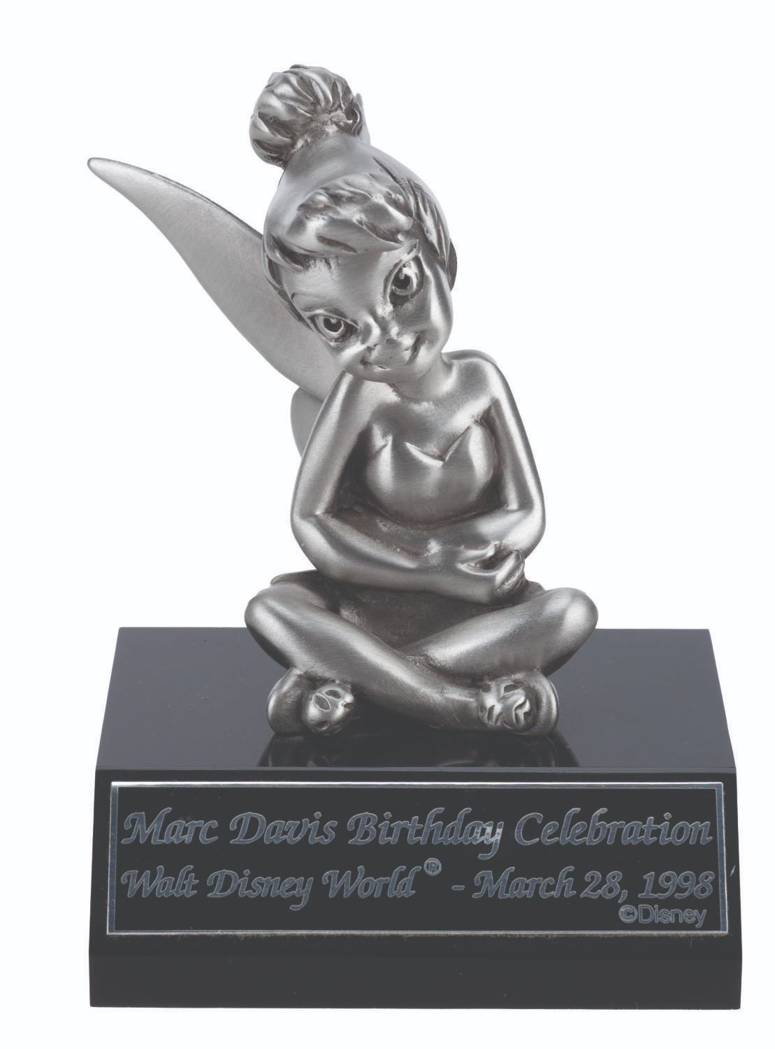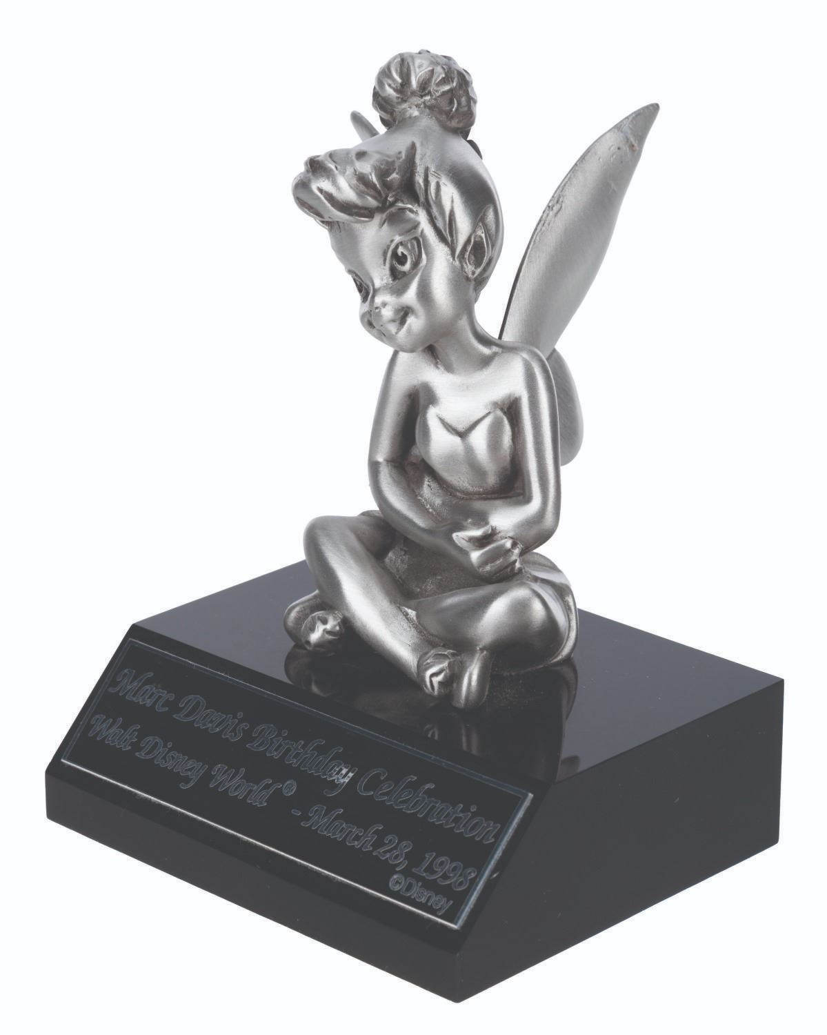 (Disney, 1998) A pewter Tinker Bell figure on a lucite base from Marc Davis' March 28, 1998, birthday celebration held at Walt Disney World. For his 85th birthday, Walt Disney special events threw a party for the Disney Legend that included a gallery of his work at the Coronado Springs Resort, followed by an interview with him at Disney-MGM Studios and dinner at the Brown Derby. Measuring 4" tall, the figure and base are in fine condition.