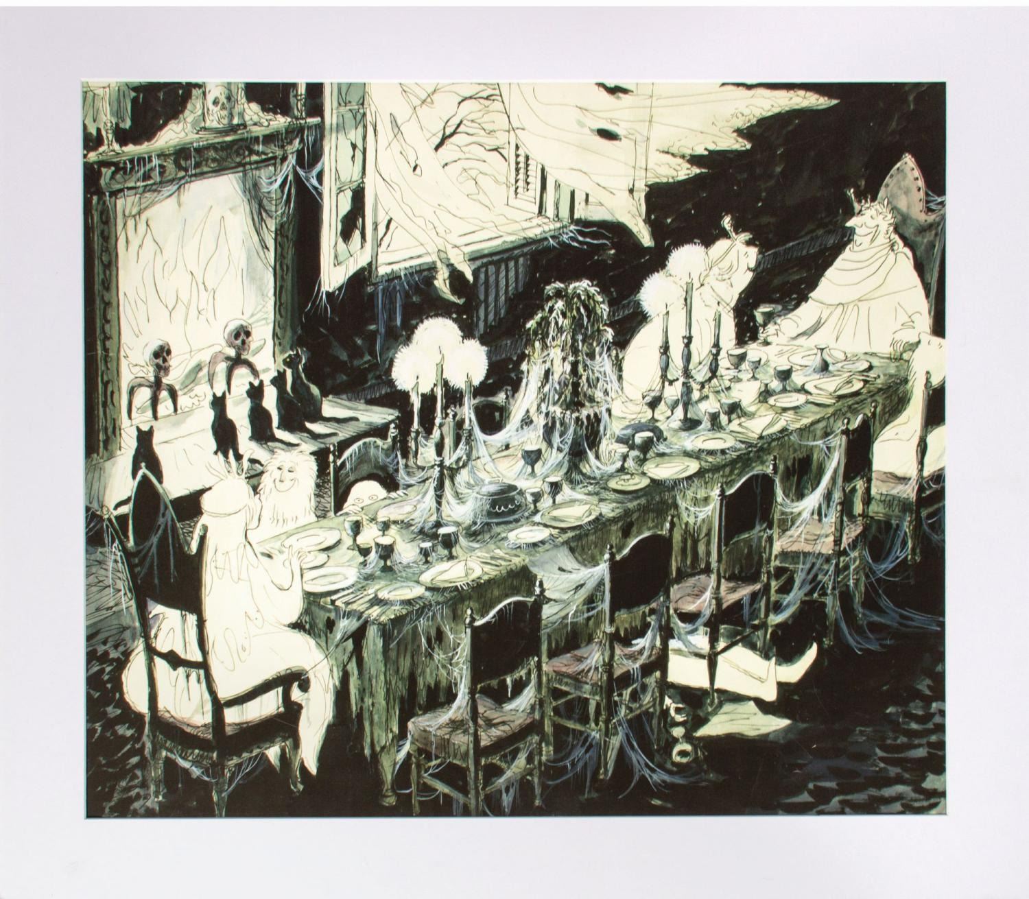 (Disneyland, 2000s) A large print of Marc Davis’ concept art for the Haunted Mansion's Grand Hall. This print was originally available through a Disney Gallery print-on-demand kiosk at Disneyland. The print has been hinged to foam core and matted for framing. Measuring 21.25" x 25" visible in a 26" x 30" matte, the print is in very good condition with small scuffs and scratches to the matte, and two fine creases 1" and under visible at the left edge of the image.