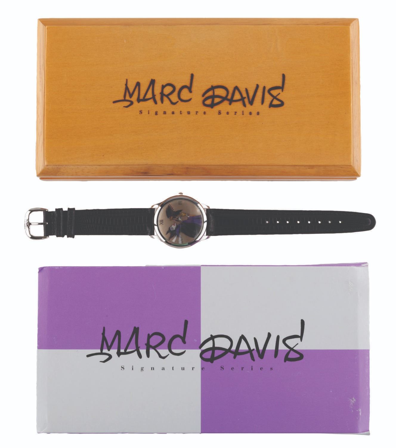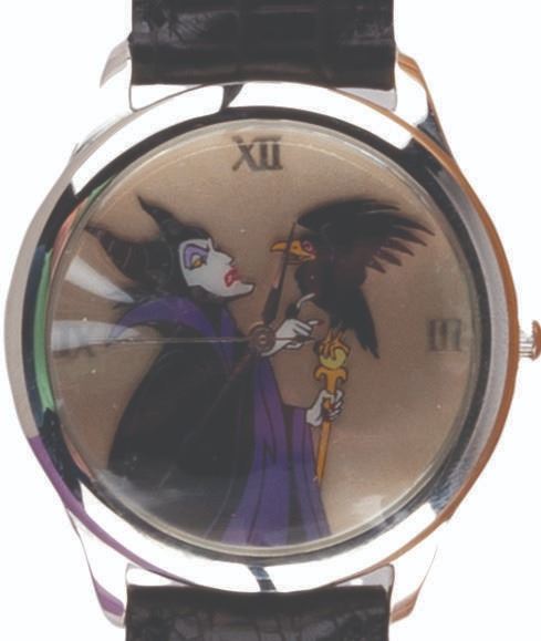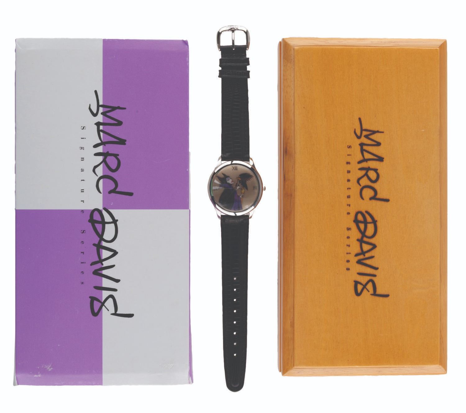(Fantasma, 1990s) A Marc Davis Signature Series Maleficent and Diablo wristwatch, with the original box. Both the box and watch back feature a facsimile of Davis' signature. Numbered 2761/5000, the watch is in fine condition, requiring a battery and possibly service to function. The wooden presentation box is in fine condition.