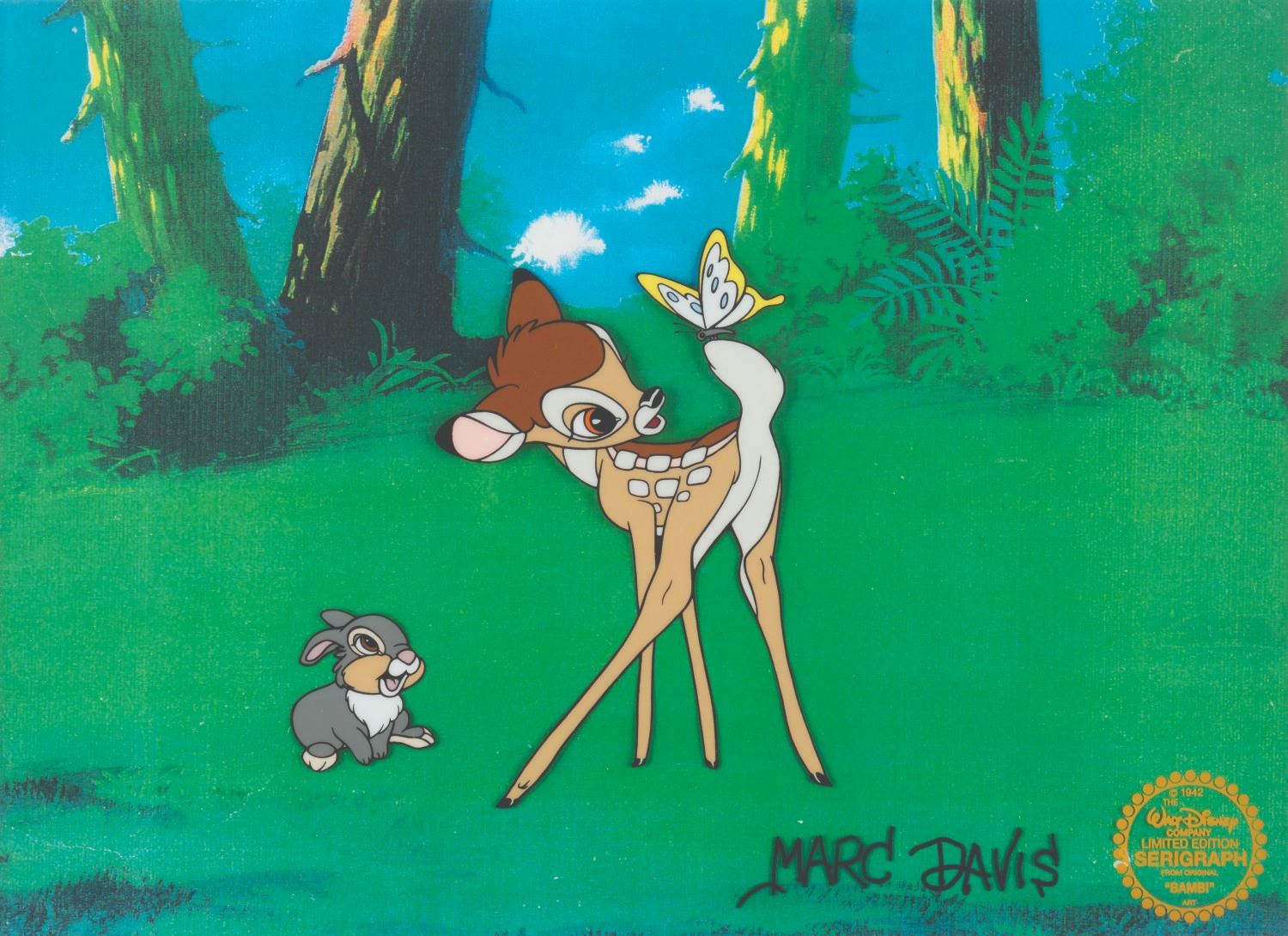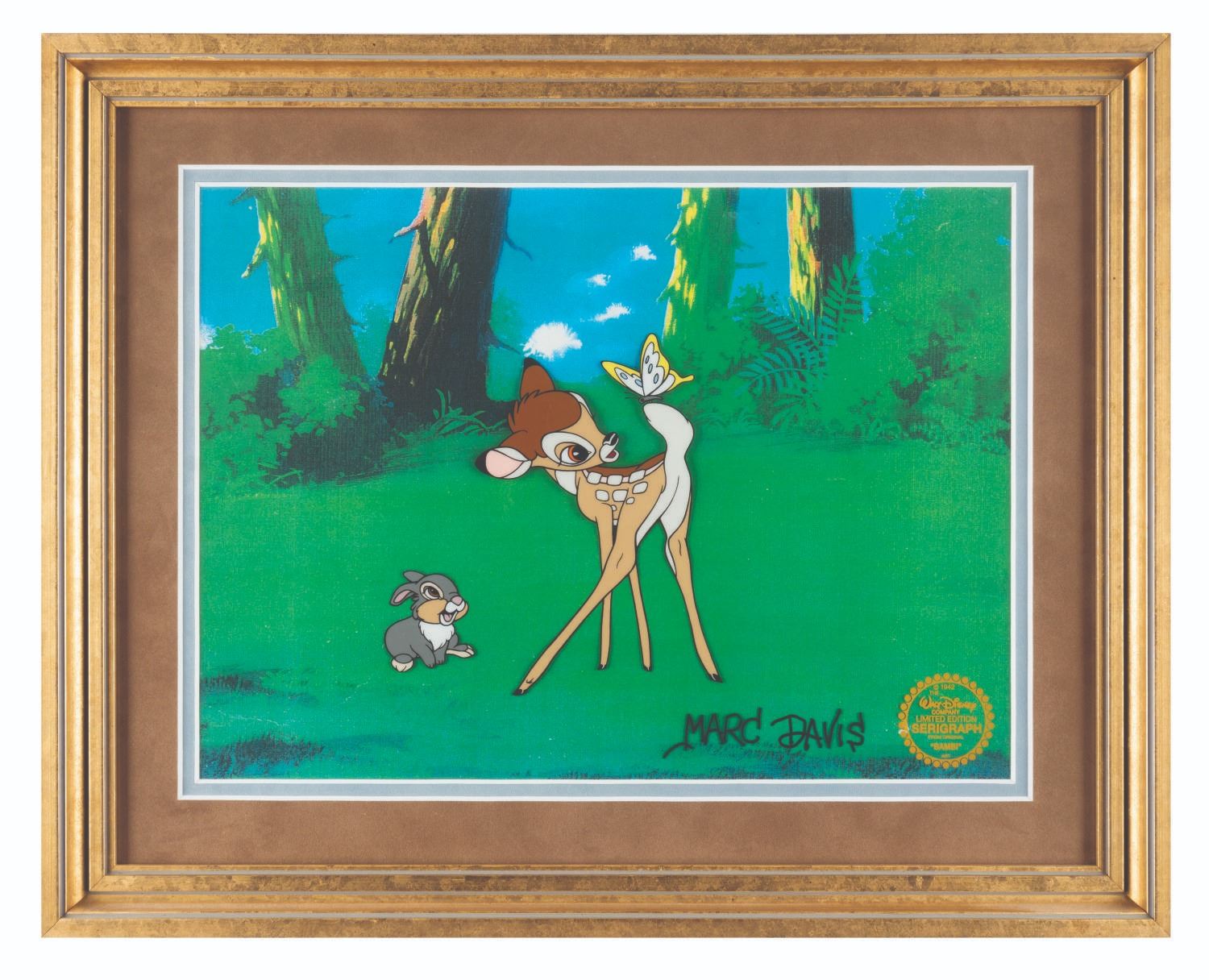 (Disney, 1990s) A "Bambi" sericel featuring Bambi and Thumper, signed by Disney Legend Animator Marc Davis. The cel has an image size of 6" x 5.25" with 9.5" x 13" visible within the 17.5" x 14" frame with a color copy background. The piece is in fine condition with very light wear to the frame from display.
