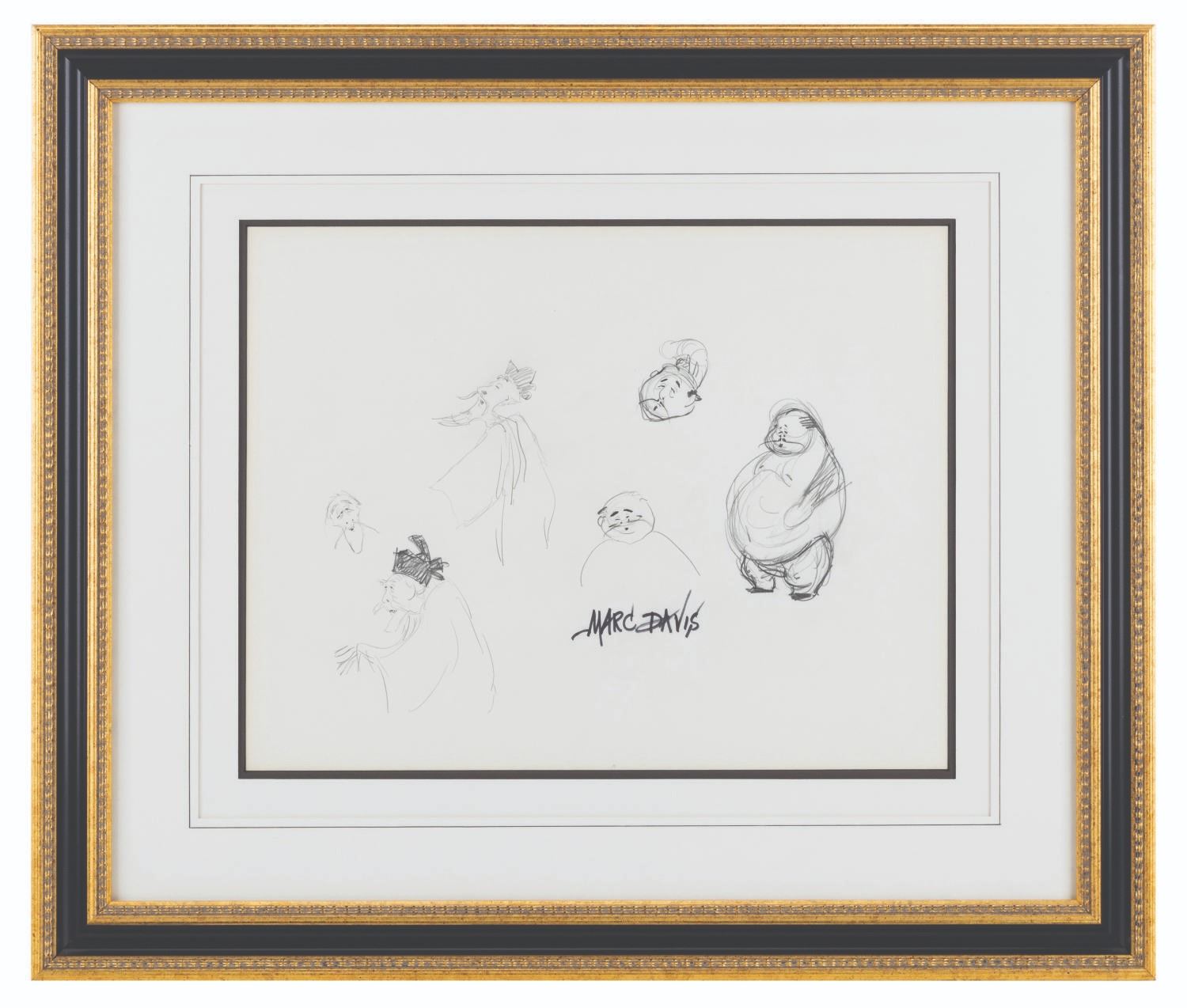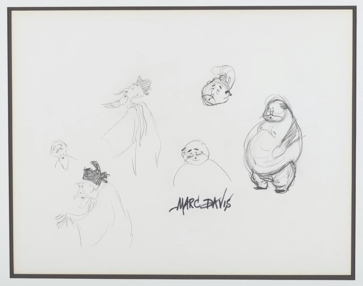 (Marc Davis, 1950-60s) A sheet of concept sketches of characters, boldly signed by Disney Legend Marc Davis. Walt briefly explored the idea of a Chinatown area in Disneyland, and these studies of Asian characters appear to be contemporaneous with that project. Accomplished in pencil on 16 field animation paper, the art has an image size of 10.5” x 7.5” and is in very good condition, with light wear from age and original use.