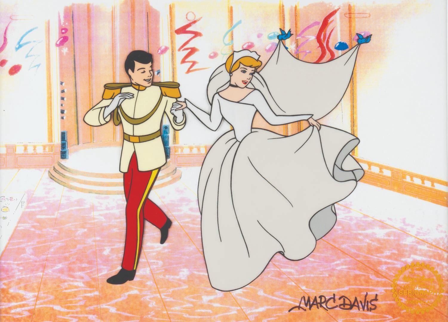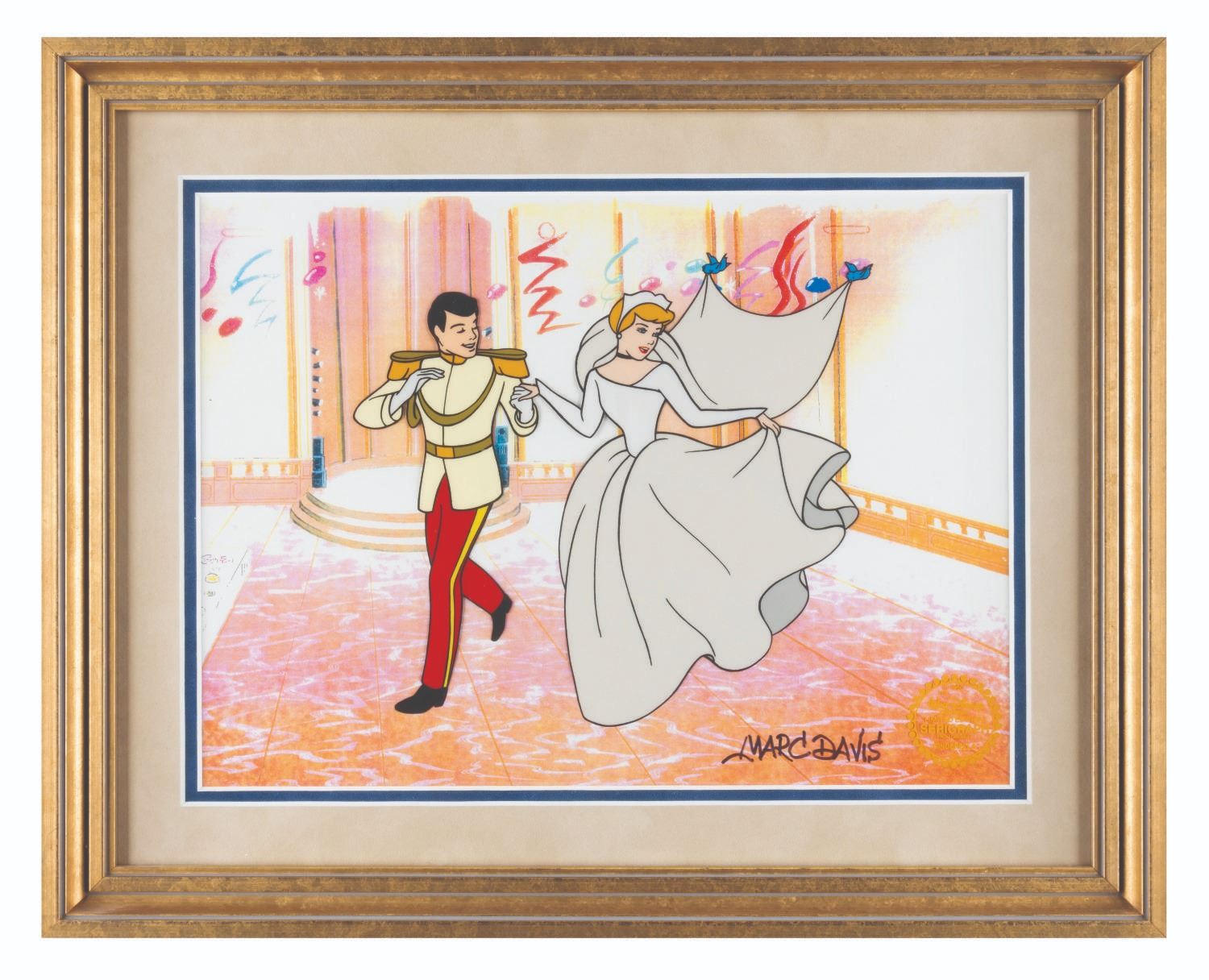 (Disney, 1990s) A "Cinderella" sericel signed by Disney Legend Marc Davis. The cel has an image size of 7.75" x 8.5" with 9.5" x 13" visible within the 14" x 17.5" frame with a color copy background. The piece is in fine condition with light wear to the frame from display.