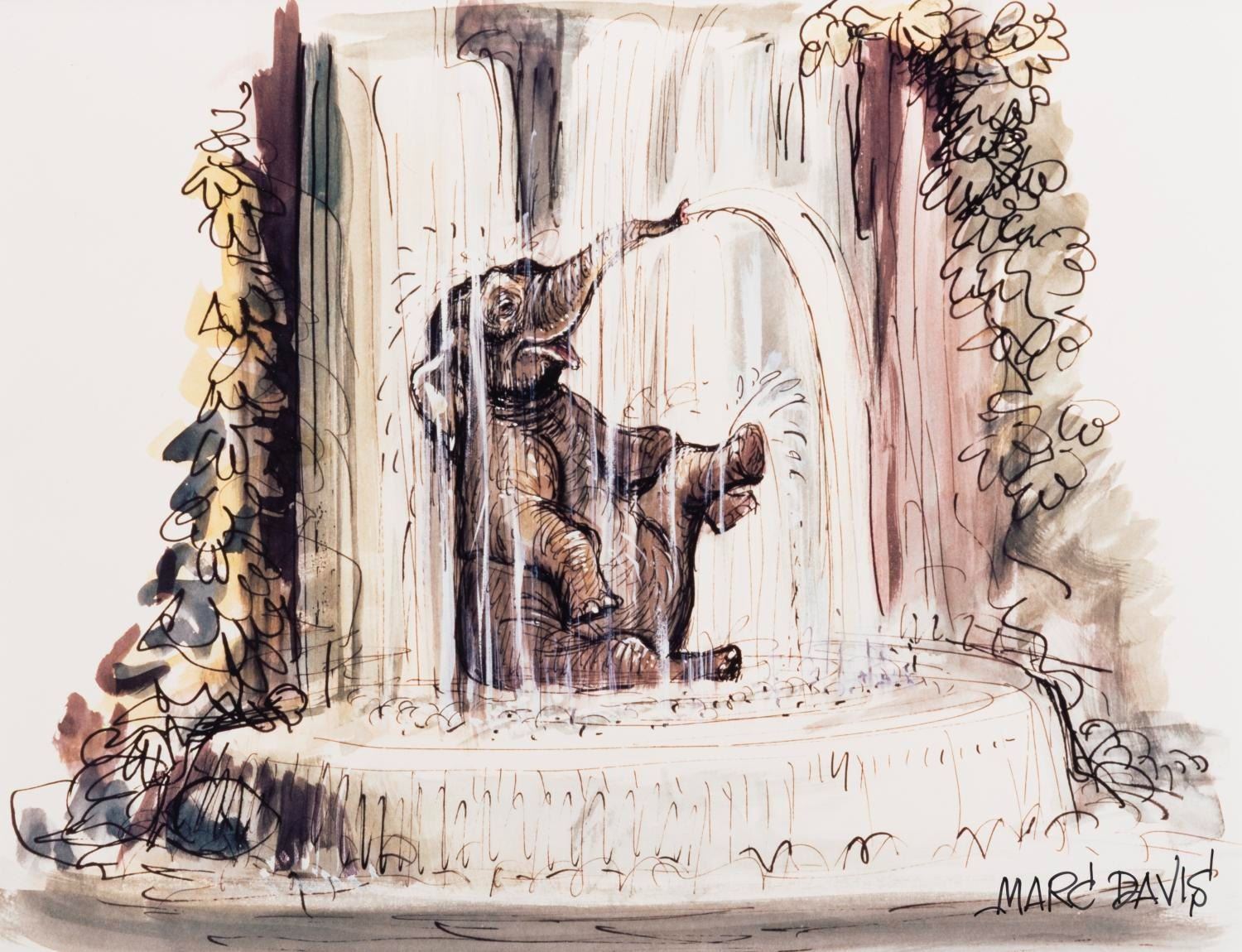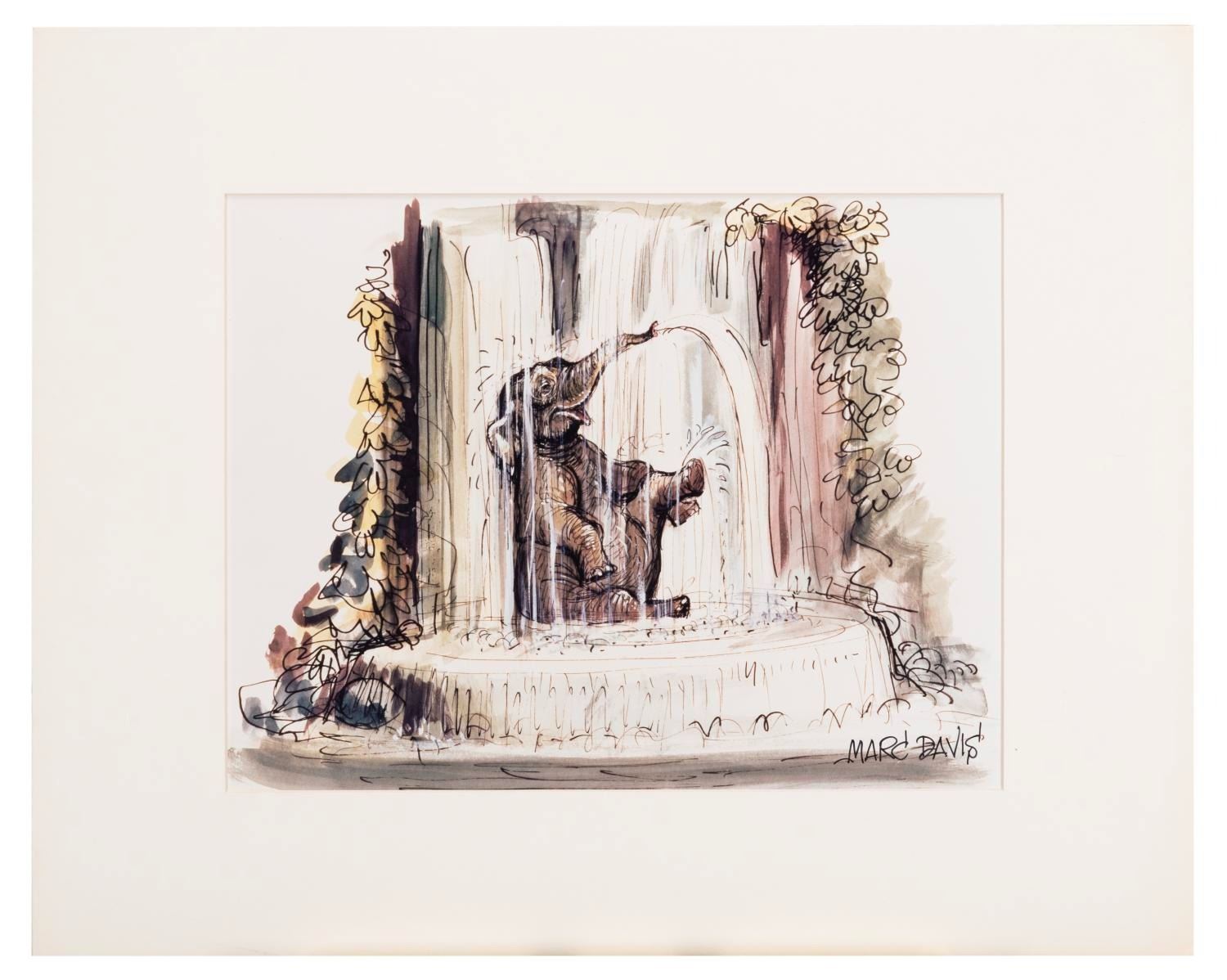 (Disneyland, 1991) A signed print of Imagineer Marc Davis' concept art for the Jungle Cruise. Depicting the iconic elephant bath scene, the print is signed by the Disney Legend at the bottom right corner. Measuring 10.25 " x 13.25 " in a 16 " x 20 " matte, the signed print is in fine condition, while the matte exhibits light wear.