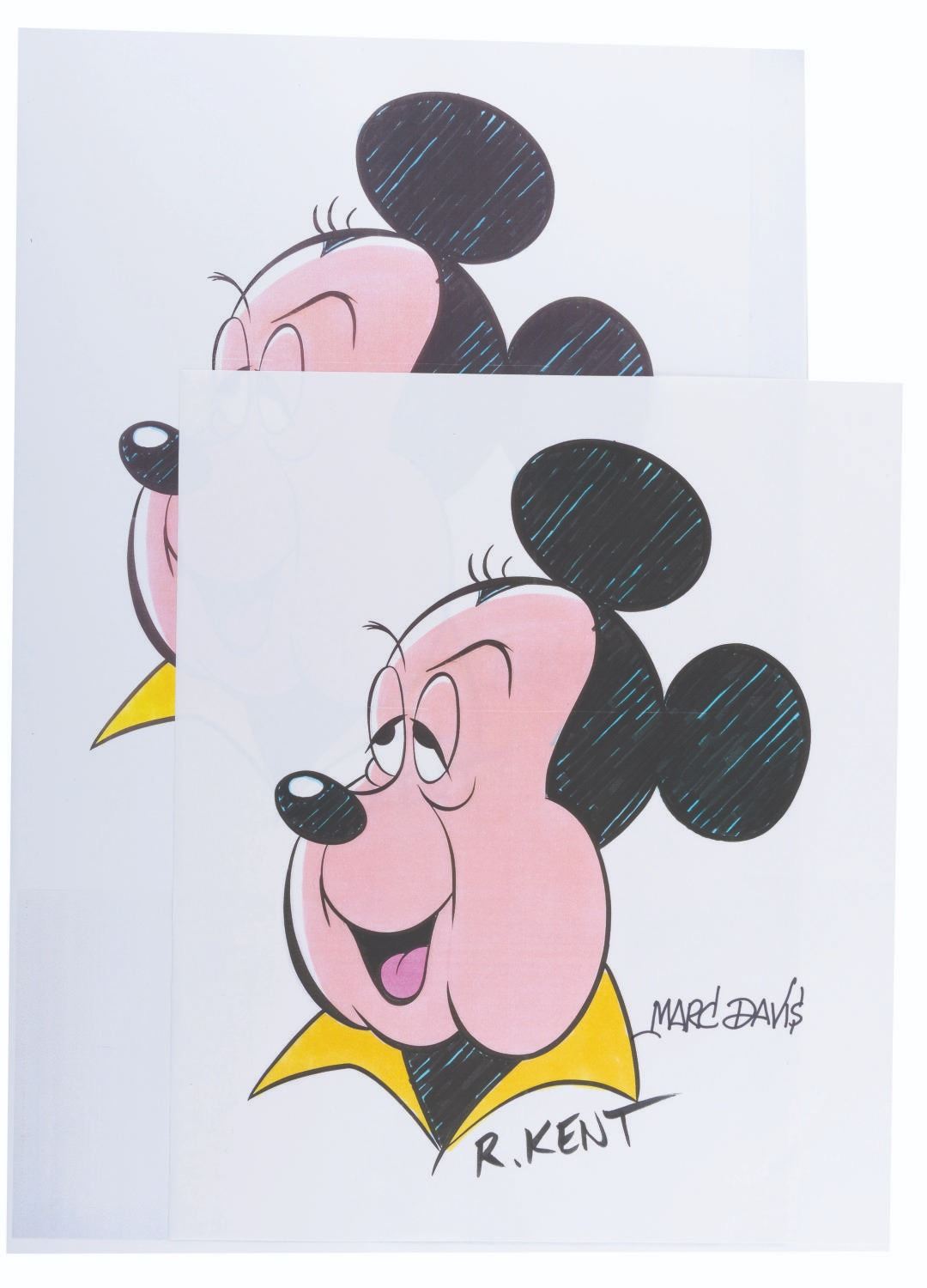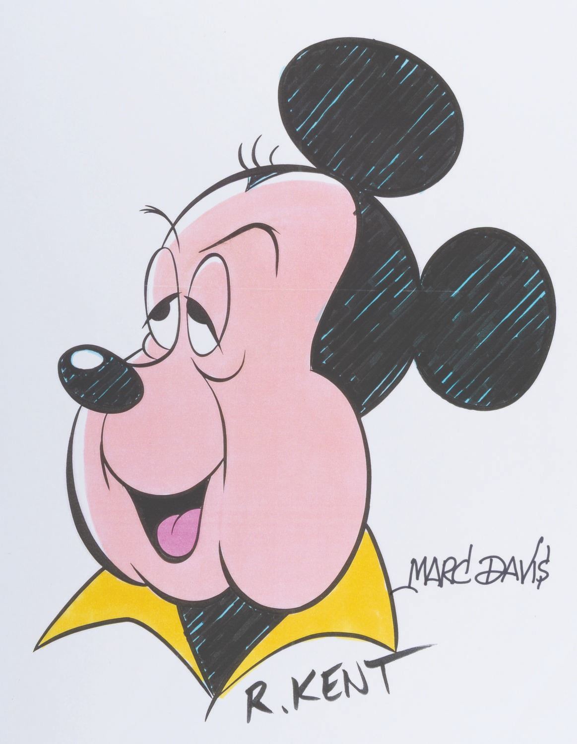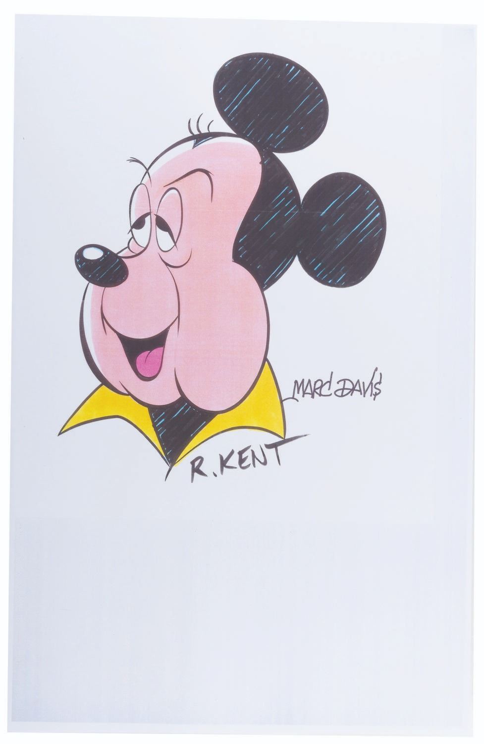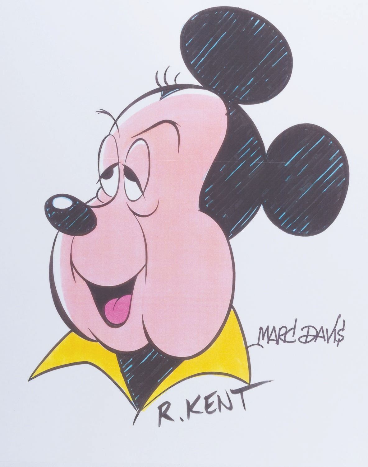 (Kent, 1980s-90s) A pair of prints of artist Ralph Kent's caricature of Disney Legend Marc Davis as Mickey Mouse, with one signed by Davis in black marker. With an image size of 8" x 10" on paper ranging from 10" x 12" to 11" x 17", the prints are in very good condition with streaks from the printing process and light handling wear.