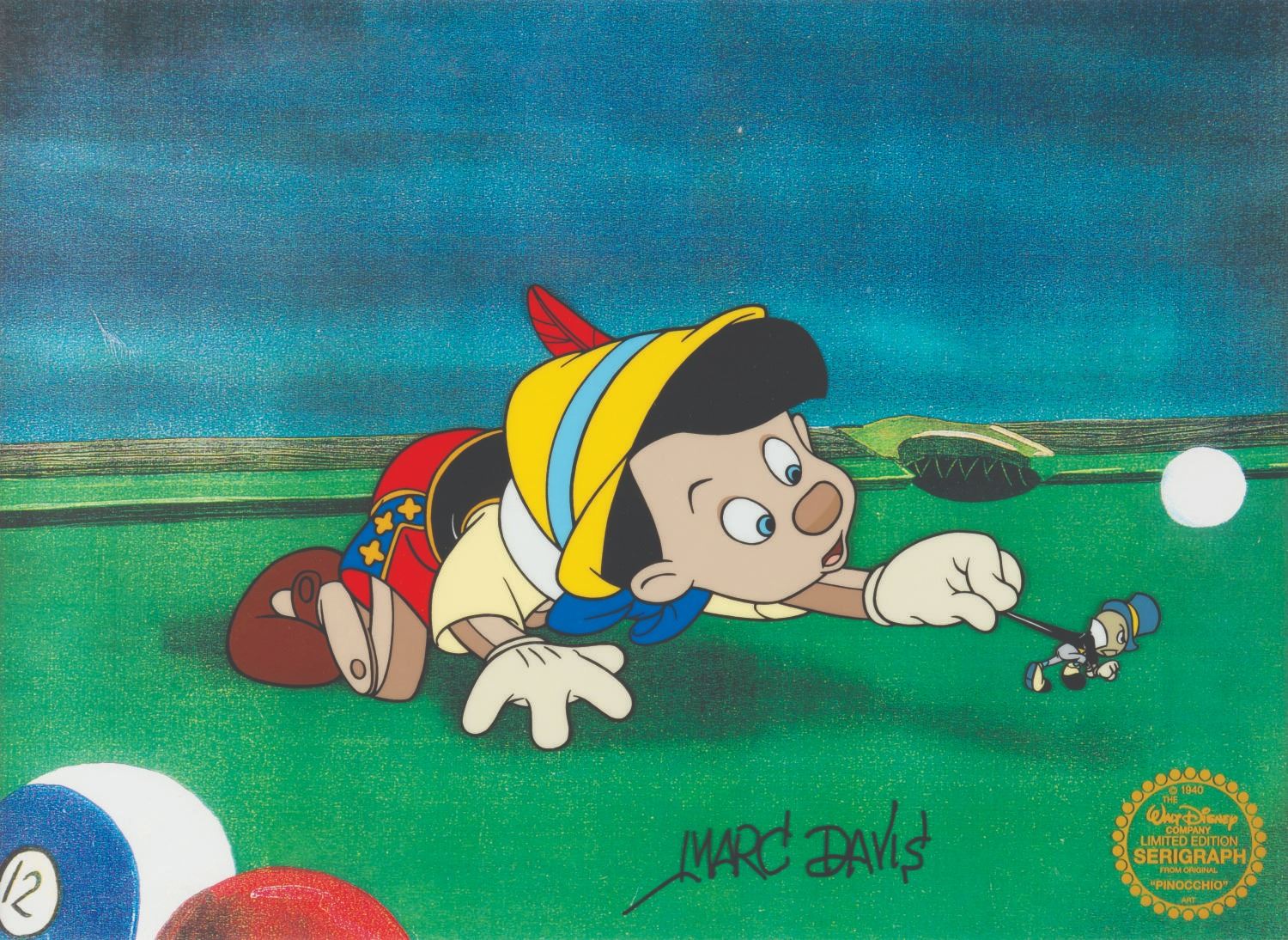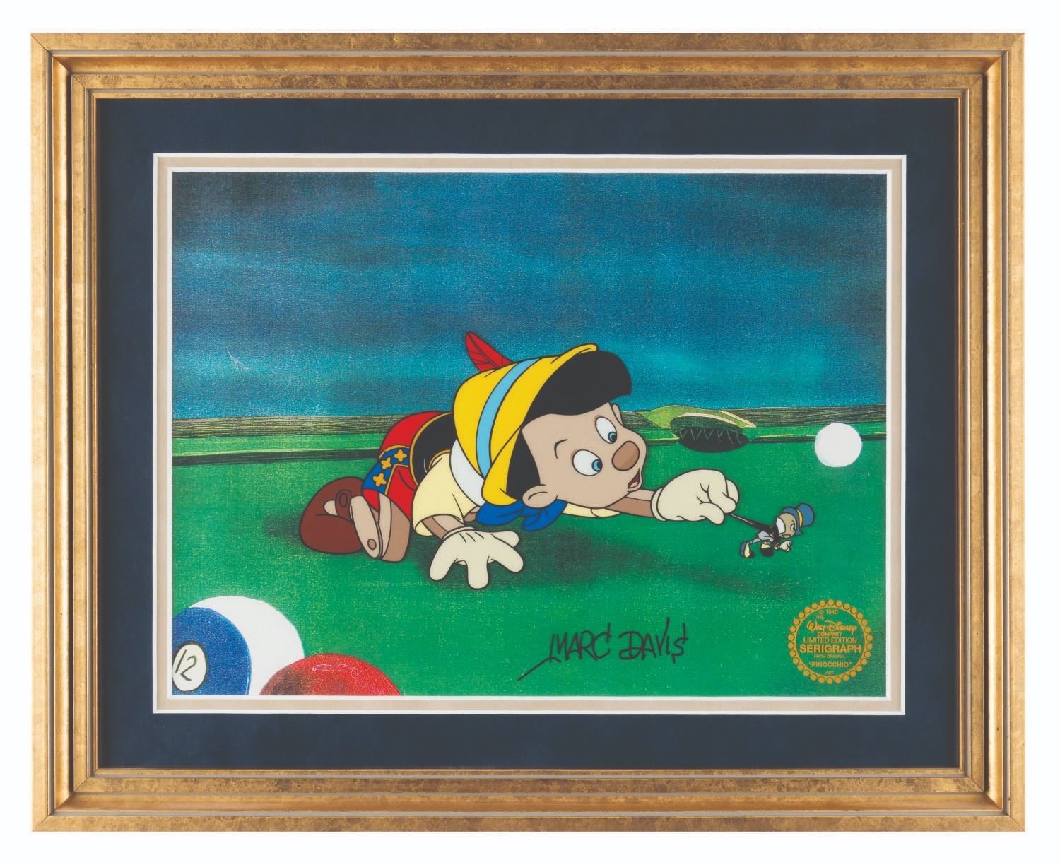 (Disney, 1990s) A "Pinocchio" sericel signed by Disney Legend Marc Davis. The cel has an image size of 4.75" x 9.5" with 9.5" x 13" visible within the 14" x 17.5” frame with a color copy background. The piece is in fine condition with light wear to the frame from display.