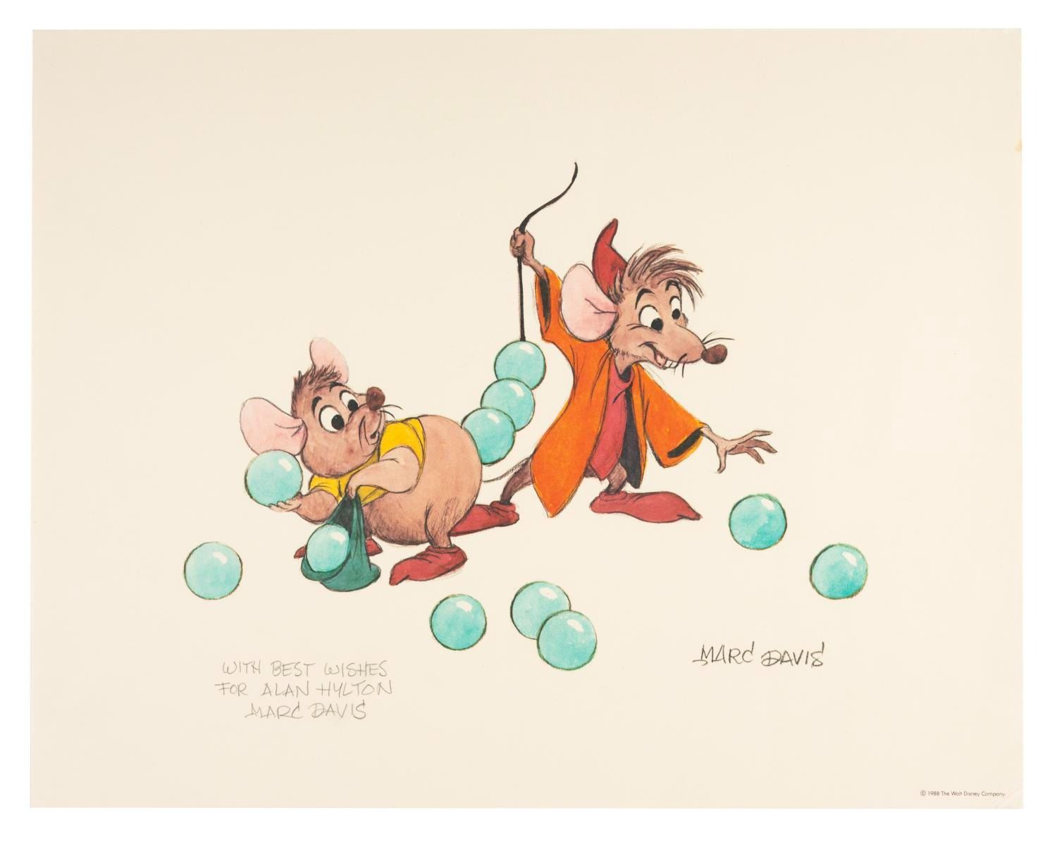 (Disney, 1988) A print of concept artwork featuring Jaq and Gus from Walt Disney’s “Cinderella” by Disney Legend Marc Davis, signed in graphite with a dedication to Alan Hylton. With a character image size of 9.75” x 7.25” on 11” x 14” cardstock, the print is in very good condition with a very minor crease to the lower right corner.
