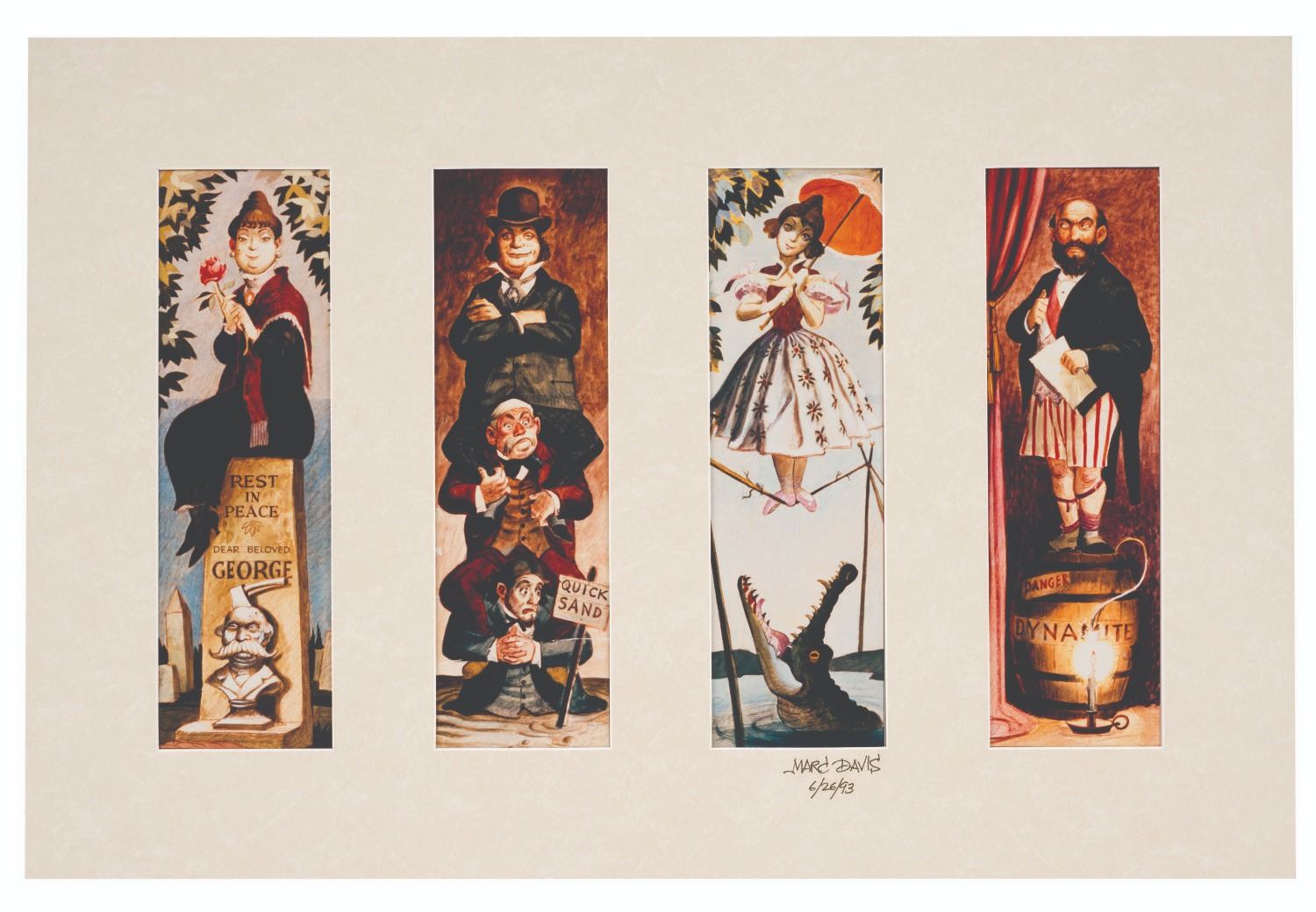 (Disneyland, 1993) A print of Marc Davis' infamous Stretching Room portraits, with mat signed by the Legendary Imagineer himself. Davis signed boldly right below the tightrope girl and dated it 6/26/93. Each image measures 4.25" x 14" within the 20" x 30" mat. The artwork is in fine condition.
