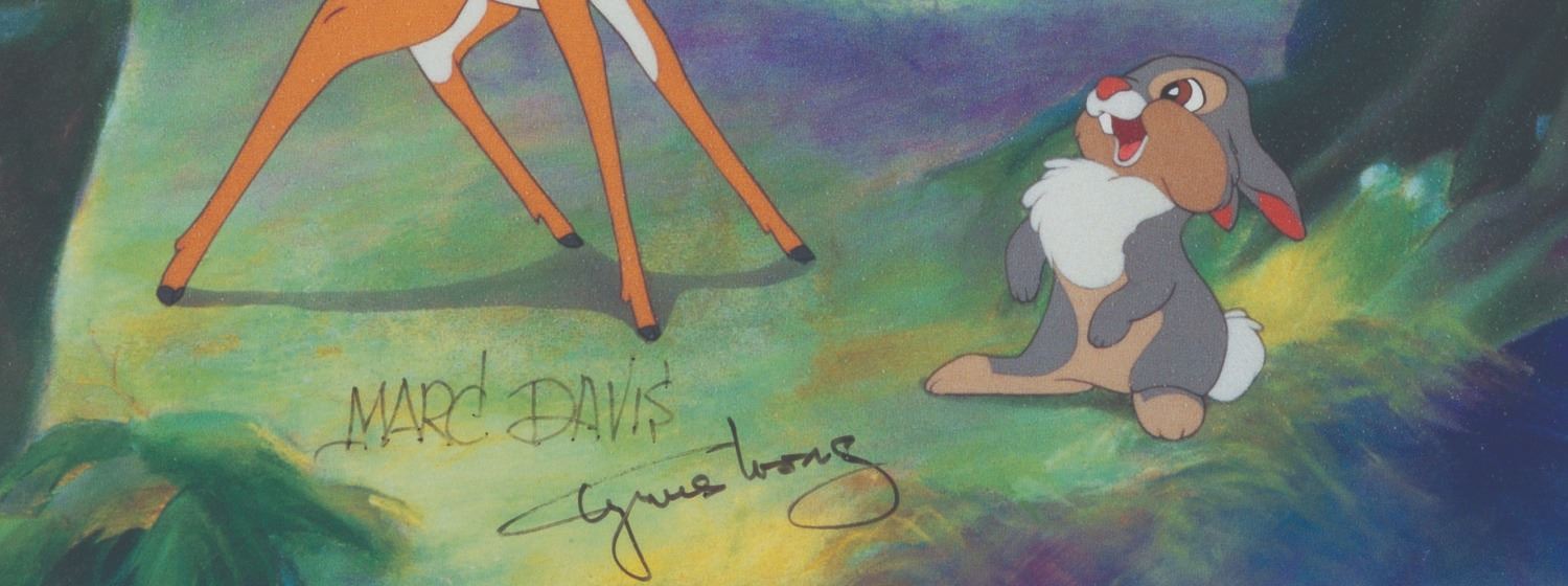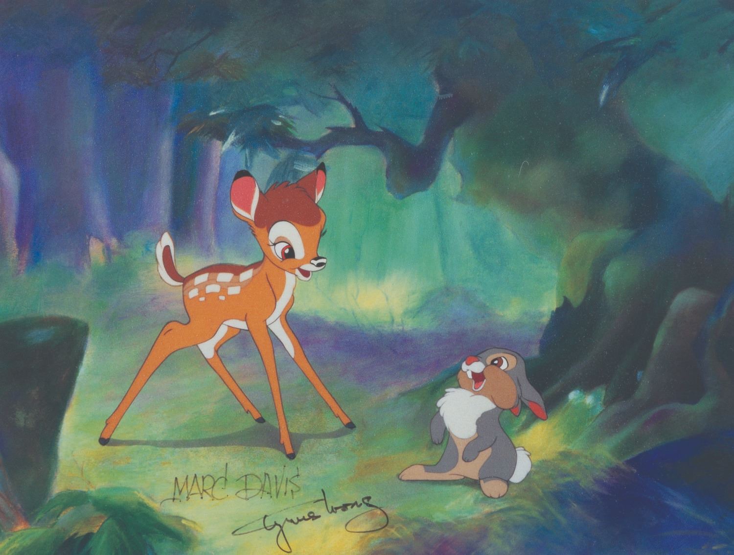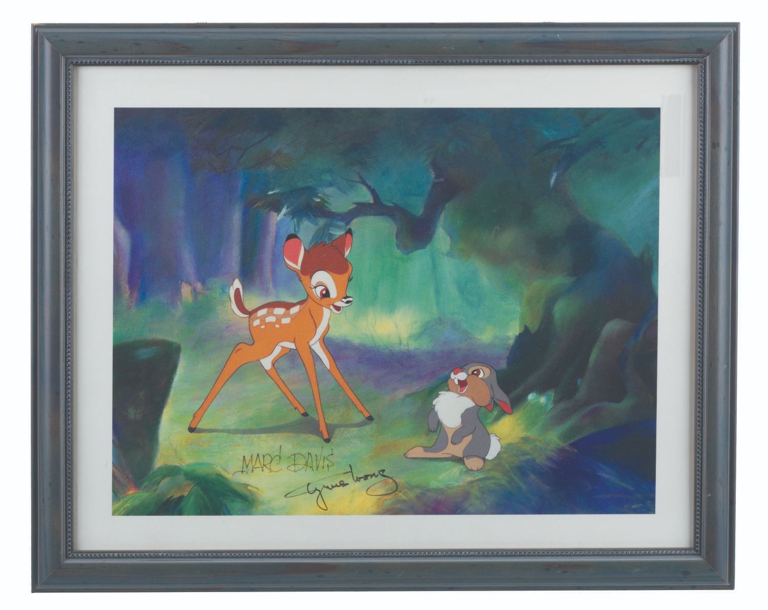 (Disney, 1990s) A lithographic print of Bambi and Thumper, signed by Disney Legends Marc Davis and Tyrus Wong in black marker. With an image size of 9" x 12" in a 12.5" x 15.5" frame, the multi-signed print is in fine condition, while the frame displays in very good condition with intentional distress, light scuffs, tape residue, and wear.