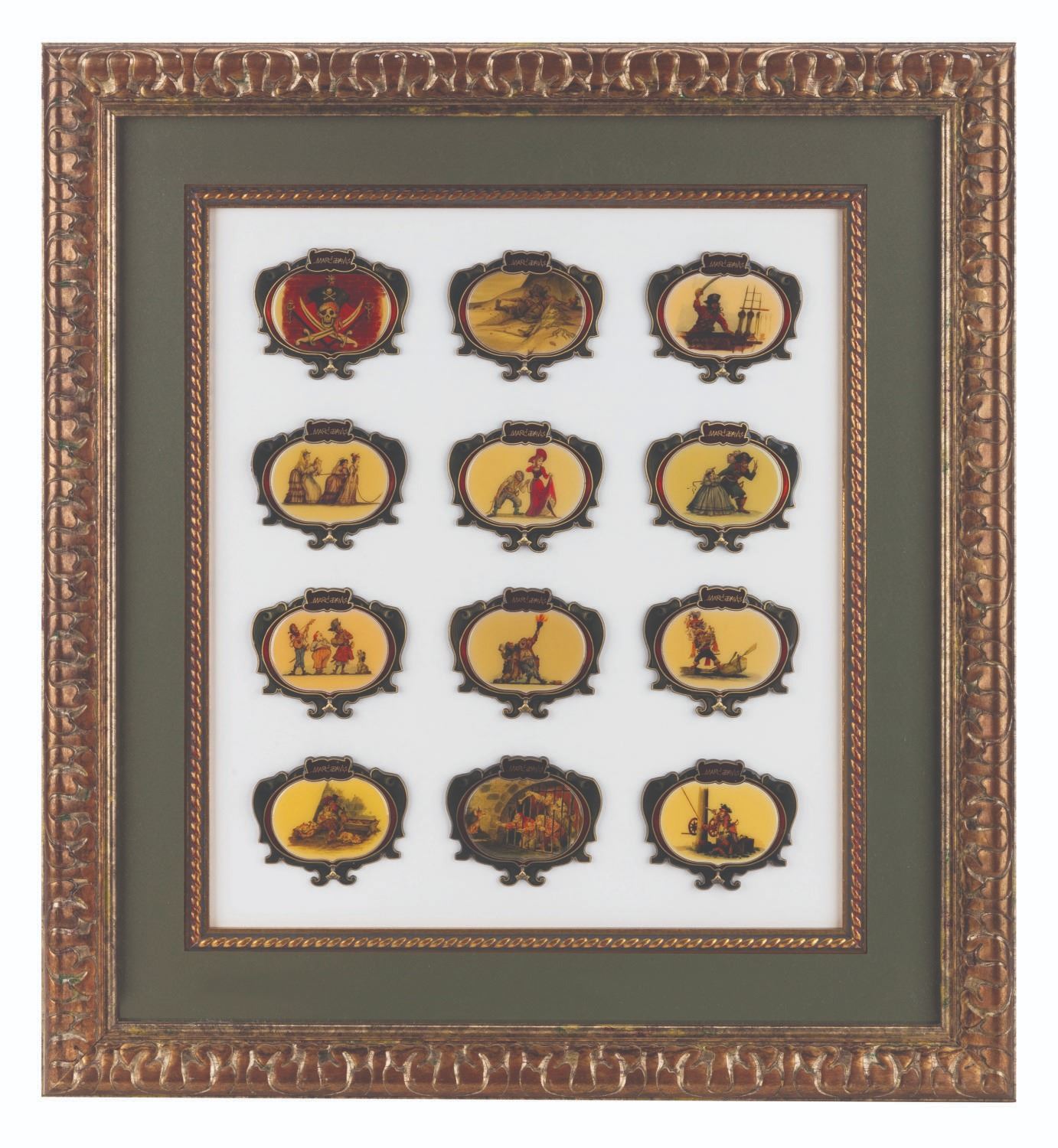 (WDI, 2006) A framed complete set of 12 Marc Davis Pirates of the Caribbean concept art pins. Each pin was released in a limited edition of 500 each, exclusively at Walt Disney Imagineering in Glendale, with only 25 total of these framed sets offered. The 3” x 2.5” pins and 18.5” x 20.25” frame are in very good to fine condition.