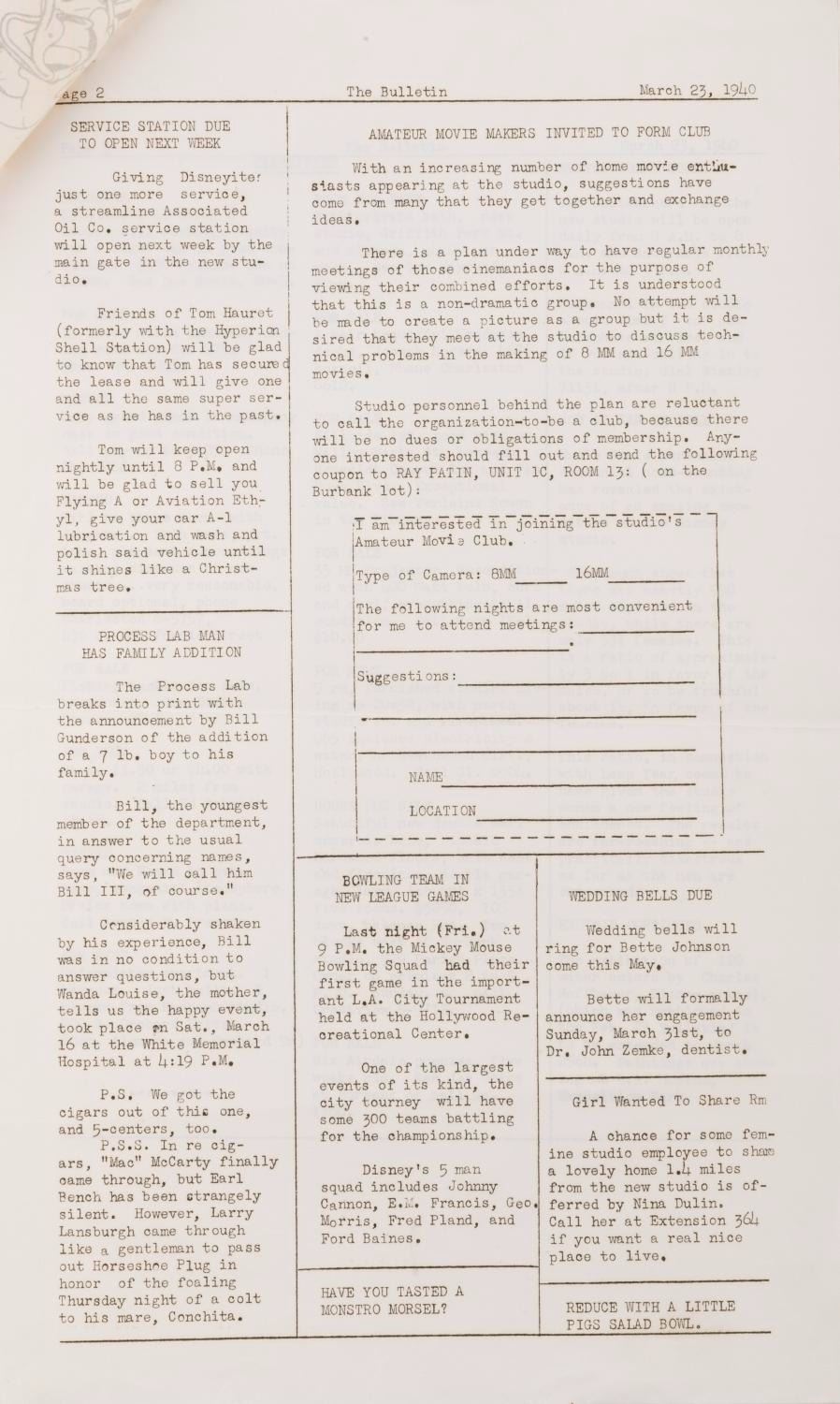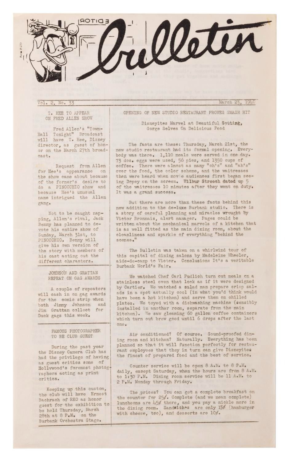 (Disney, 1940) A three page Disney Studios Vol 2. No. 3 employee bulletin newsletter featuring news about the new studio restaurant, service station, classified ads and more. Measuring 8.5" x 14" the bulletin is in very good condition with light discoloration and edge wear.