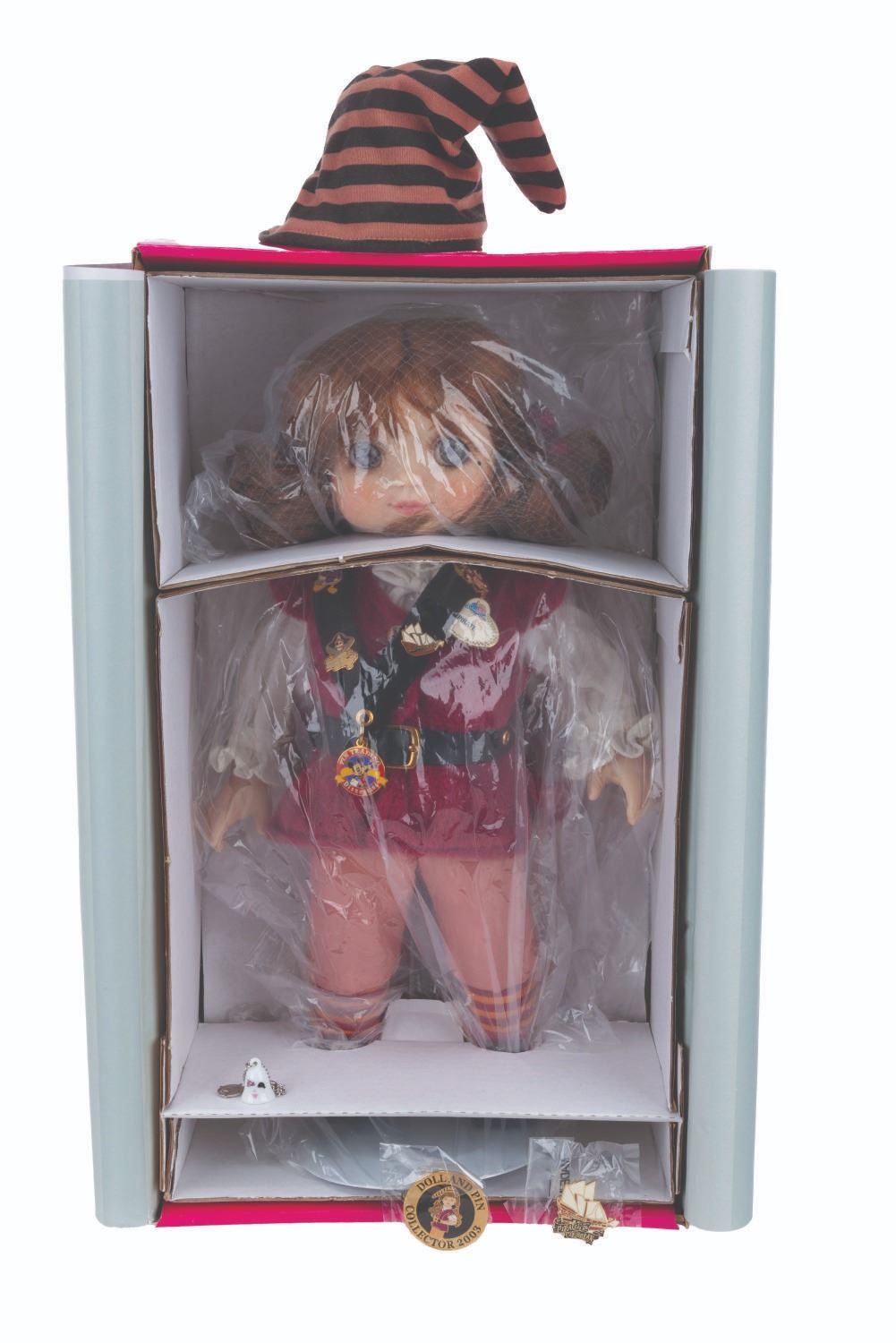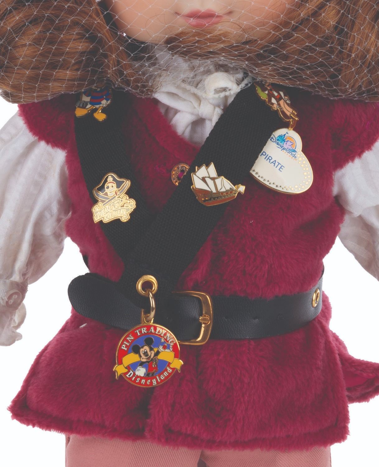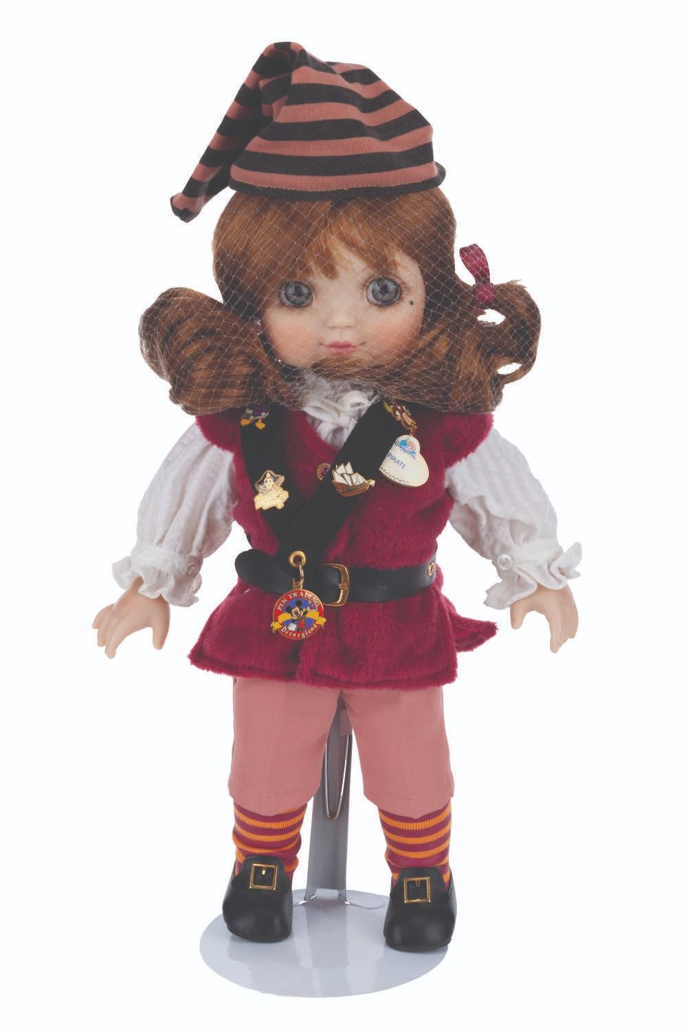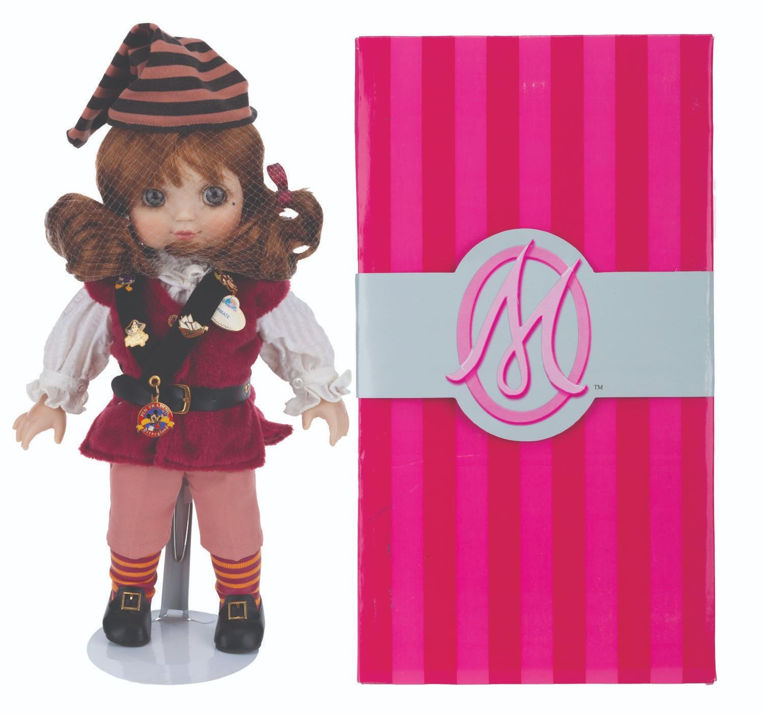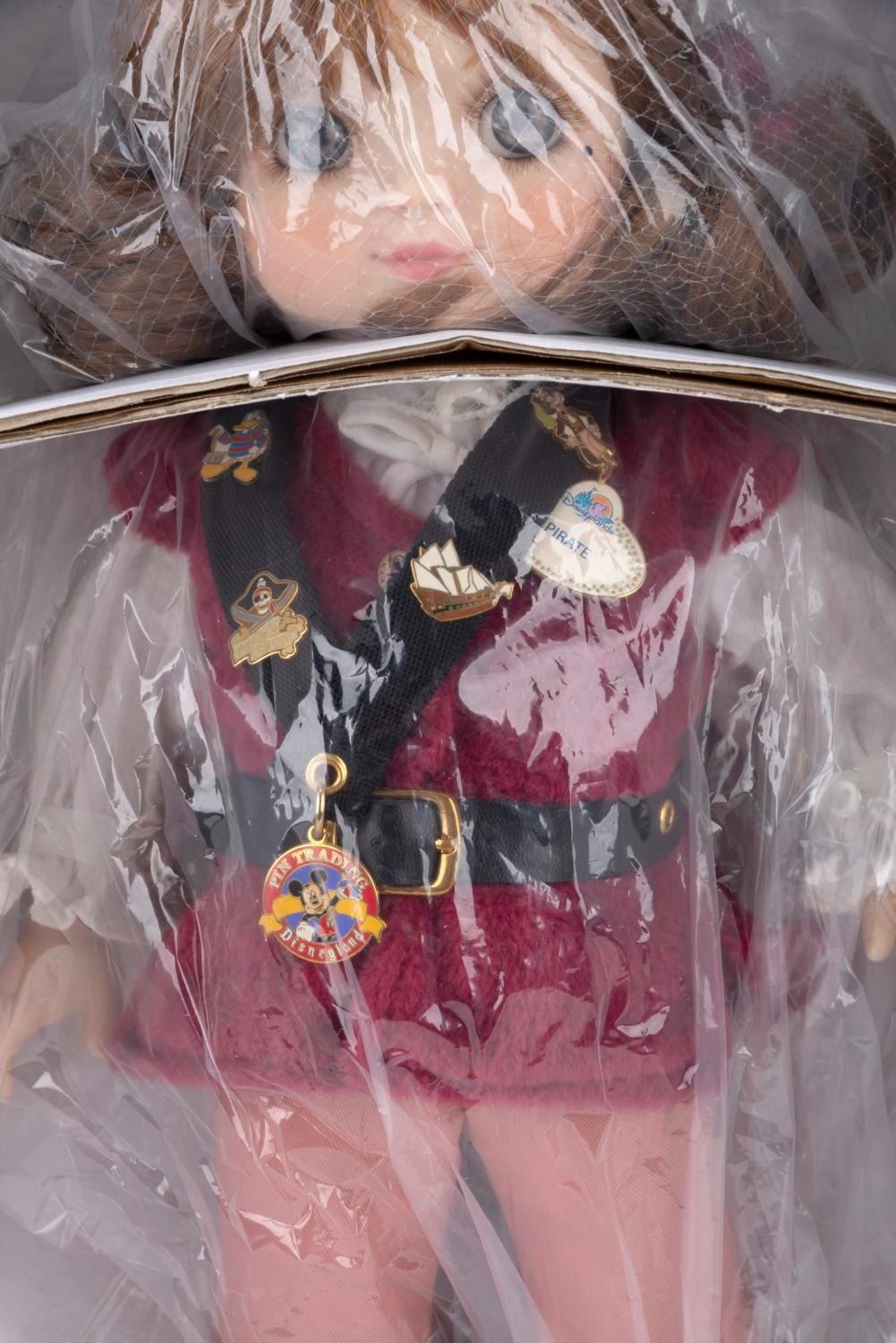 (Disneyland, 2003) A limited edition Adora Belle Pirates of the Caribbean doll by Marie Osmond. The doll, numbered 314/1000, features a meticulously tailored costume like those worn by Cast Members, a charm bracelet, a Pirates of the Caribbean pin, and a Doll and Pin Collector 2003 pin. Measuring 15.5" tall, the doll is in fine condition and comes with its original box.