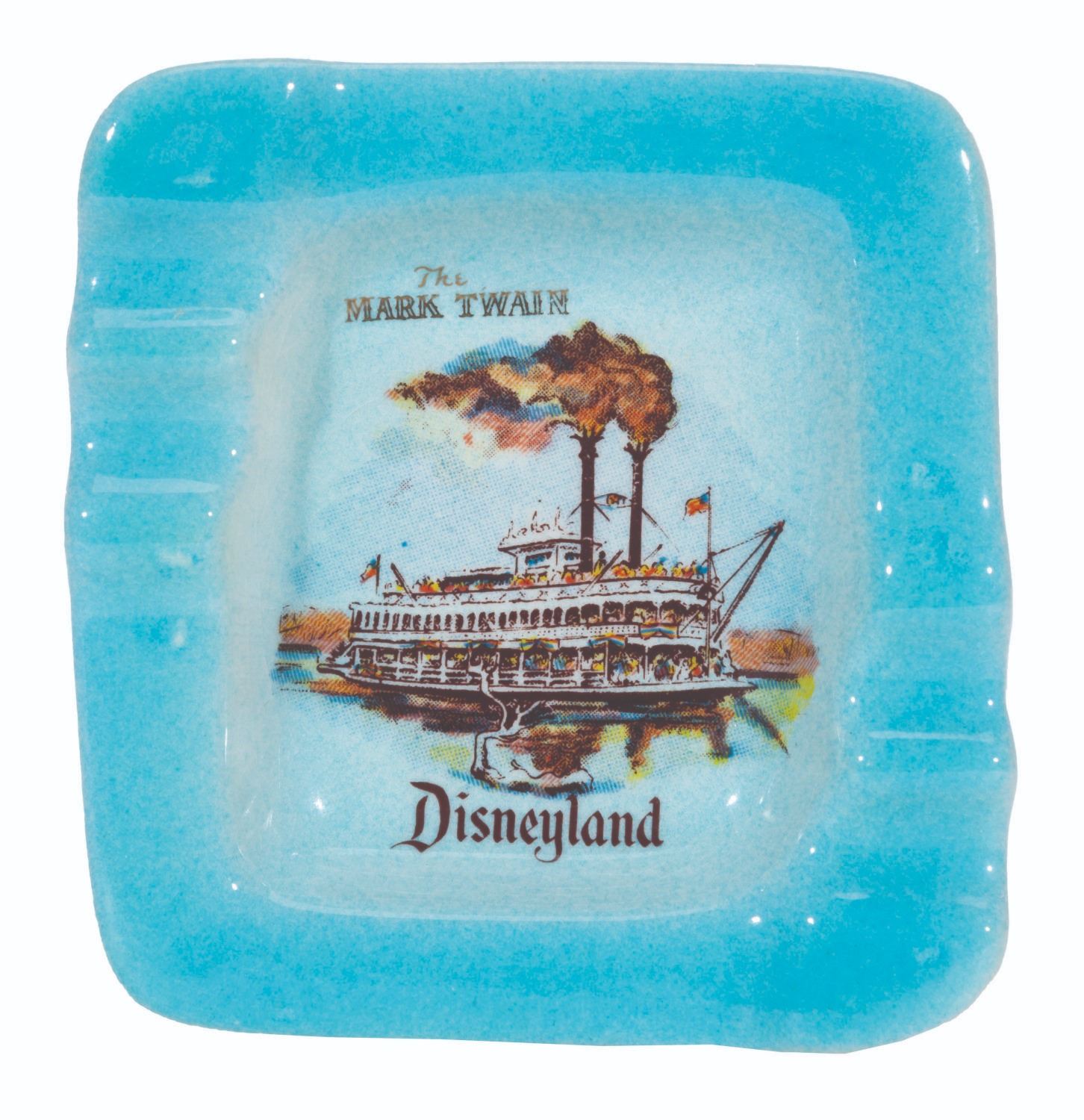 (Disneyland, 1955) A souvenir ashtray of the Mark Twain Riverboat at Disneyland. The four-toned vignette of the Frontierland attraction is accented with gold leaf lettering and centered within the glazed ceramic ashtray. This souvenir was made exclusively for Disneyland by local Monterey artists at Eleanor Welborn Art Productions. Measuring 3.75"x4" and under 1" deep, this souvenir of Disneyland features four holders and displays in very good condition with minor crazing throughout.