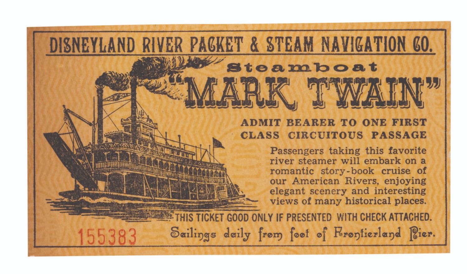 (Disneyland, 1955-56) An admission ticket for the Steamboat Mark Twain in Frontierland at Disneyland. Measuring 4.75" x 2.5", the ticket numbered "155383" is in very good condition with light wear and smudges to the left edge.