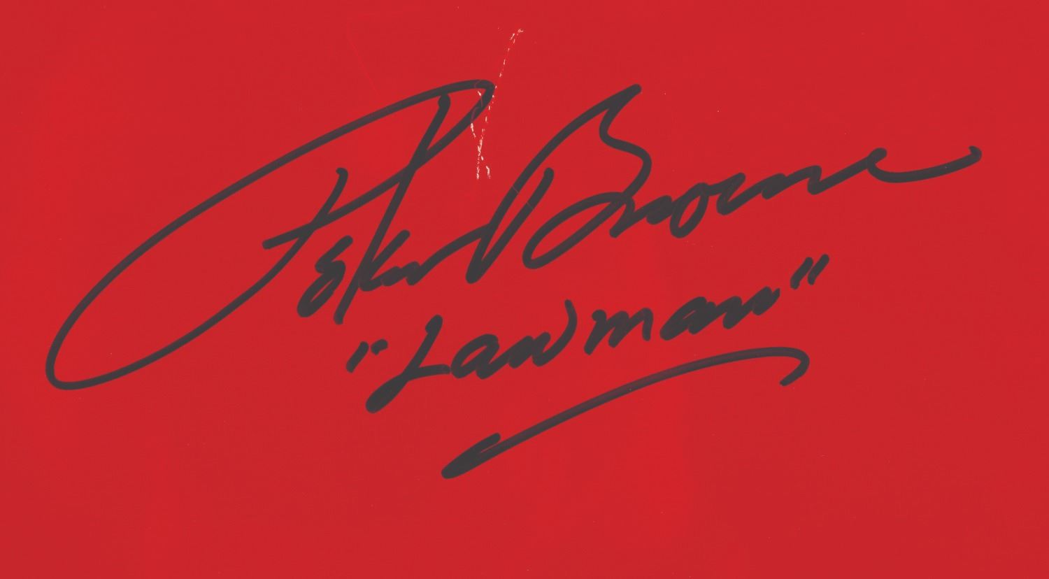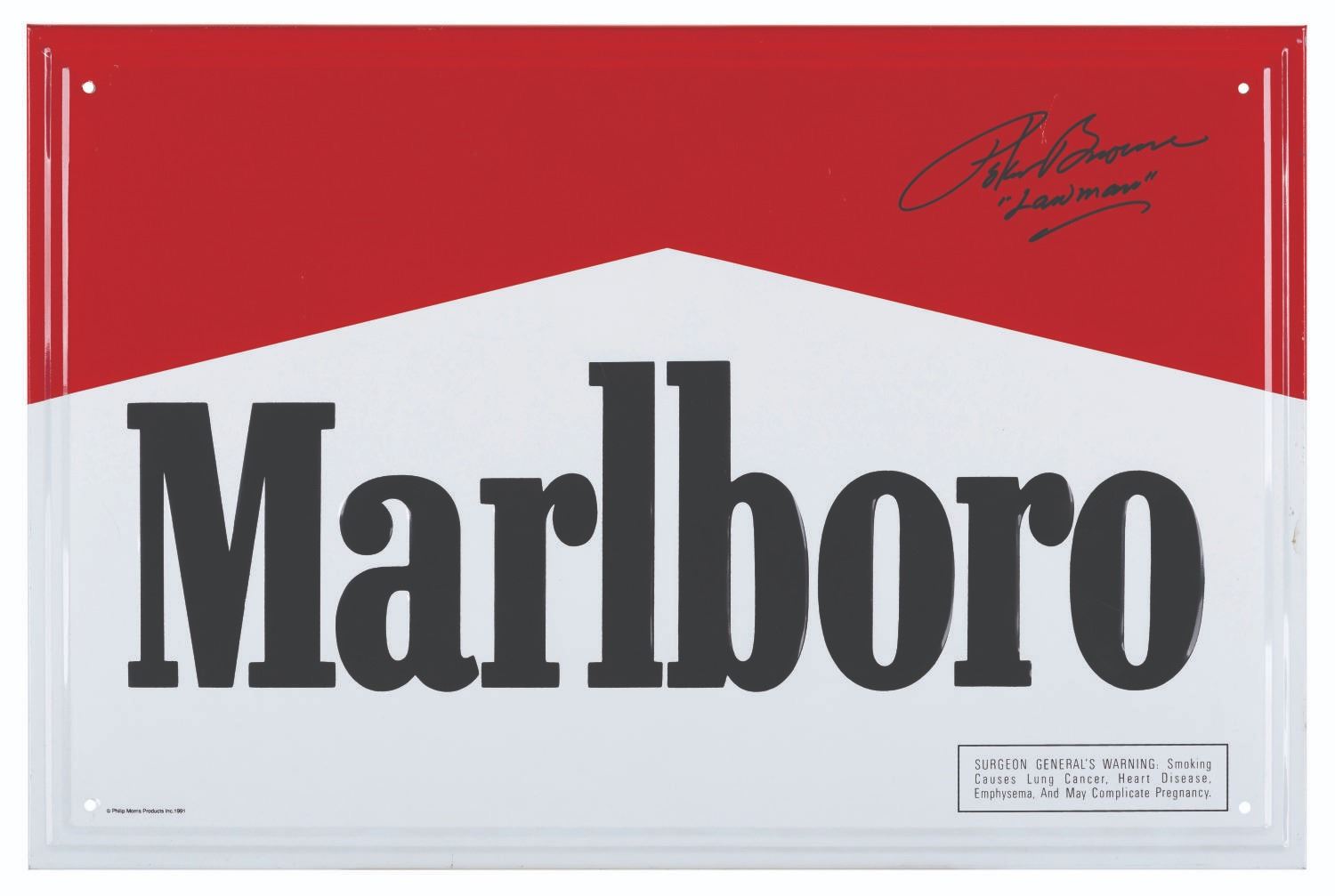 (Marlboro, 1991) A Marlboro cigarettes sign autographed by Peter Brown, star of the western series "Lawman" in 1958. The autographed aluminum sign is in very good condition with light wear from display, including a small scratch by the signature.