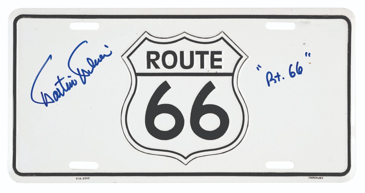 (Martin Milner, 1990s-2000s) A Route 66 souvenir license plate signed by actor Martin Milner. From 1960 to 1964, Milner starred as Tod Stiles on the CBS TV series "Route 66" named after the iconic American roadway. Measuring 6" x 11.75", the license plate with signature is in very good condition with light scuffs.