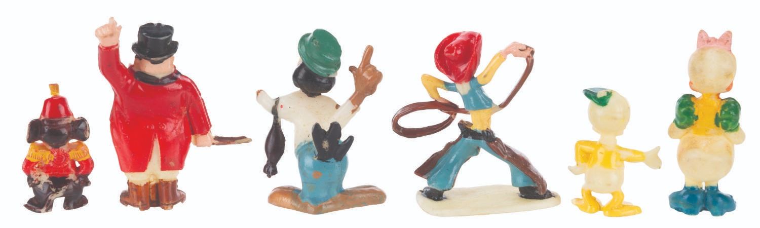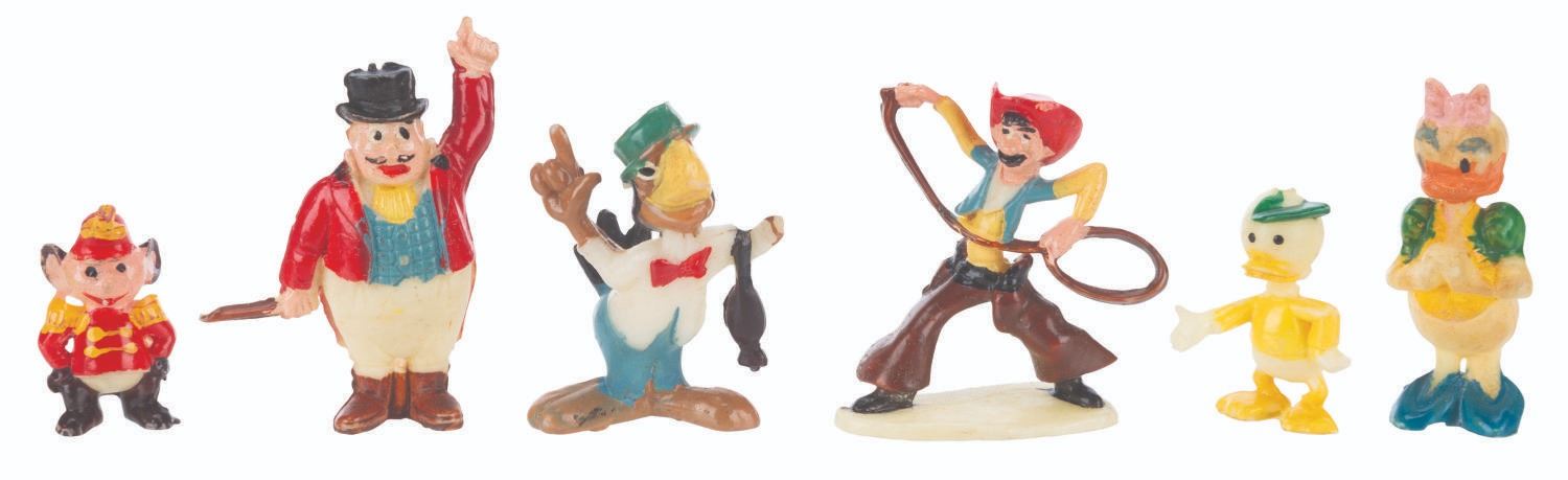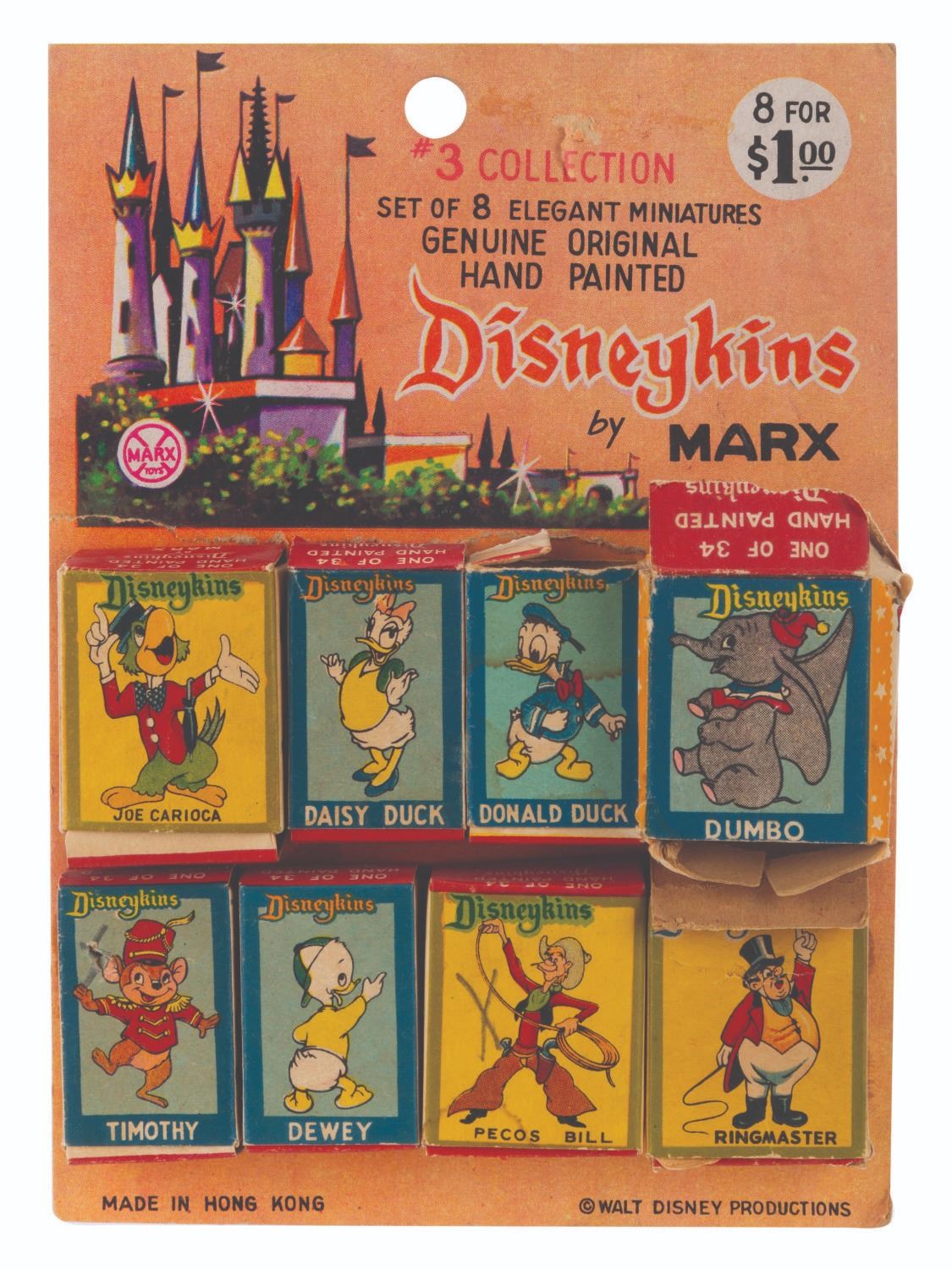 (Marx, 1961) A set of hand-painted No. 3 Collection Disneykin figurines by Marx. The individual first series boxed figurines include Jose Carioca, Daisy Duck, Donald Duck, Dumbo, Timothy Q. Mouse, Dewey, Pecos Bill, and the Ringmaster. The set is incomplete, as the Donald and Dumbo figurines are missing. Measuring 5" x 7", the set is in good condition with tears, creases, scuffs, discoloration, and wear, notably on the Donald and Dumbo boxes, which are missing their figures.
