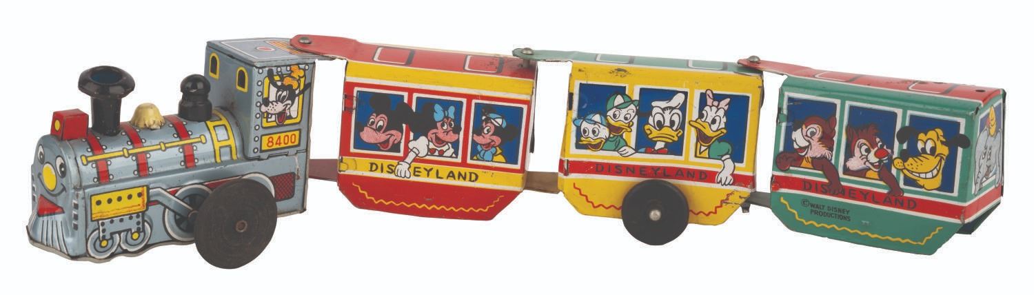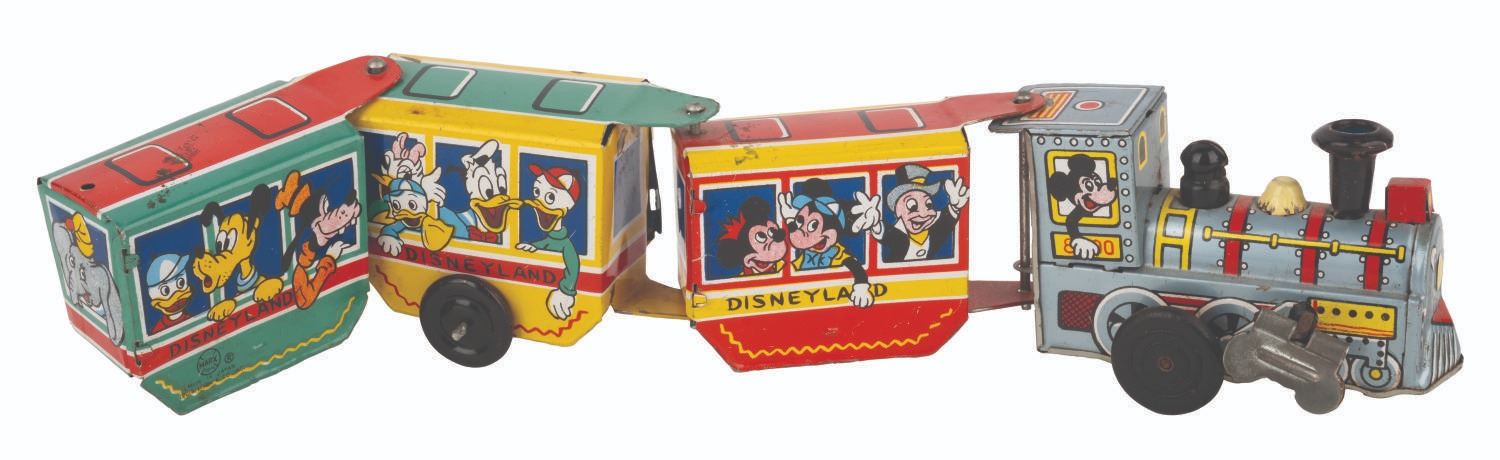 (Marx, 1969) A tin-litho Disneyland wind-up toy train manufactured by Marx. With a Casey Jr. engine and three cars with Disneyland banners and characters on both sides, the train circles when wound. Measuring 2" x 2.25" x 12.75", the toy is in good, working condition with light oxidation, scratches, scuff, smudges, and wear from play.