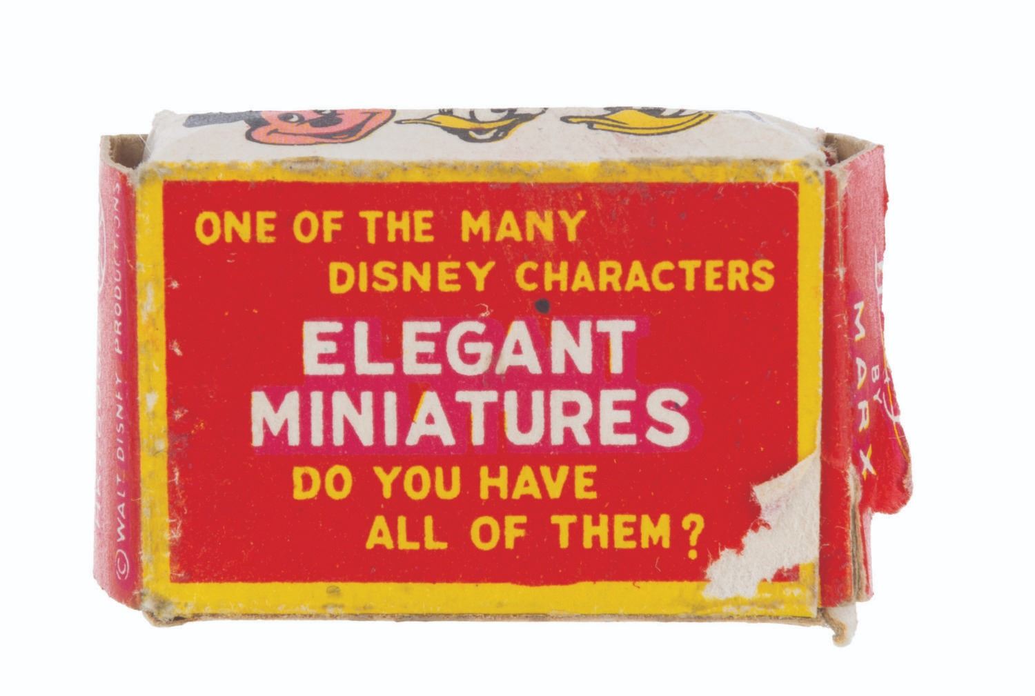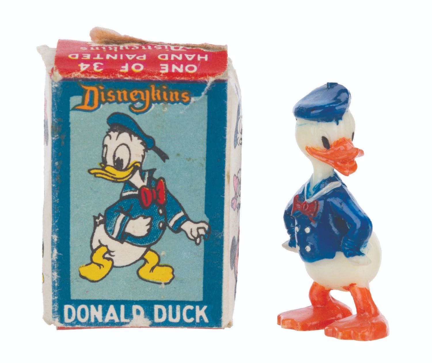 (Marx, 1960s) A miniature Donald Duck Disneykin figurine with the original box. Measuring 1.5” tall with its original 1” x 1.5” box, the figurine is in very good condition with light wear, while the box exhibits tears, creases, separation, and heavy wear.
