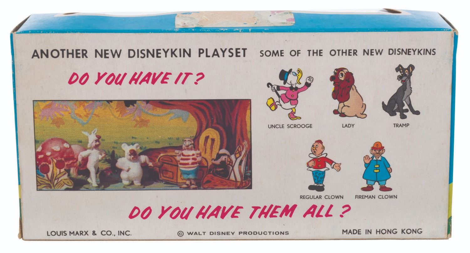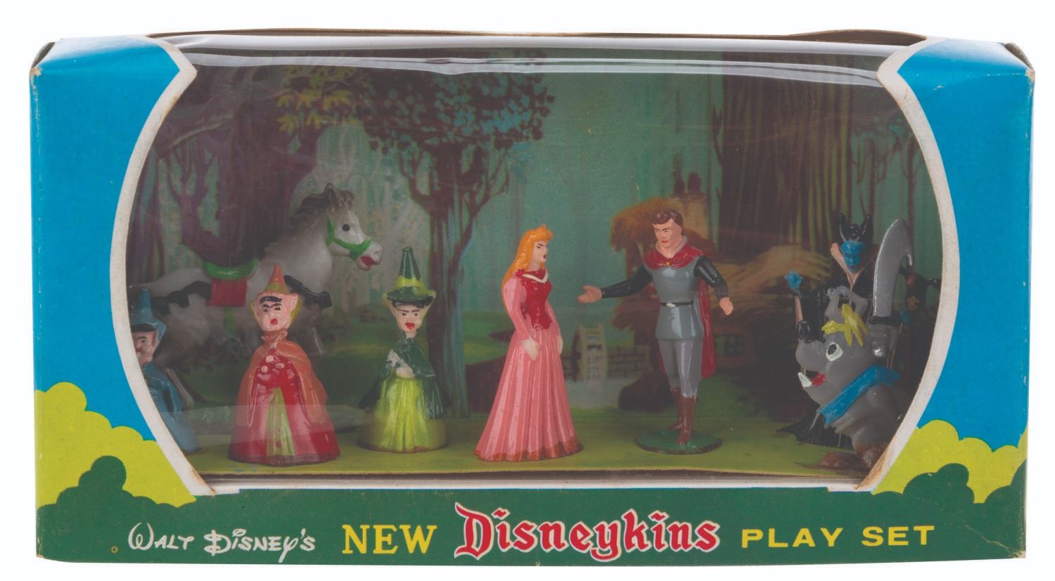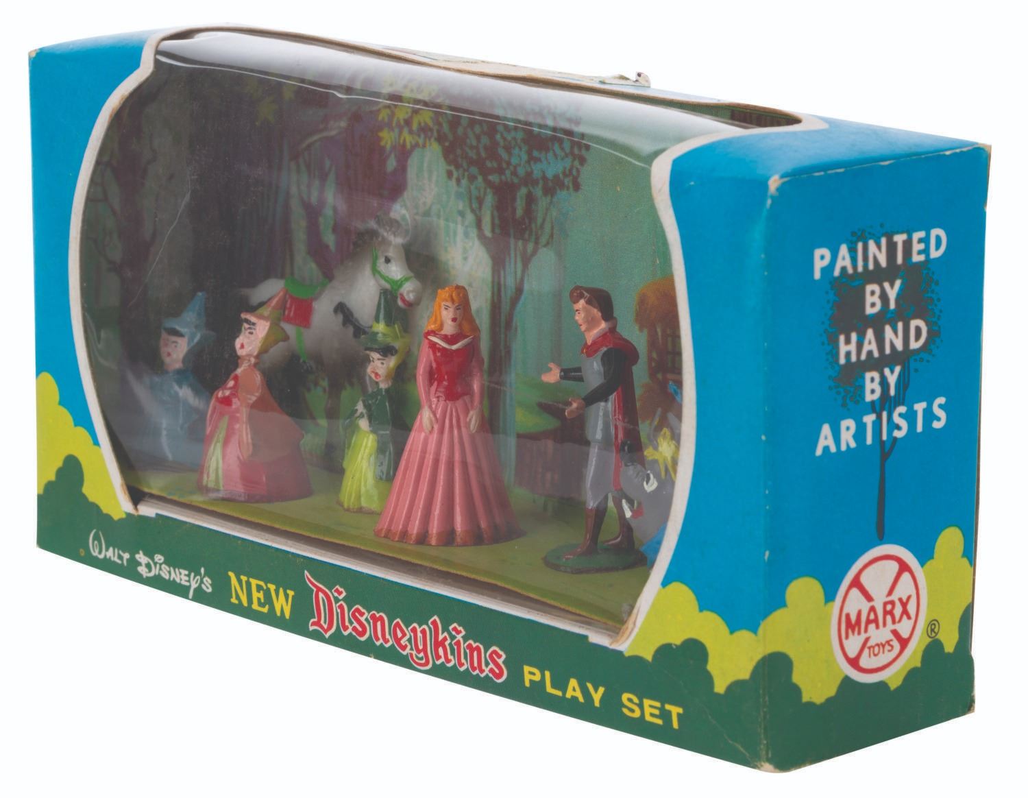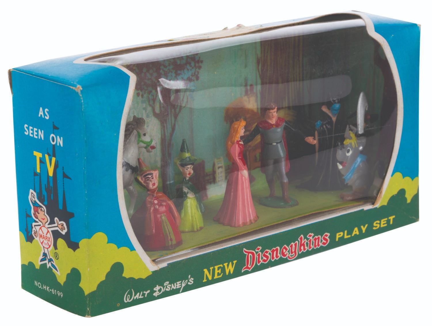 (Marx, 1961) A rare second series “Sleeping Beauty” Disneykins Play Set including miniature figurines of Merryweather, Flora, Fauna, Samson, Princess Aurora, Prince Phillip, a goon, and an especially rare Maleficent. Ranging in size from 1.5” to 2” tall in their original 6.25” x 1.75” x 3.5” tall box, the set displays in very good condition with glue stains on the bases, paint loss from age, light warping on the box, creases, and material loss on the top from adhesive removal.