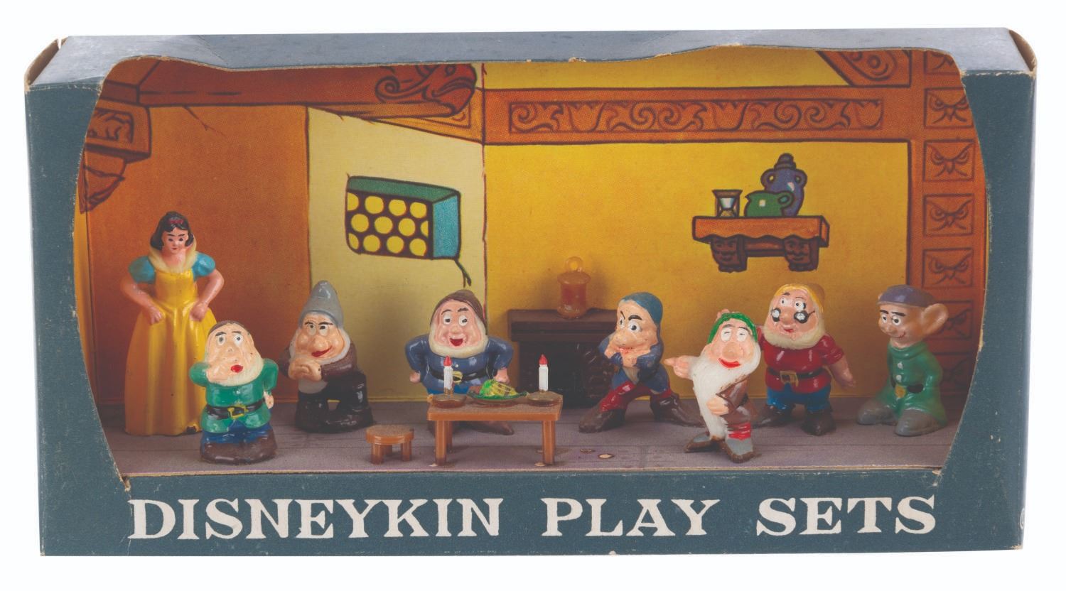 (Marx, 1961) A “Snow White and the Seven Dwarfs” Disneykins Play Set from the first series in 1961. The play set with a Dwarf cottage backing includes figurines of Snow White and each of the Dwarfs. Measuring 1” x 1.75” each in the original 6.25” x 1.5” x 3” box, the figurines are in very good condition with minor imperfections to the paint from manufacturing, and light wear and creasing to the box.