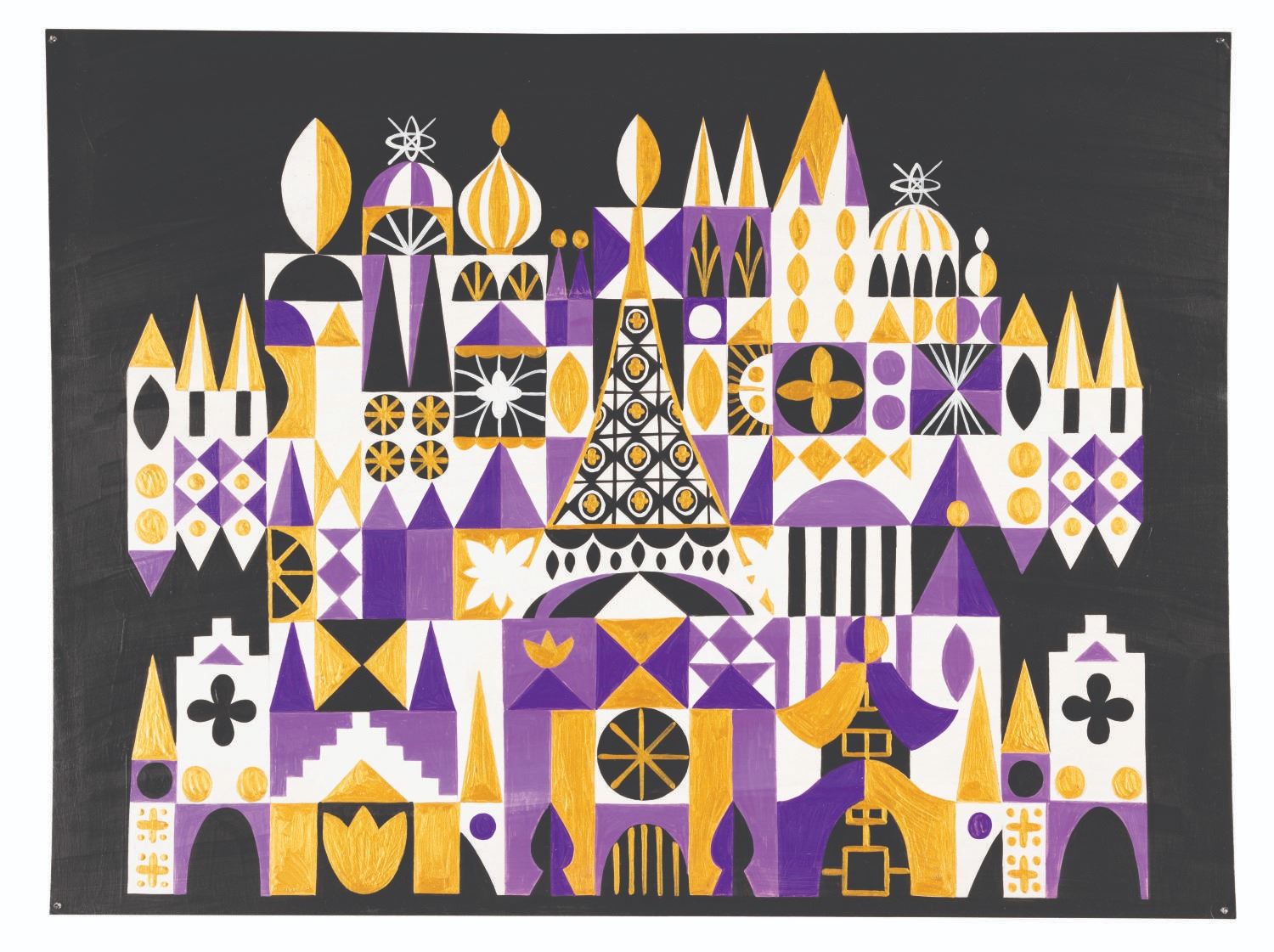 (Disneyland, 1965) An original concept painting by Disney Legend Mary Blair for Disneyland's It's a Small World, depicting Blair's stylized concept for the attraction's iconic facade. After its incredible success at the 1964-65 New York World's Fair, Walt Disney wanted to bring It’s a Small World to Disneyland as a permanent installation and chose Blair, who also contributed heavily to the original World's Fair iteration, to design the attraction's exterior. Measuring 15" x 20", accomplished in gouache on artist’s board, this piece is in fine condition with pin holes in the corners.