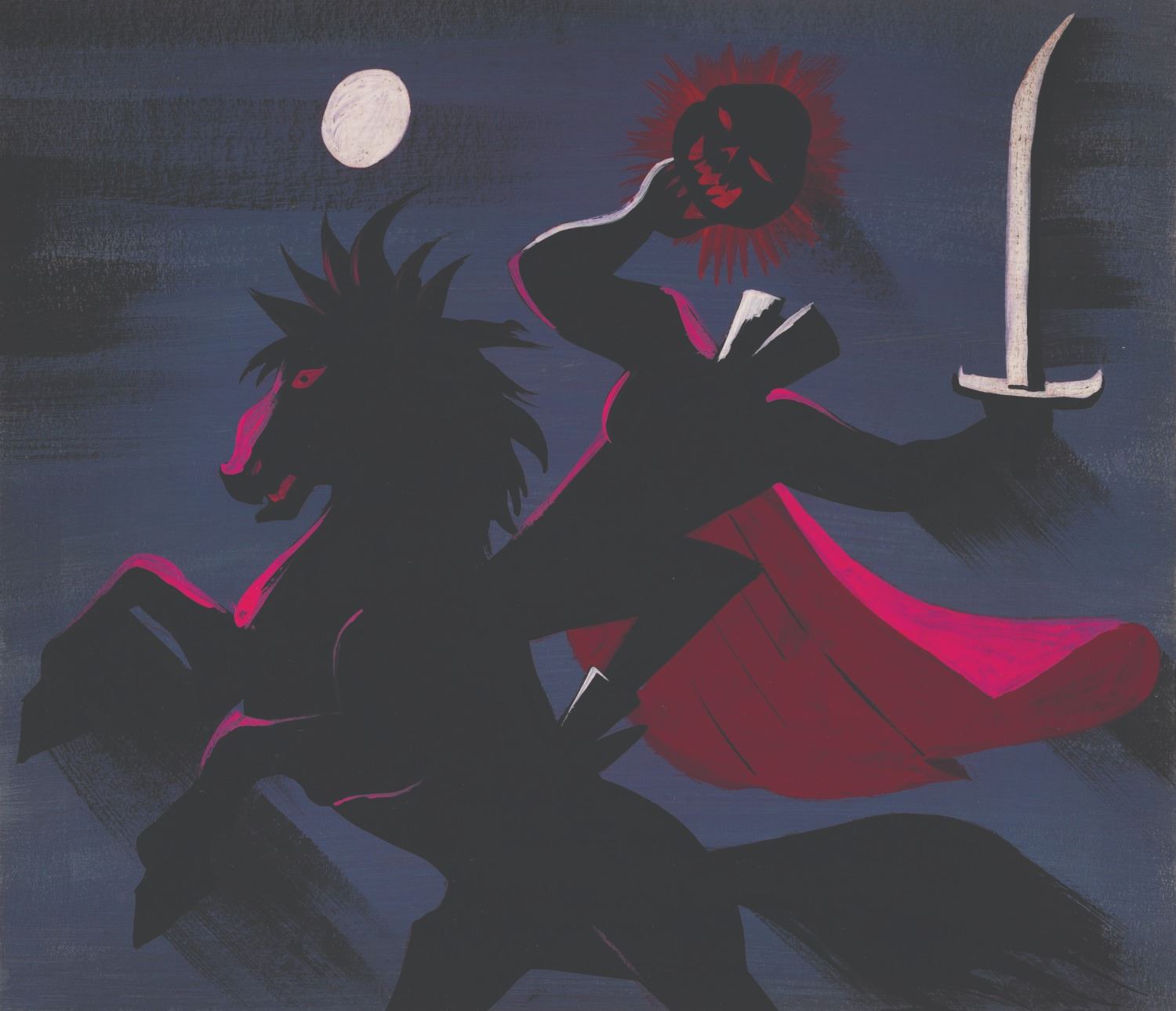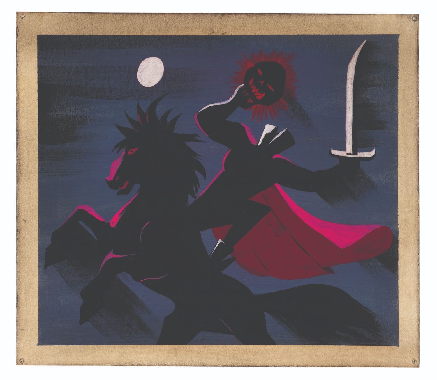 (Disney, 1949) An original concept painting by Disney Legend Mary Blair of the Headless Horseman for “The Adventures of Ichabod and Mr. Toad.” In this painting, the terrifying chase between the Headless Horseman and Ichabod Crane comes to a head with Blair expertly contrasting the dramatic burgundy of the Horseman’s cloak against an inky black sky lit only by the moon. Accomplished in gouache, the piece has a painted image size of 8.25" x 9.25" on an artist's board measuring 9.25” x 10.5”, and displays in very good condition with light wear and pinholes at the corners from production use.