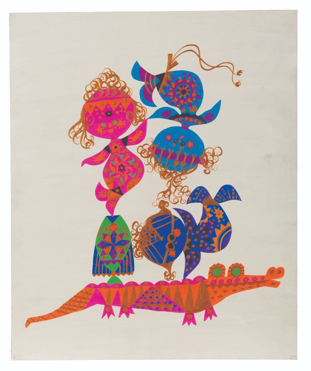 (Disneyland, 1965) An original concept painting by Disney Legend Mary Blair for Disneyland's It's a Small World. After its incredible success at the 1964-65 New York World's Fair, Walt Disney wanted to bring It’s a Small World to Disneyland as a permanent attraction and chose Blair, who contributed heavily to the original World's Fair iteration, to design the Park version. The painting depicts a trio of colorful mermaids with golden hair flowing as if underwater, perched atop a crocodile. The gold paint has a metallic sheen, which creates a striking effect against the rest of the vibrant matte colors. Measuring 14" x 17" with an image size of 13" x 13.75", accomplished in gouache on artist’s board, this piece displays in fine condition with pinholes in the corners.