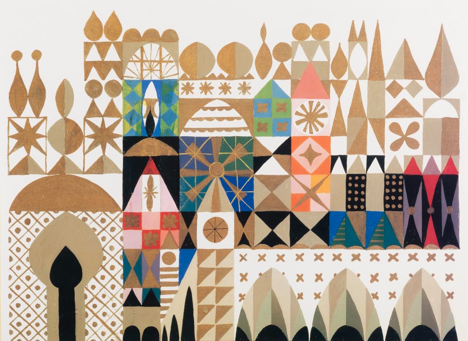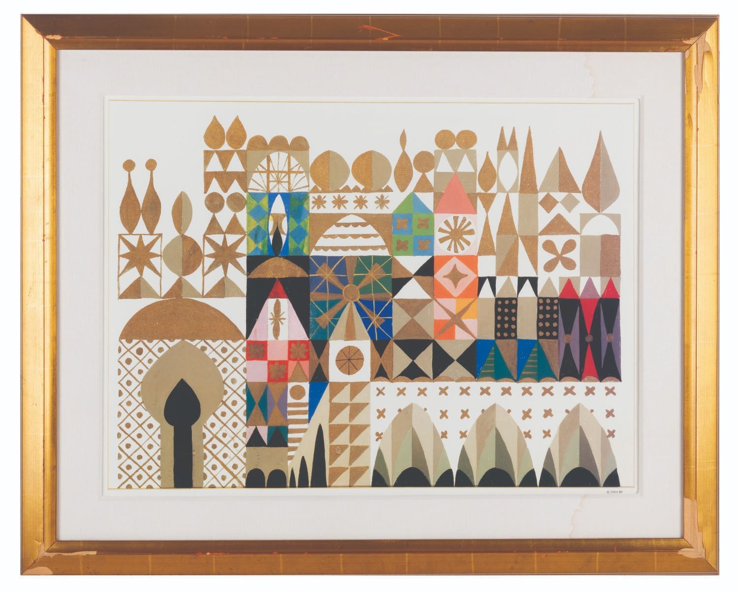 (Disneyland Hotel, 1960s) A print of Mary Blair's concept artwork for "It's a Small World" that was displayed at the Disneyland Hotel. The artwork measures 18.5" x 25.25" in the original gold tone 26.5"x33" frame. The art is in very good condition, with the frame in fair to good condition with wear throughout, including scratches and paint loss, and some moisture discoloration to the right side of the matte which didn’t affect the print.