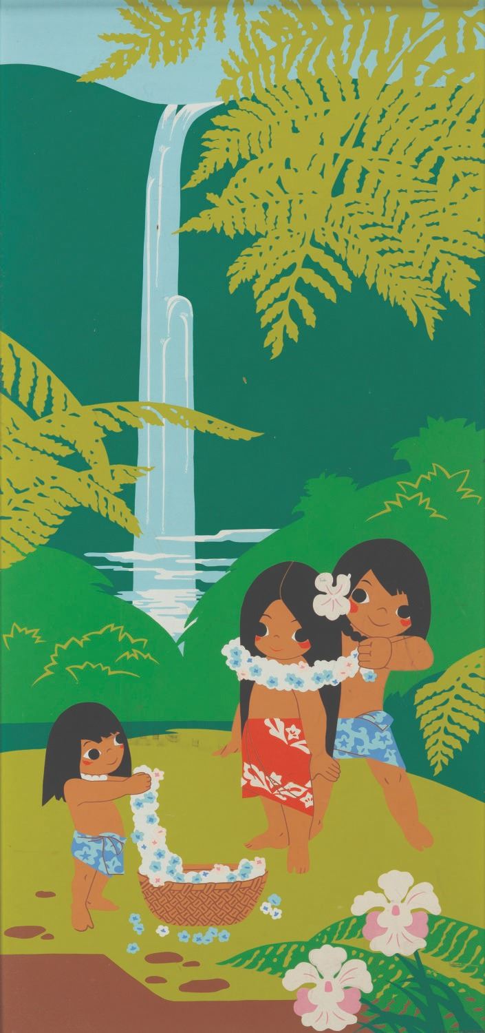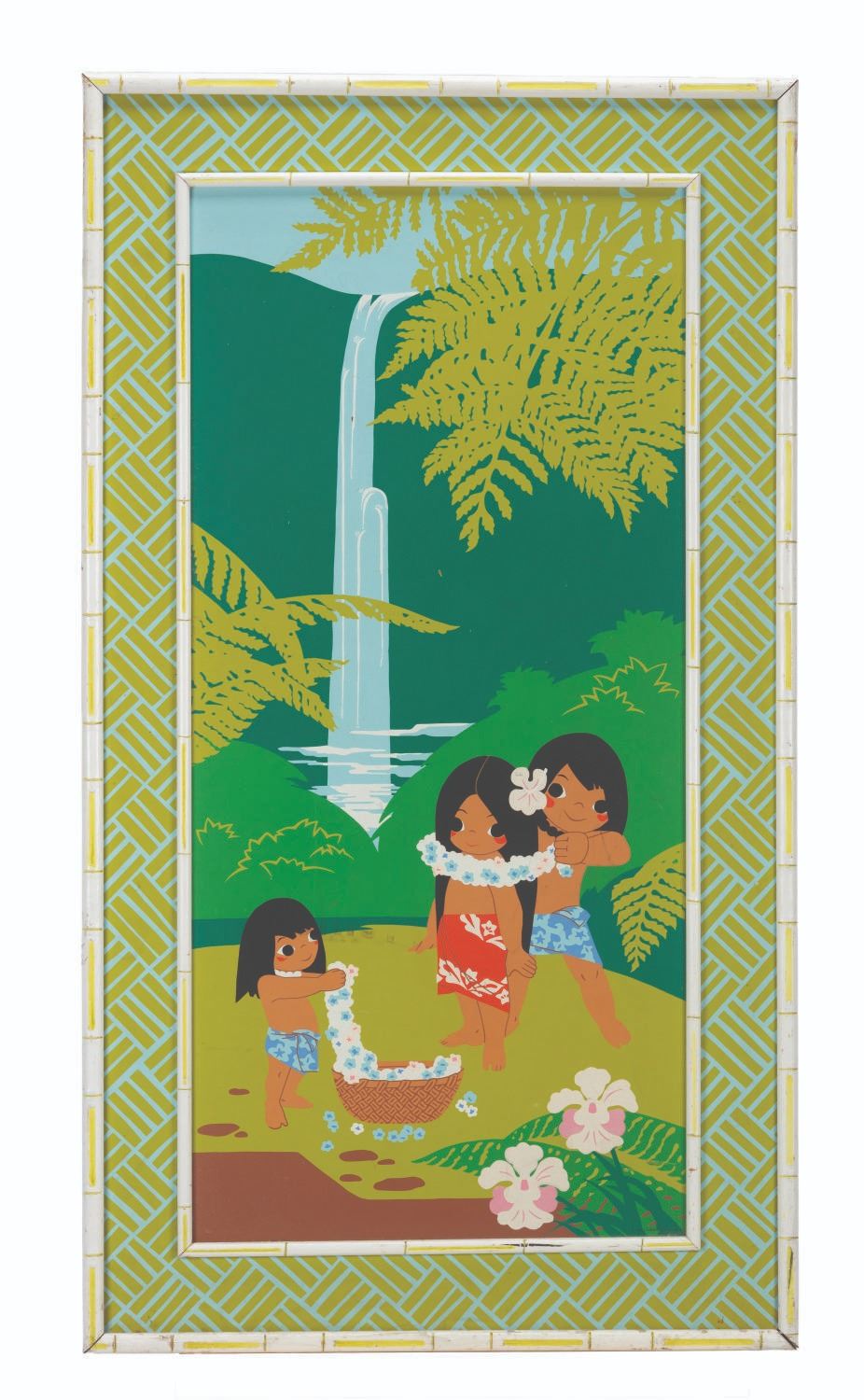 (Disney’s Polynesian Village Resort, 1970s) An oversized silkscreened print of concept art by Disney Legend Mary Blair, displayed in guest rooms at Disney’s Polynesian Village Resort in Walt Disney World. Measuring 17.25” x 37.25” in its original 25” x 45.25” bamboo-inspired frame, the art is in good condition with wear from Resort use, including scratches, scuffs, and heavy stains, notably to the right of the child on the left.