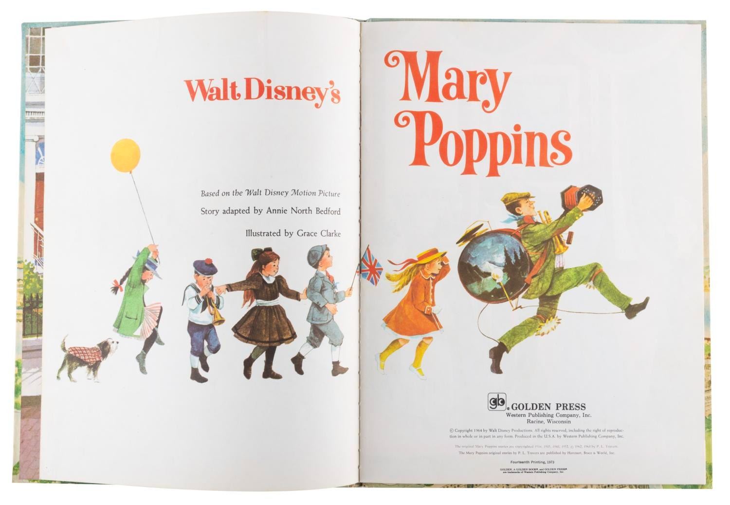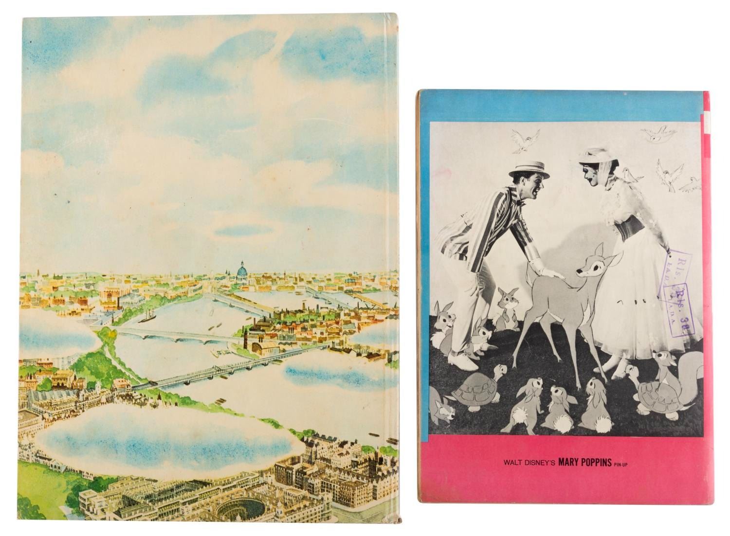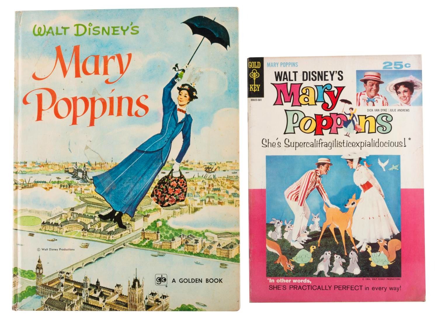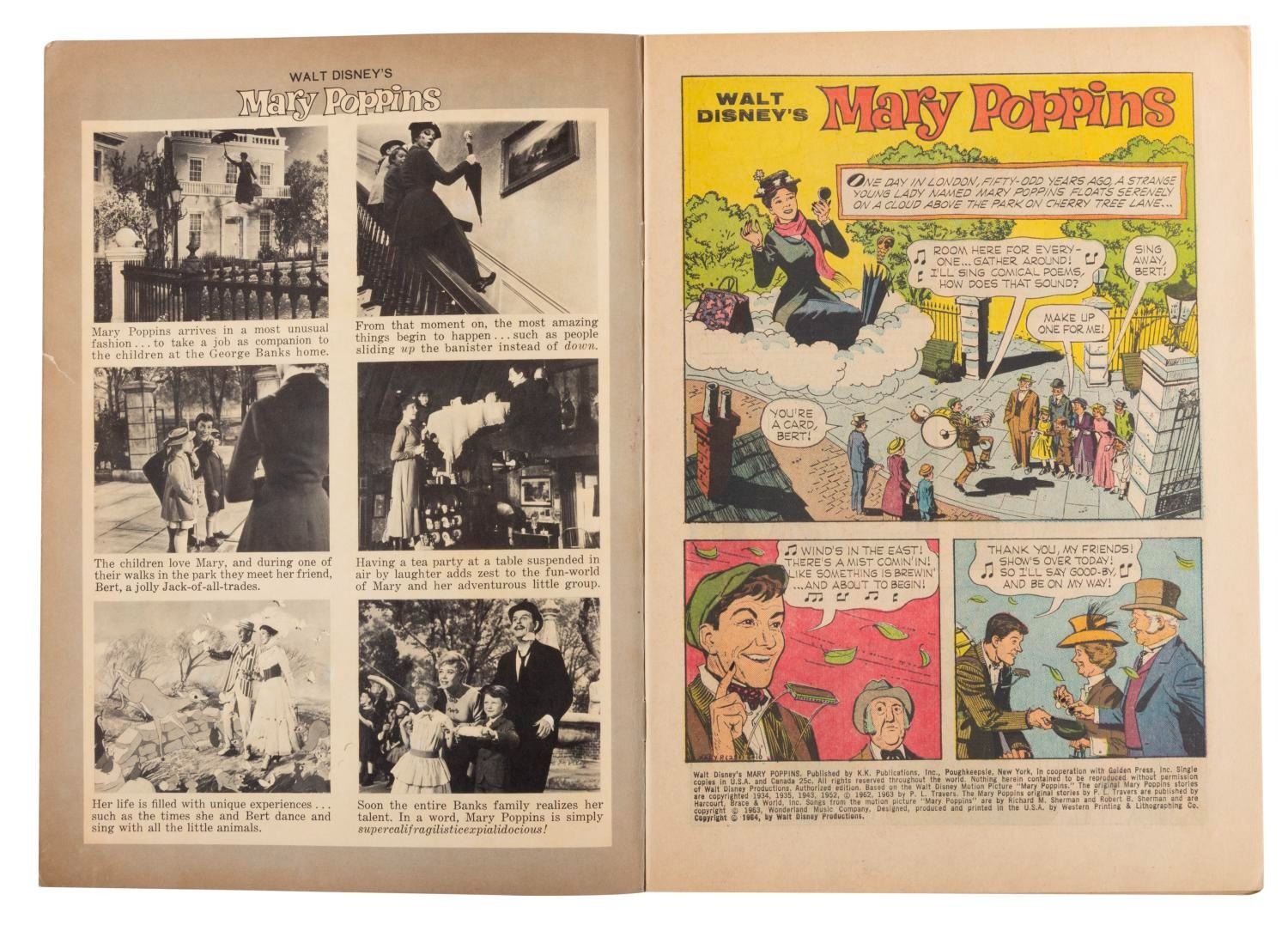 (1964-65, Gold Key/Whitman) A pair of early “Mary Poppins” publications including a 1964 Gold Key comic book, and a 1965 picture book. Both the 7.25” x 10.25” comic book and 9.5” x 12.5” picture book display in fair condition with handling wear and some ink marks and drawings inside the comic, and tape marks scuffing, and edge wear to the cover of the picture book.