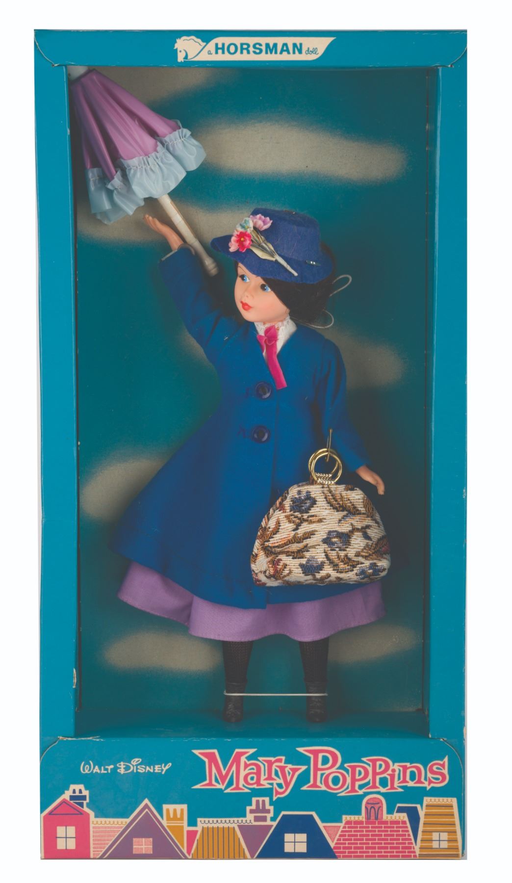 (Horsman, 1964) A Walt Disney's Mary Poppins doll with the original box. The doll, designed by Irene Szor features screen-specific accessories - an umbrella, carpet bag, hat, and coat. The doll is approximately 11.75" tall and comes packaged in the original 18.5" x 9.5" and 3.5" deep box. The doll is in fine as-new condition while the box is in very good condition, exhibiting slight wear.