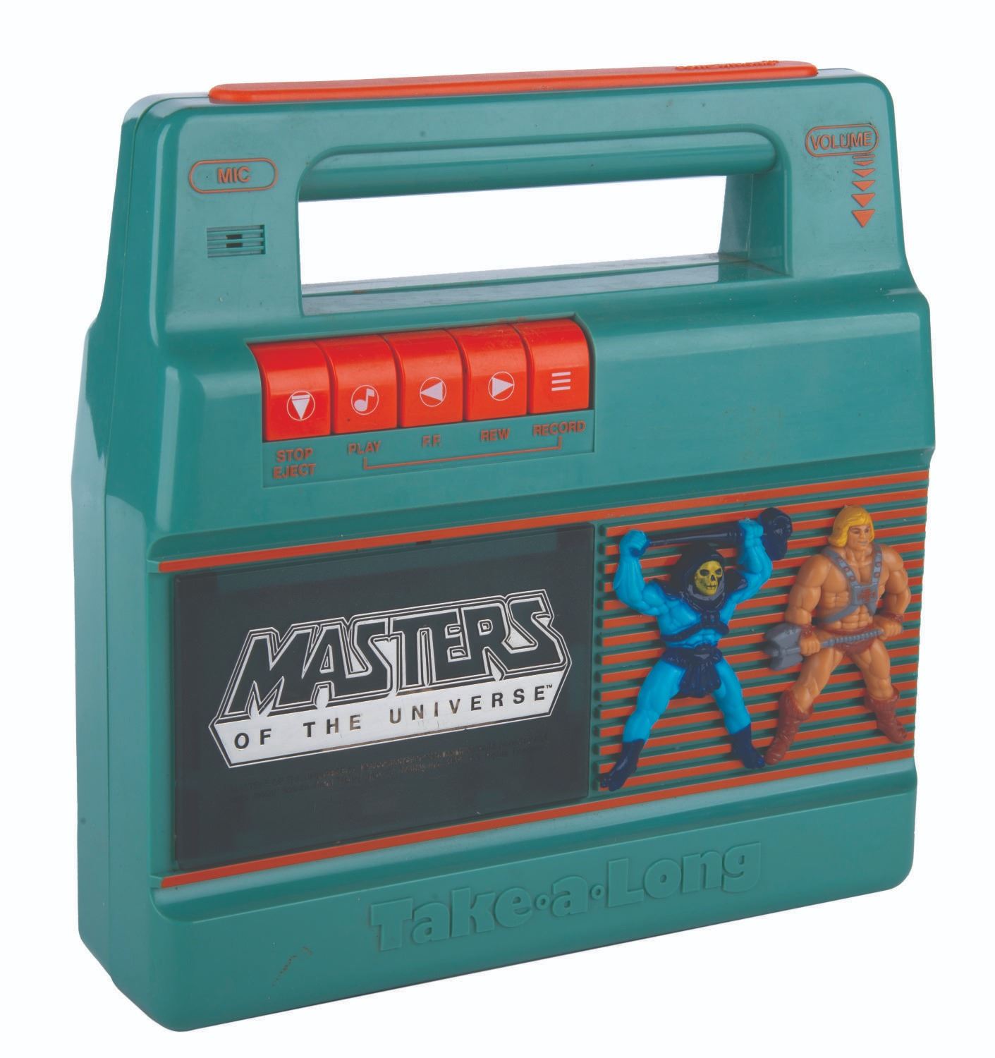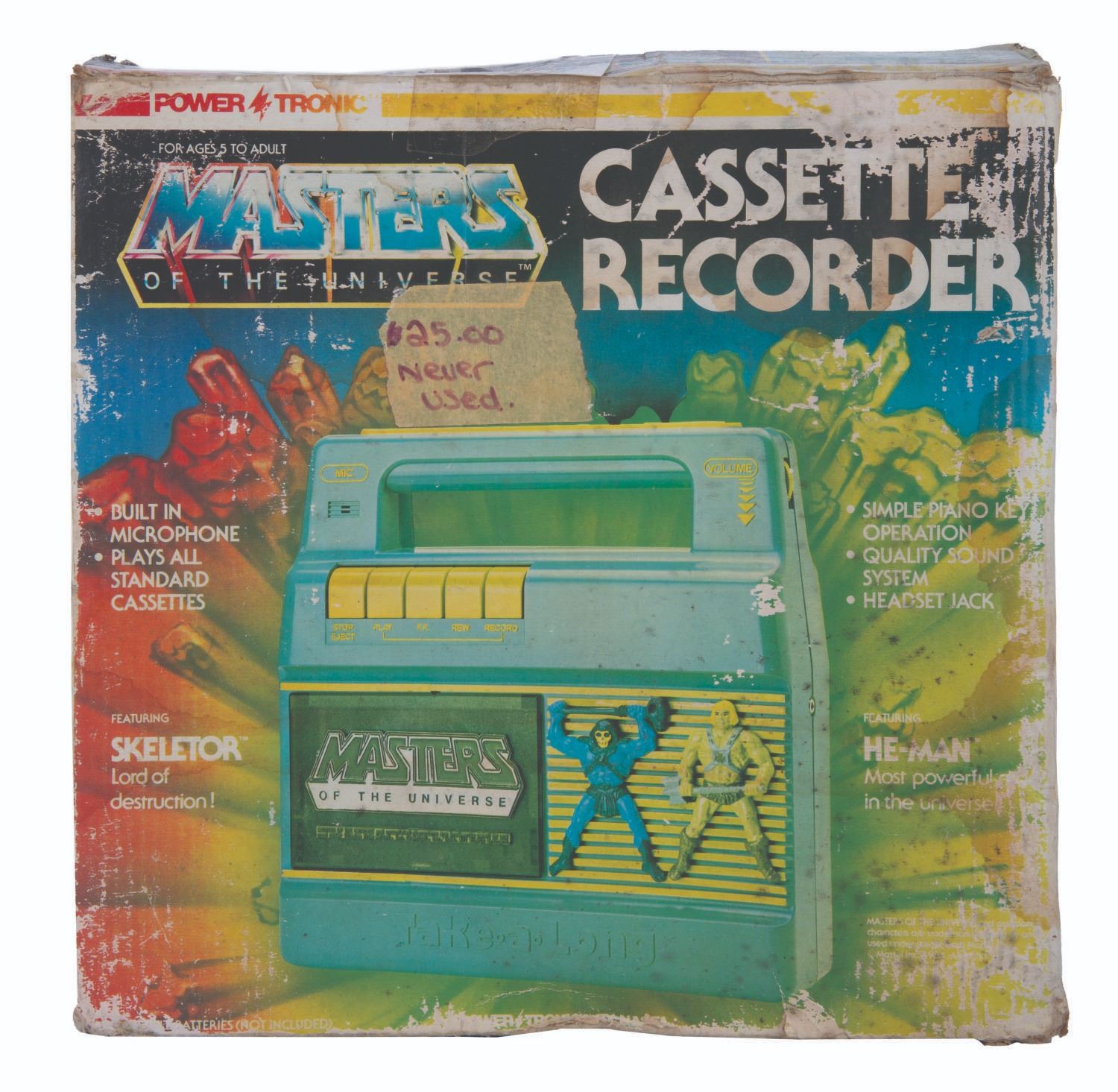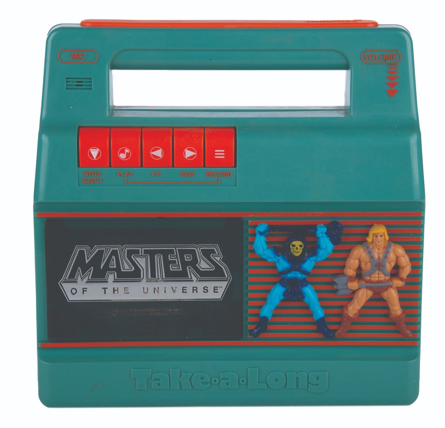 (Mattel/Nasta, 1983) A “Masters of the Universe” cassette recorder. The Take-A-Long recorder features He-Man and Skeletor on the front and a bold “Masters of the Universe” logo on the tape door. When tested, the recorder plays but does not fast forward. Measuring 9" x 9" x 3", the recorder is in good condition with light wear from age and comes with its original poor condition box exhibiting much wear throughout.