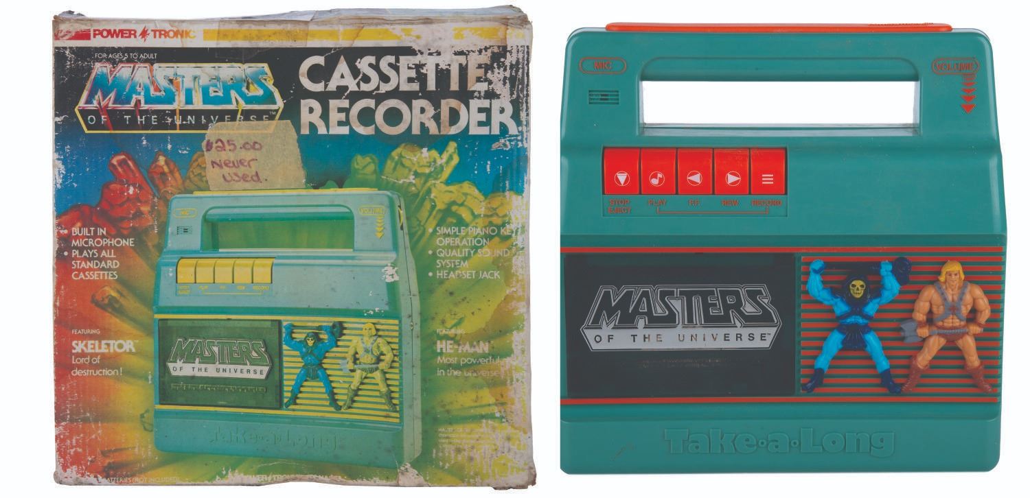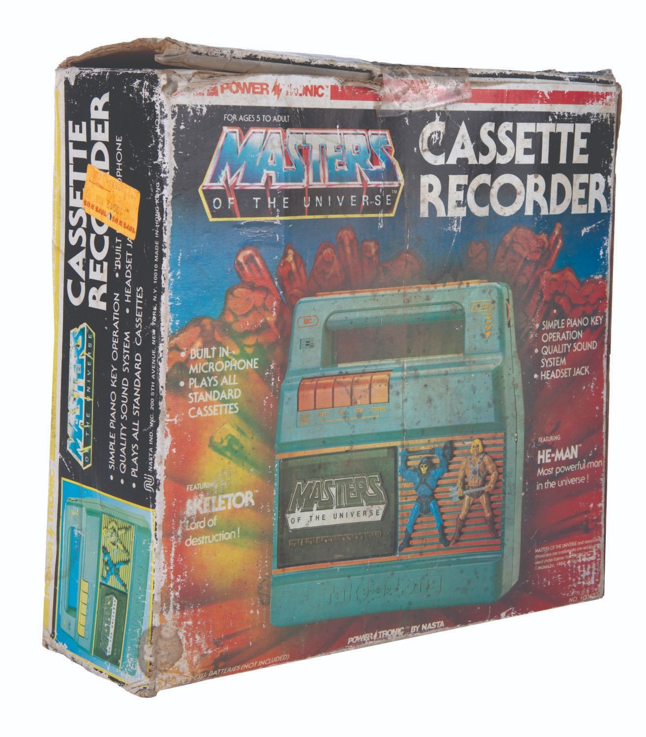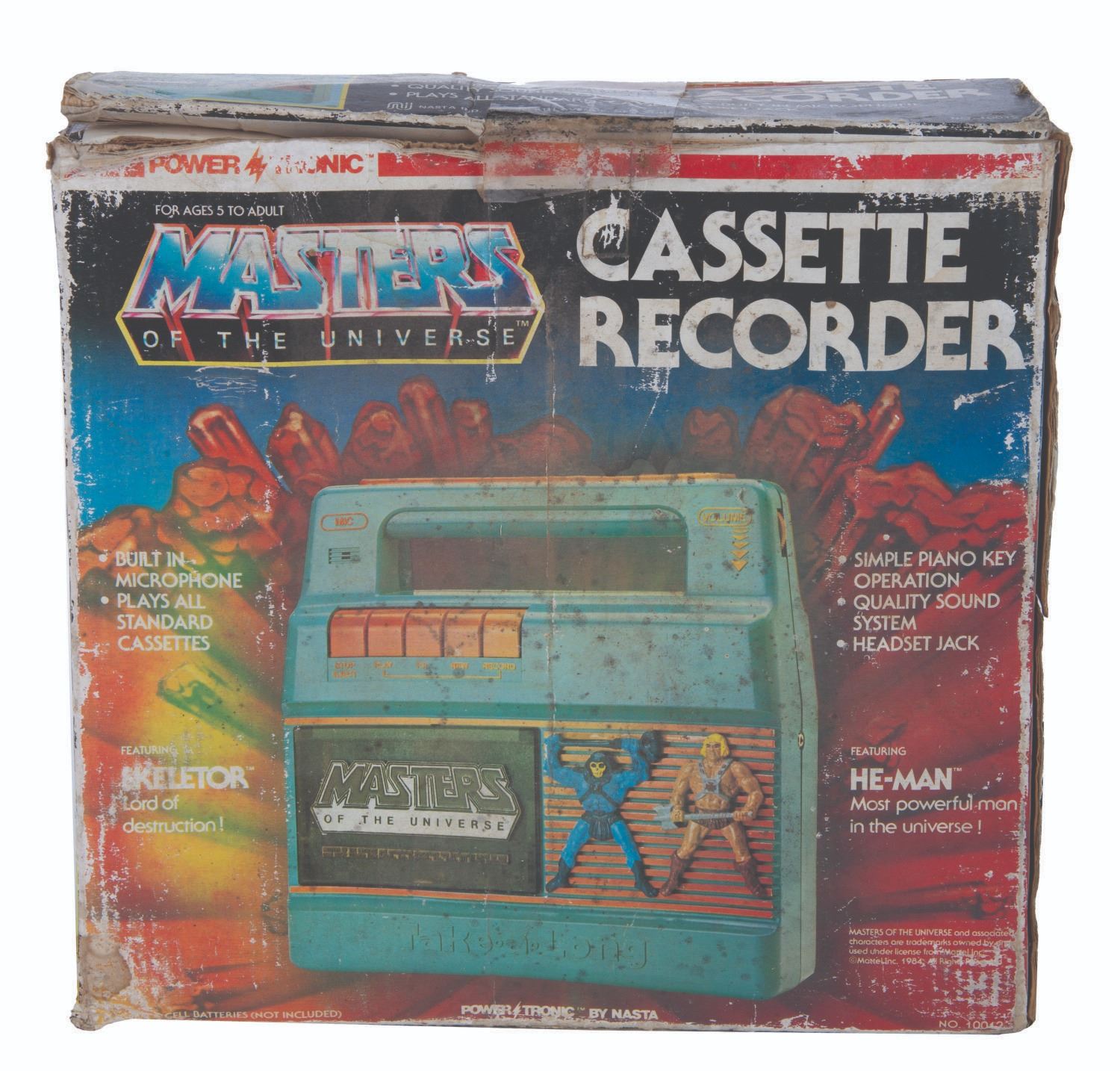 (Mattel/Nasta, 1983) A “Masters of the Universe” cassette recorder. The Take-A-Long recorder features He-Man and Skeletor on the front and a bold “Masters of the Universe” logo on the tape door. When tested, the recorder plays but does not fast forward. Measuring 9" x 9" x 3", the recorder is in good condition with light wear from age and comes with its original poor condition box exhibiting much wear throughout.