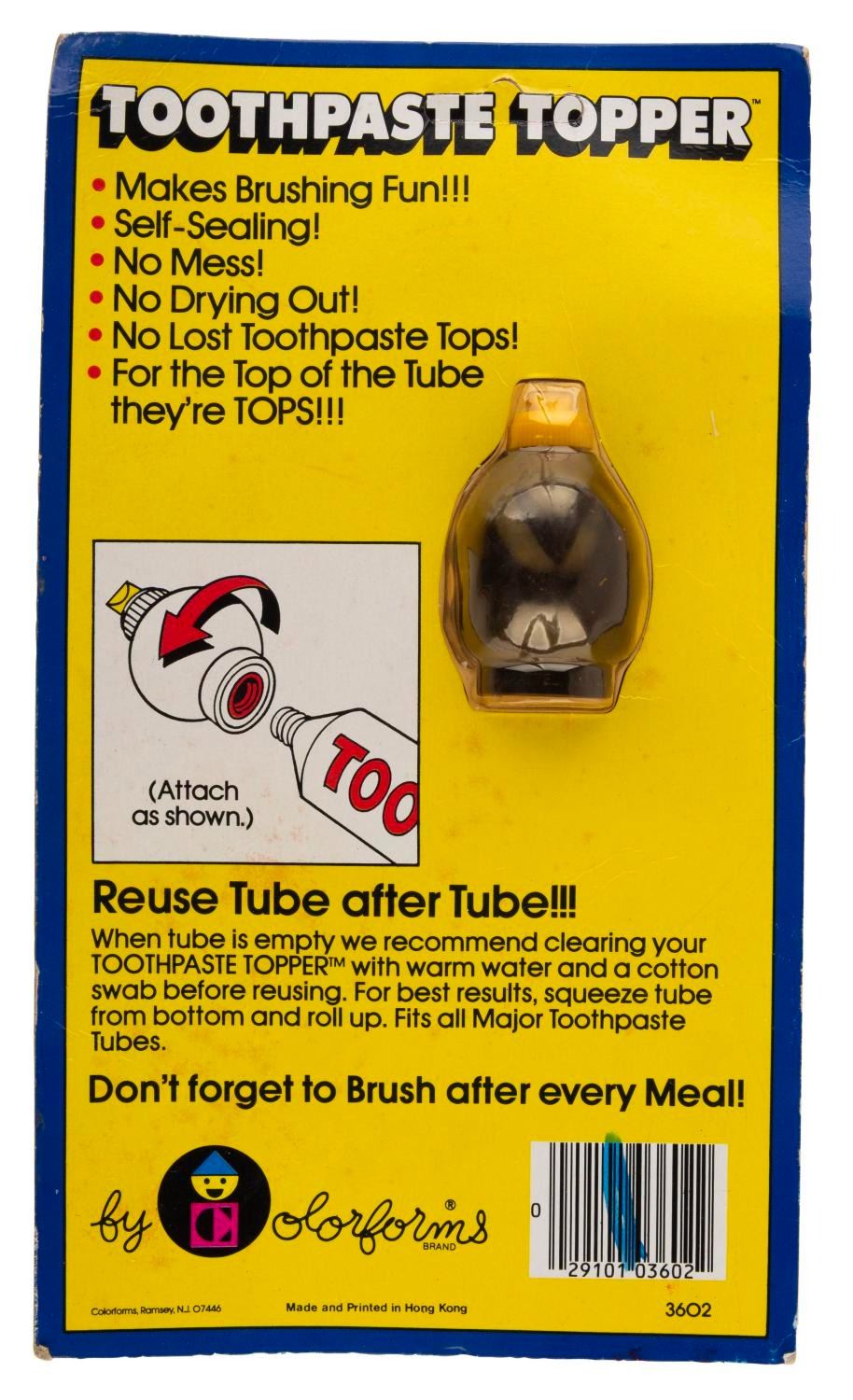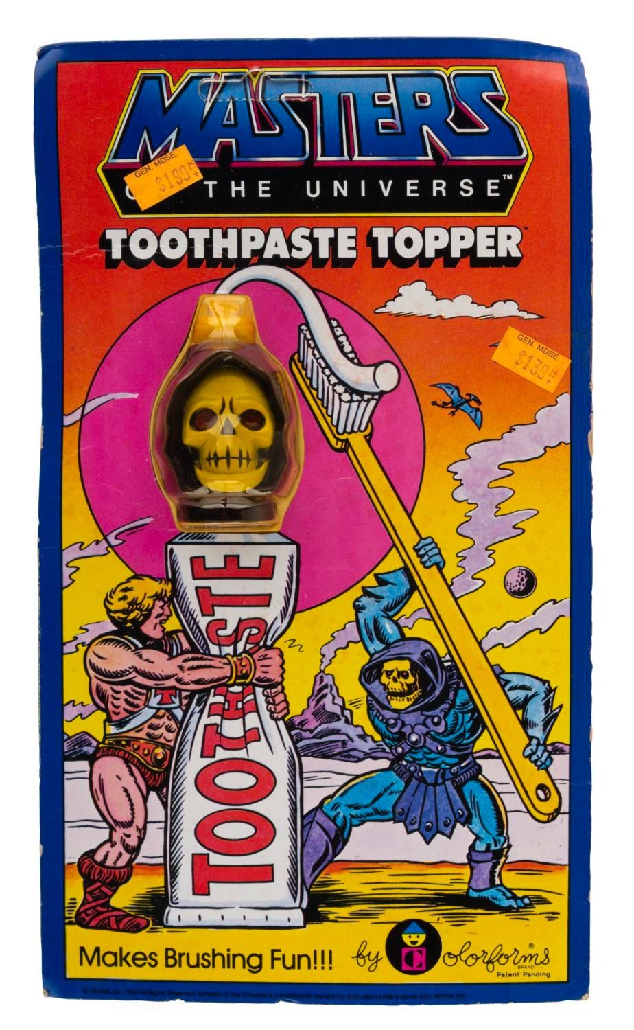 (Colorforms, 1984) A "Masters of the Universe" Skeletor toothpaste topper. The packaging promises "Makes Brushing Fun!!!" and features He-Man and Skeletor working together to fight tooth decay. The toothpaste topper is in fine condition, sealed on the card. The 5.75" x 10" card is in good condition with creases, edge wear, and yellowing to the plastic bubble from age.