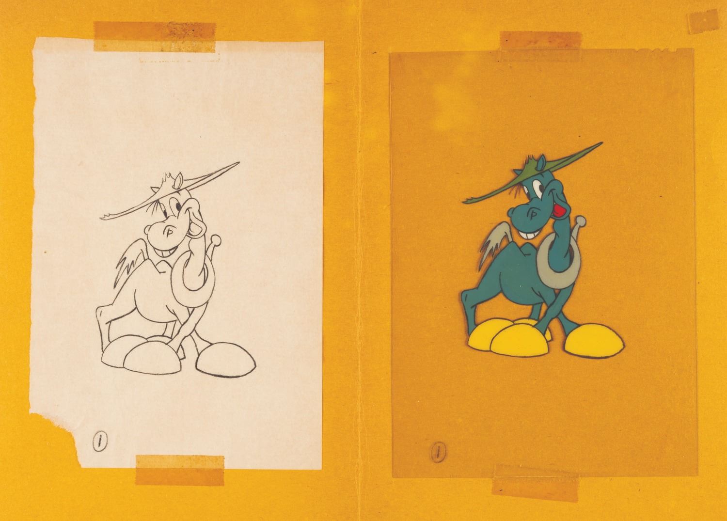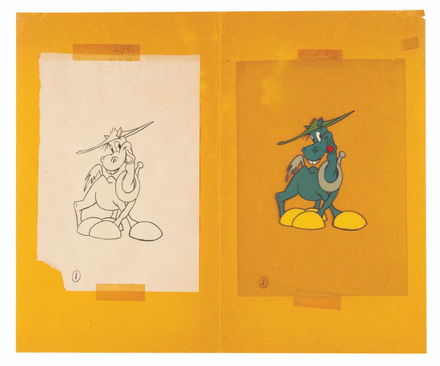 (Republic, 1960s-80s) A graphite drawing and hand-painted non-production cel of Charlie Horse, the star of the Republic short “It’s a Grand Old Nag.” With character images of 3” x 3.5” each on 4.75” x 7” animation paper and a 5” x 7” trimmed cel, both adhered to 10” x 12” backing paper, the piece is in good to very good condition with scratches, spots of paint loss, wear, and tears at the top corners of the drawing and backing paper from display.